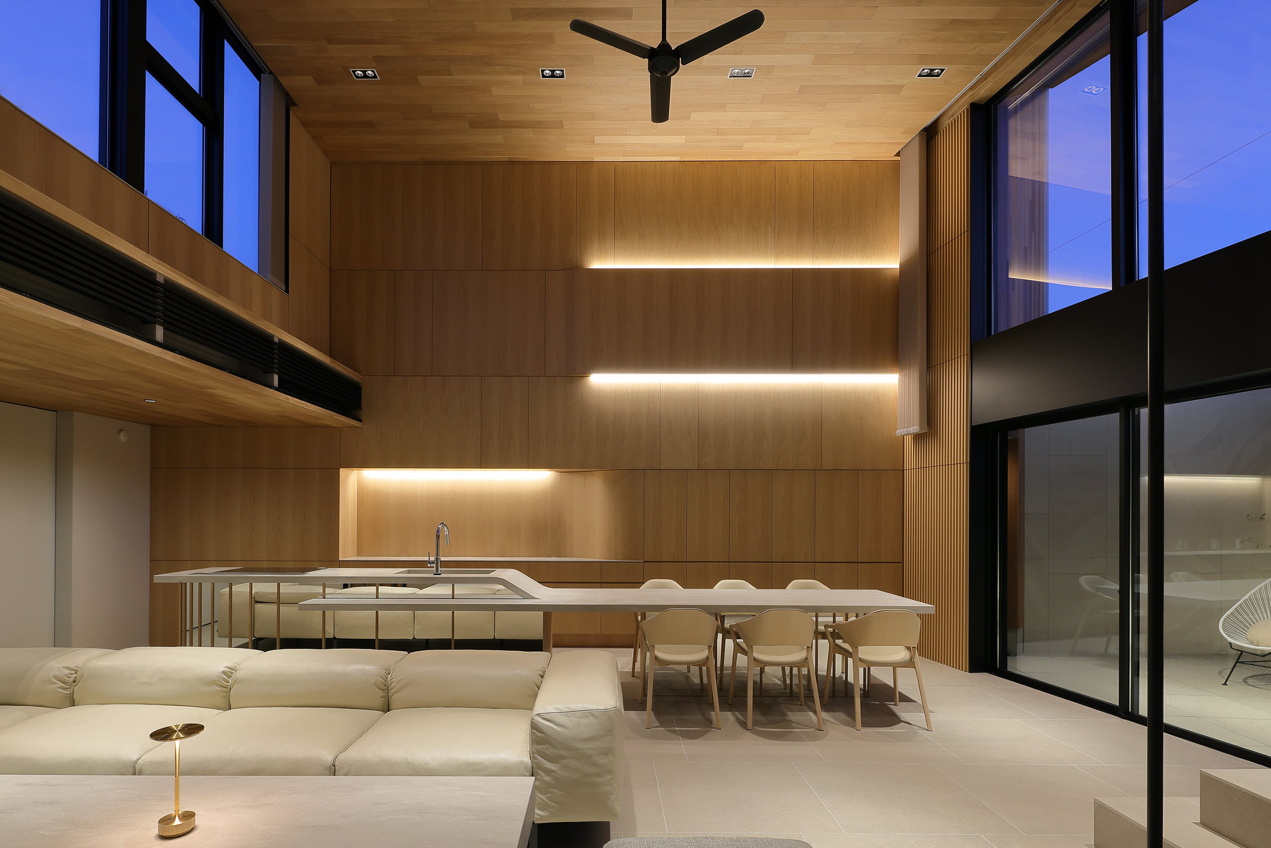 キッチンの背面は「壁」の一部をふかして間接照明を施工。