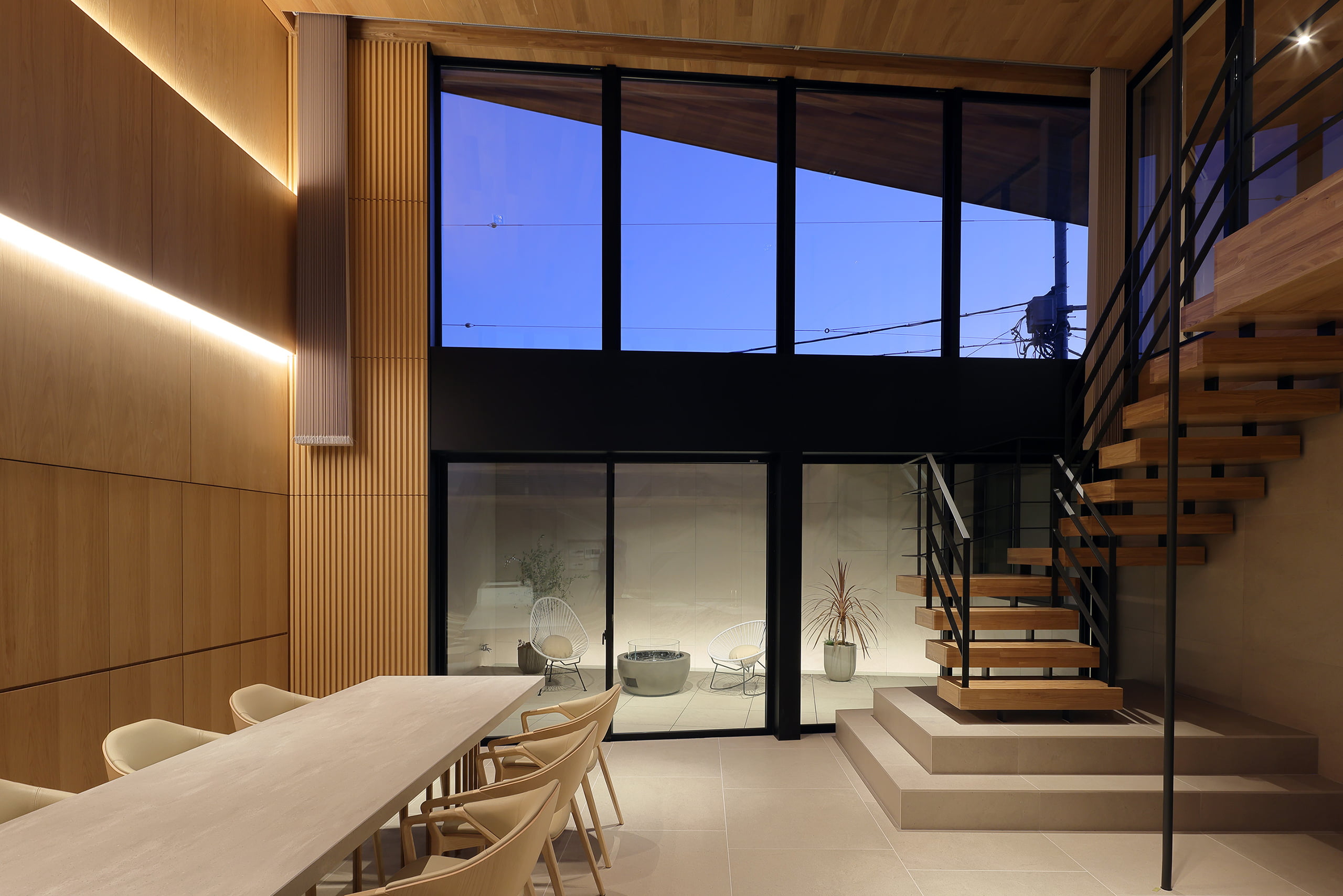 テラスは水盤に設置した間接照明で「水面と壁」を照らします。