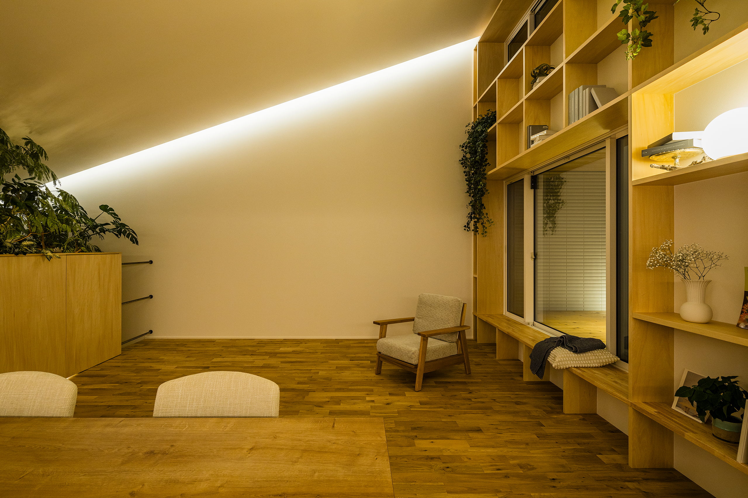 LDKには、傾斜天井の両サイドの「 際 」に沿って間接照明を設置。