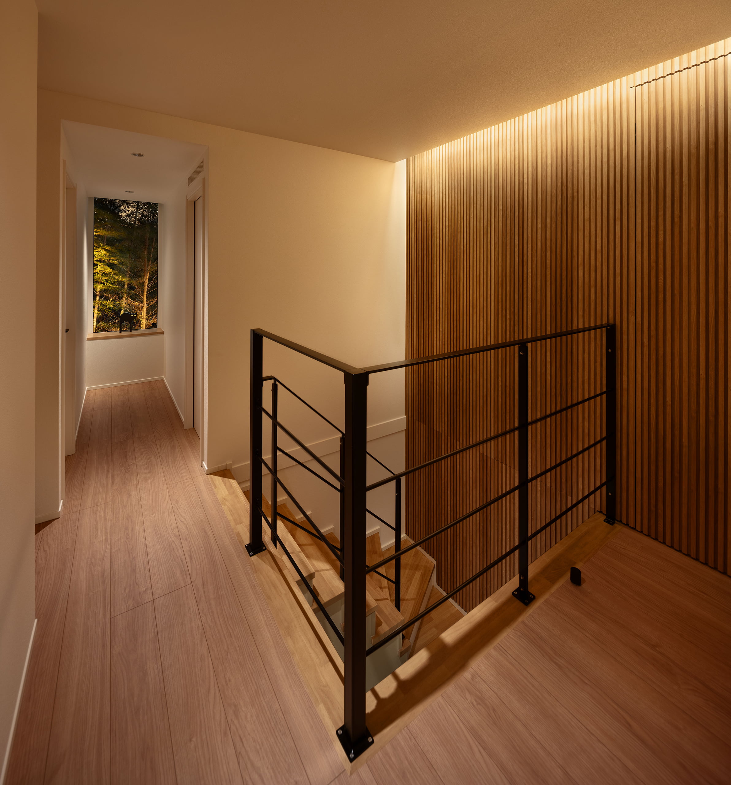 このモデルハウスは、各空間の特性に合わせて「陰影」に重きを置いた空間演出を提案している。