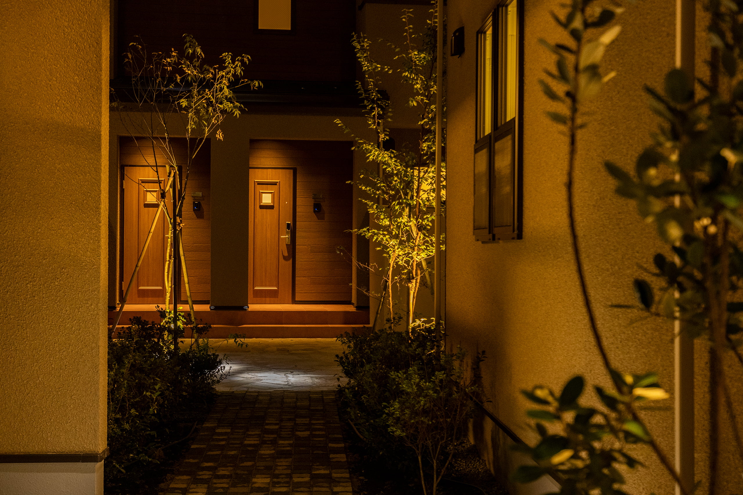 オーナー様への提案は、室内の照明計画をすべて温かみのある「電球色」に変更いただき、外構照明と室内の光色を統一していただきました。