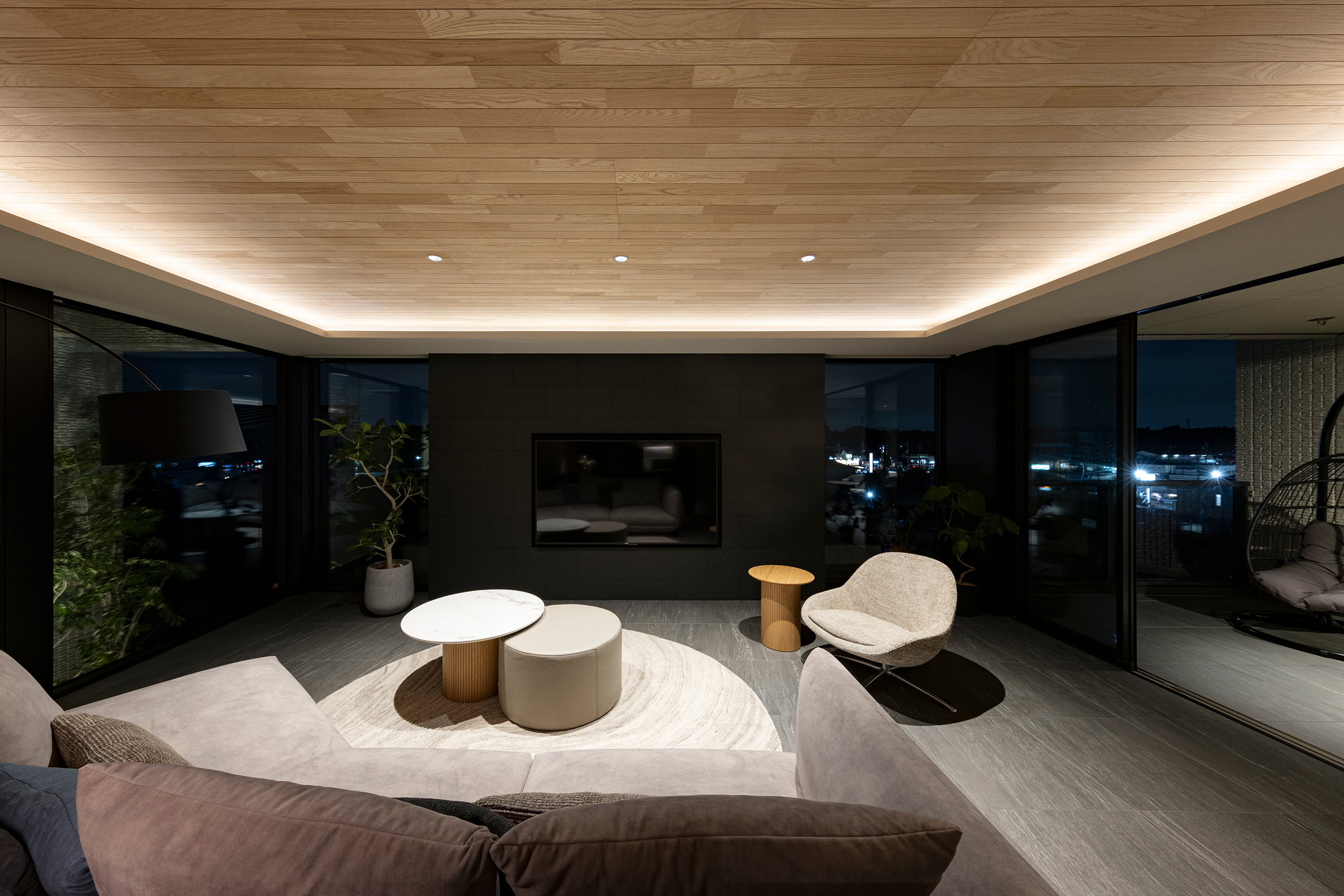 これにより見付けの部分がとても薄く見え、天井の重なりが軽やかに感じるデザインが実現しました。