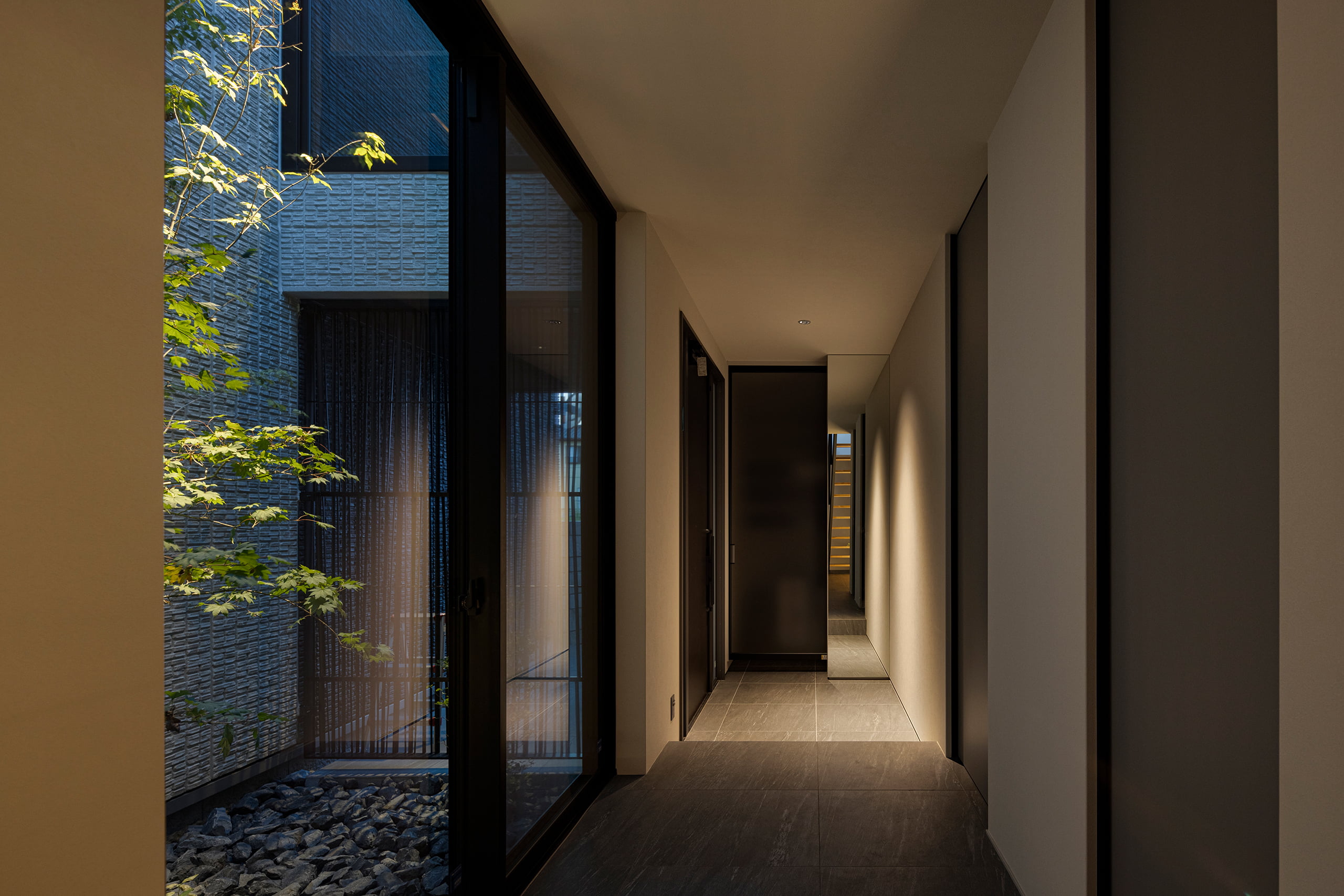 また、エントランスから階段へと続く導線には、床に上向きのライン照明を設置。空間のコーナー部分からあふれ出す光で、2階のメインフロアに向かっていく期待感が高まります。