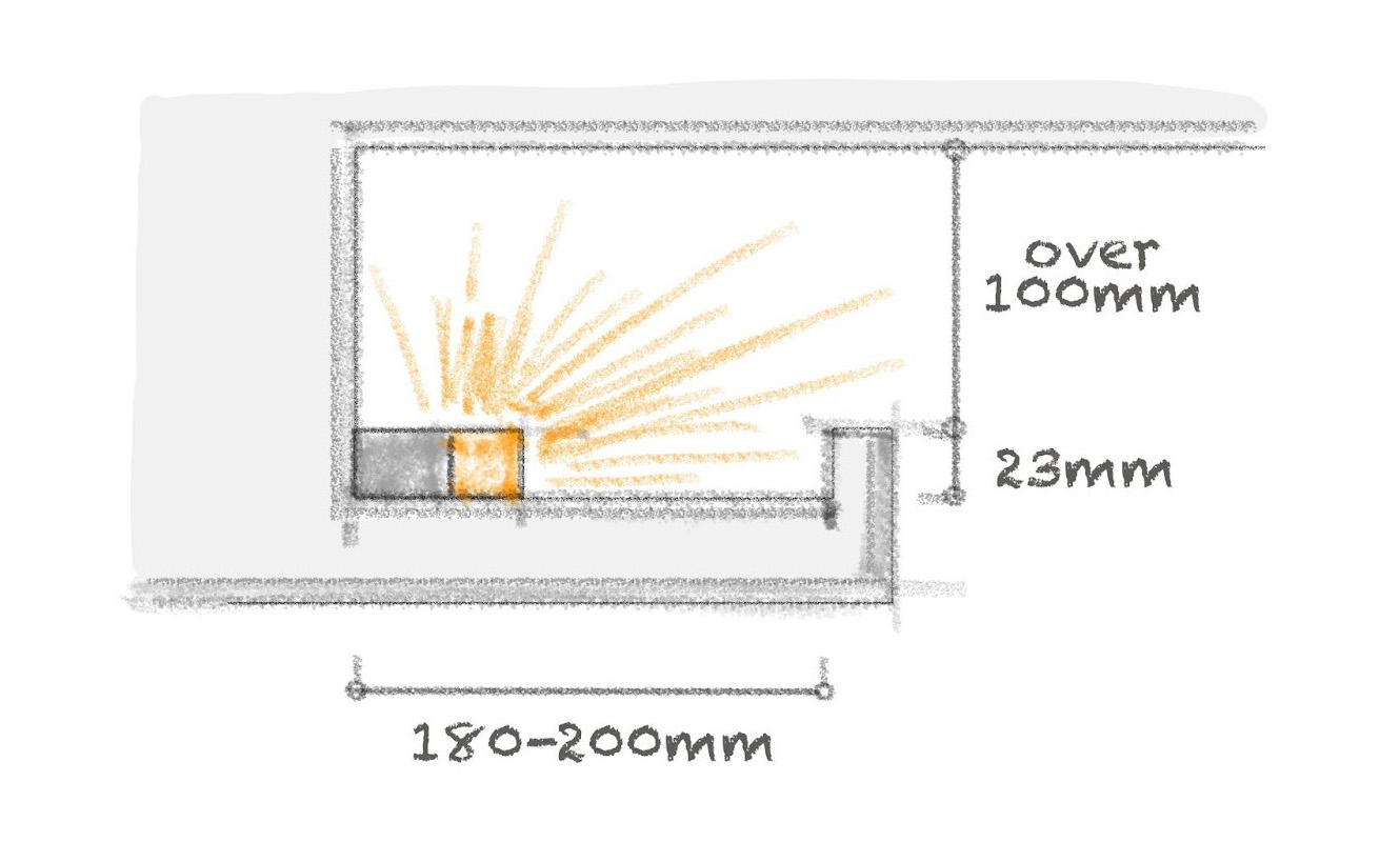 その眺望を邪魔しないよう工夫したのが空間全体にレイアウトされたコーブ照明。下げた天井の圧迫感を感じさせないように、「アーキテクトベースライン ミニ」を寝かせた状態にしてアゴの高さを極力ミニマムに抑えています。