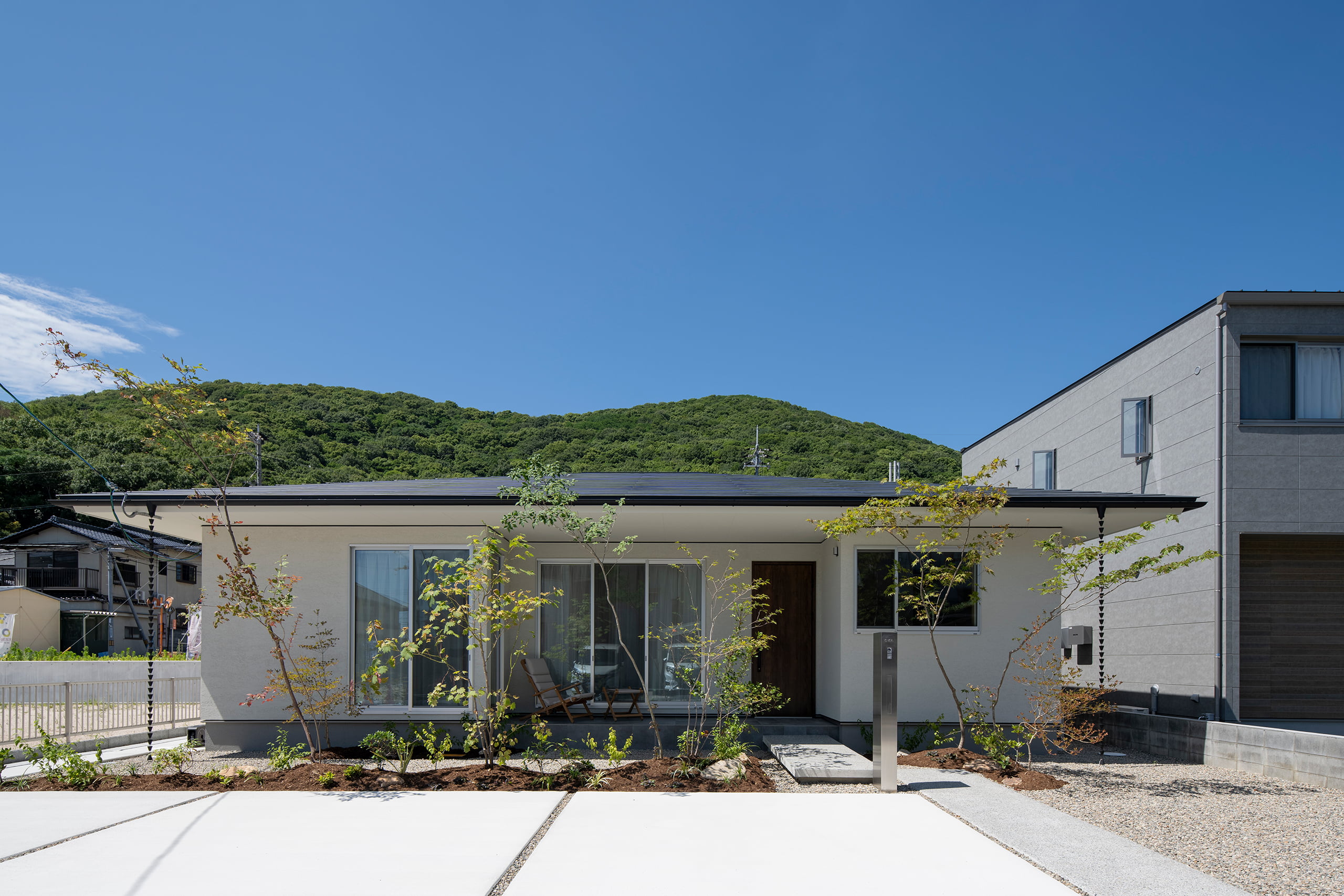 寄棟屋根をもつ平屋の家。