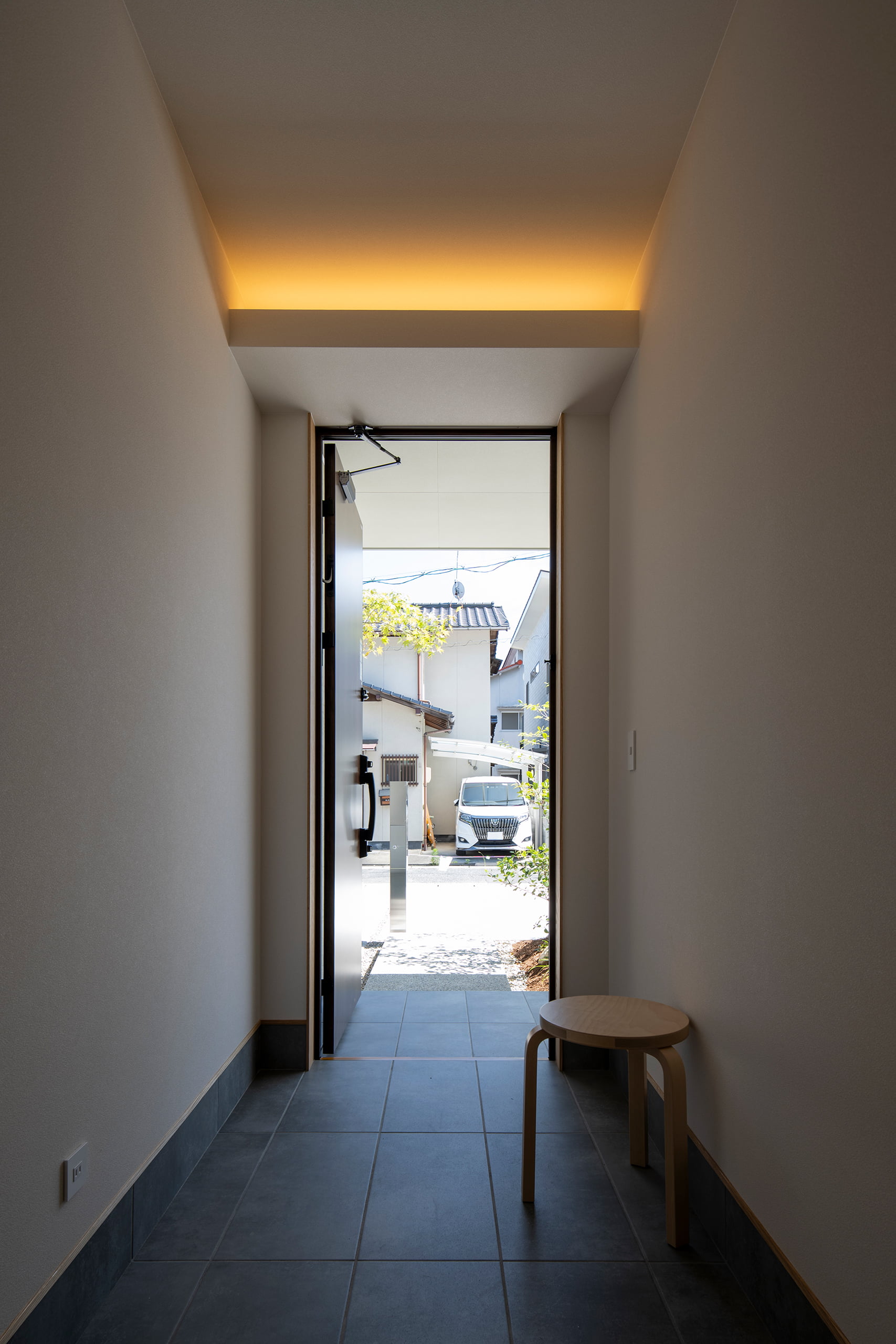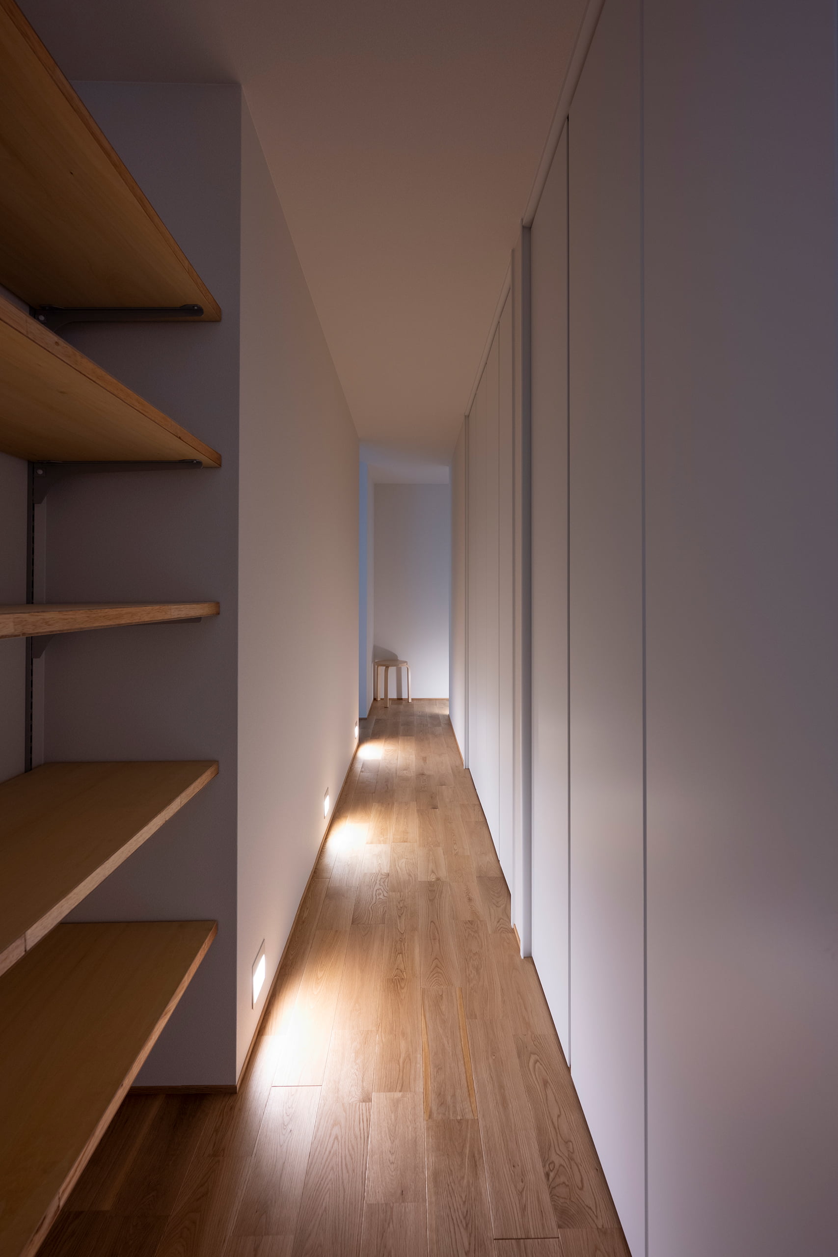 通路には、必要最小限の60W相当の足元灯のみを配置。