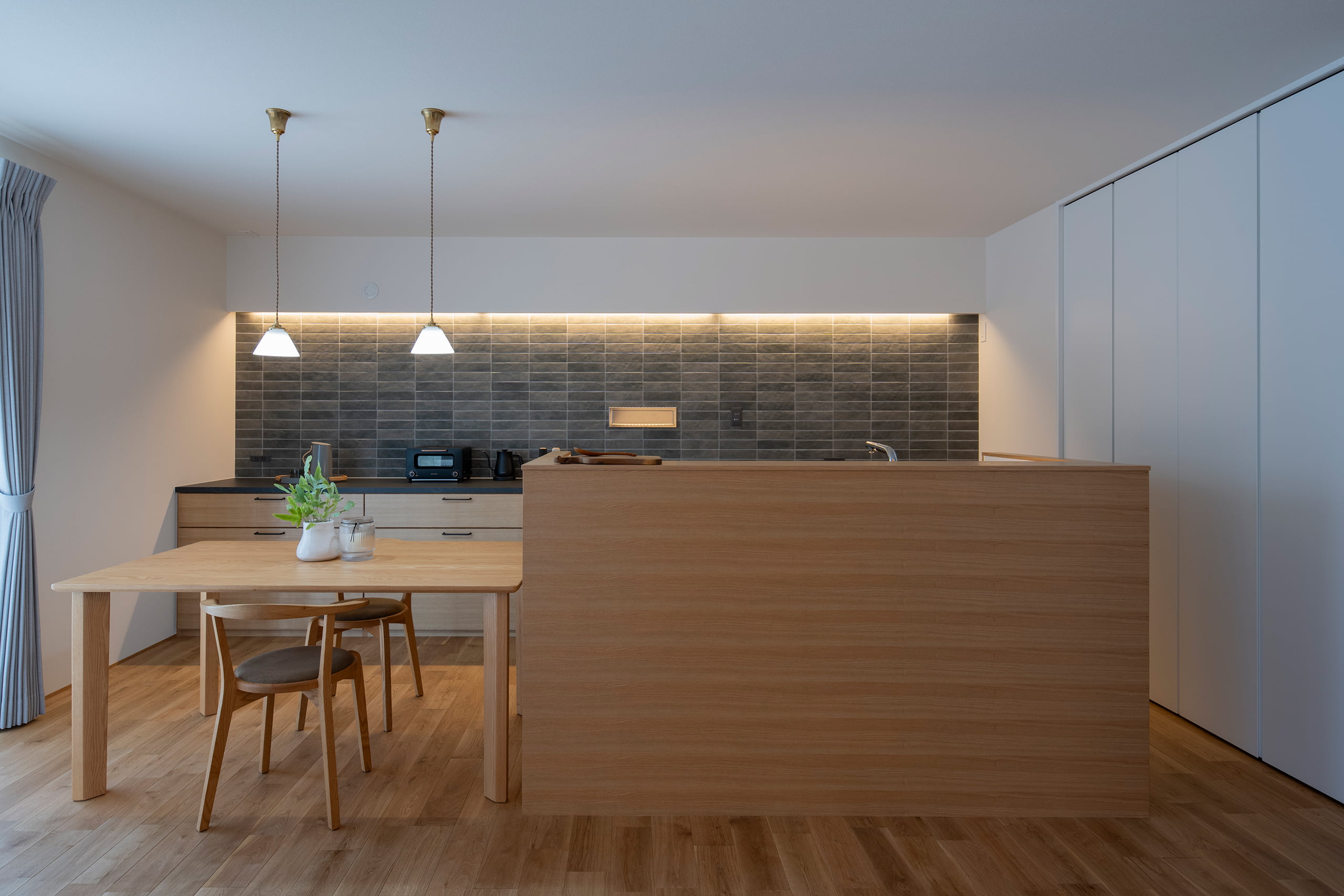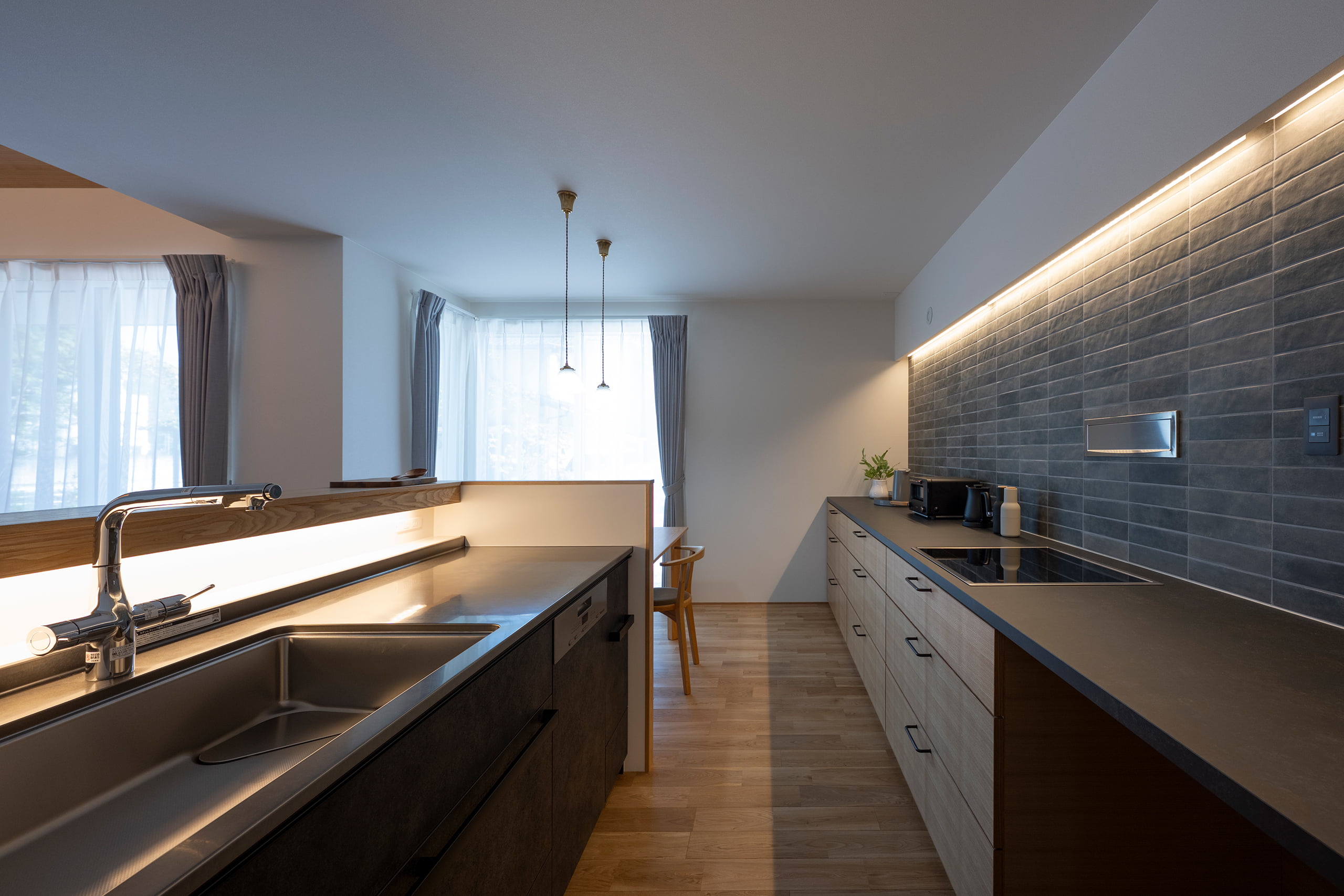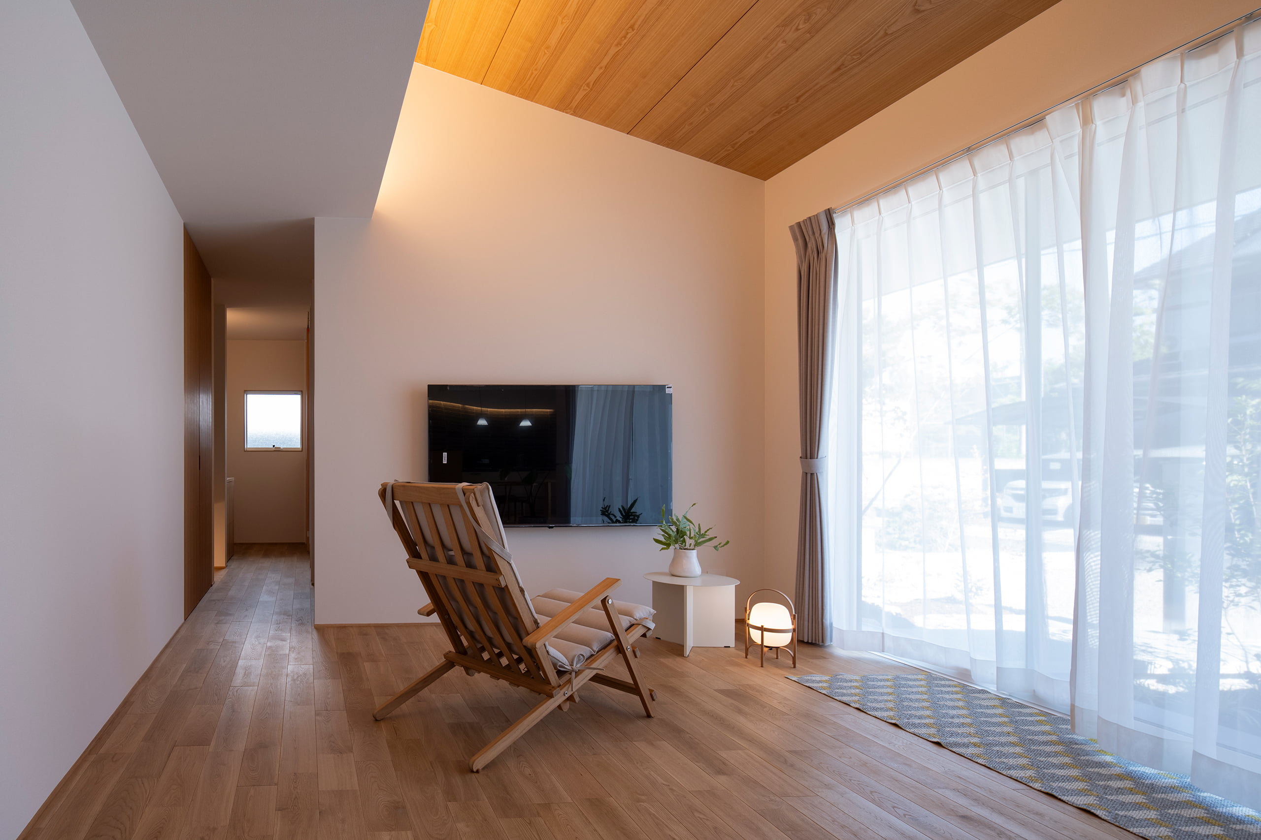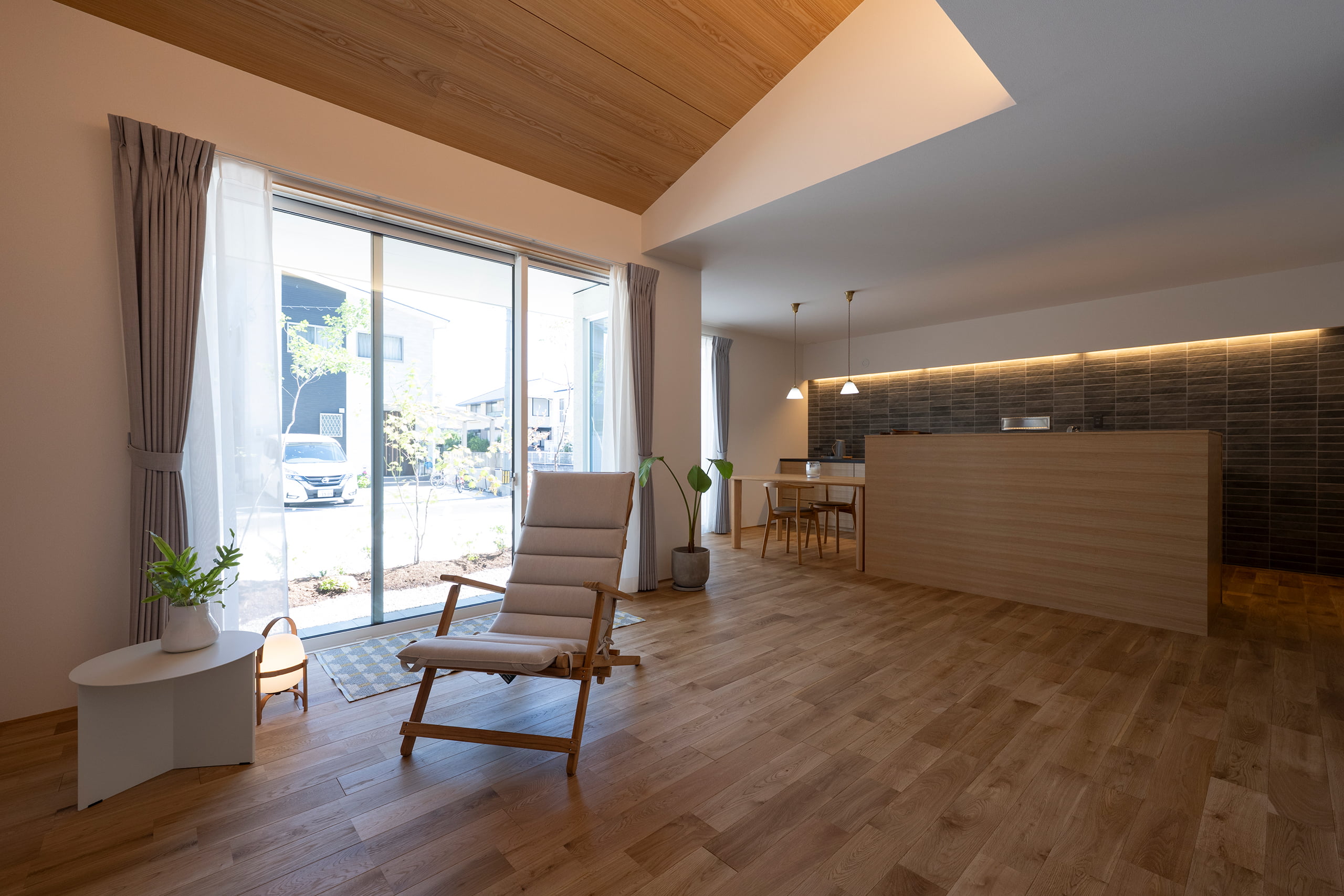 今回は設計者との綿密な打合せを重ね、片流れ天井の範囲に限定して間接照明を設置。