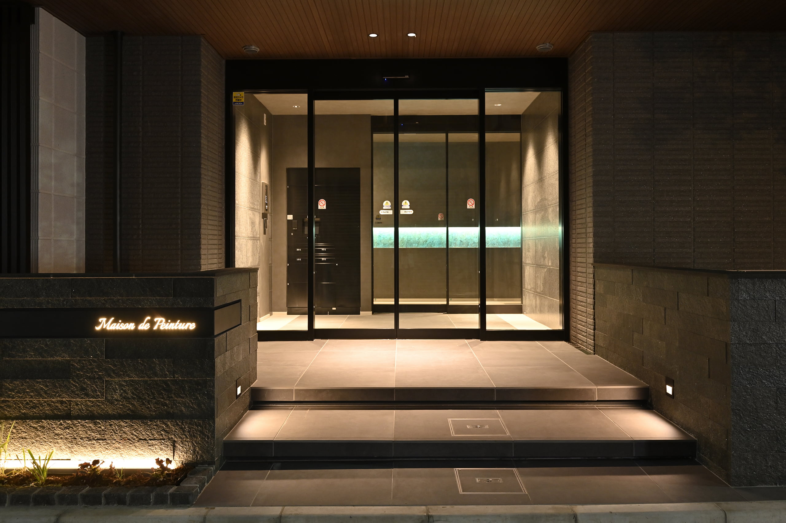 エントランスにはグレアレスダウンライトや遮光版付きの器具を採用し、周辺住宅への光害を抑えつつ、明るさと光の広がりを繊細にコントロールしました。