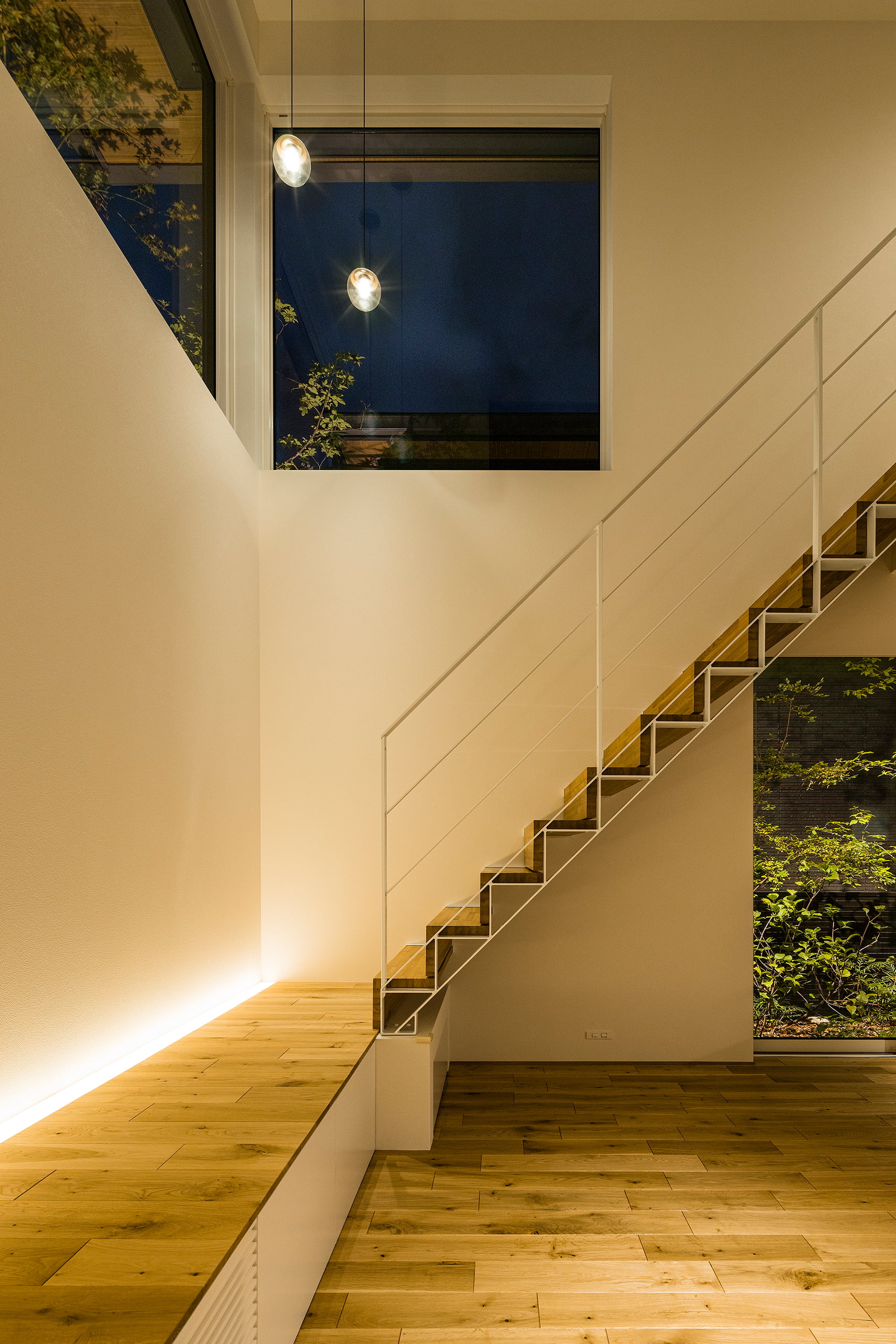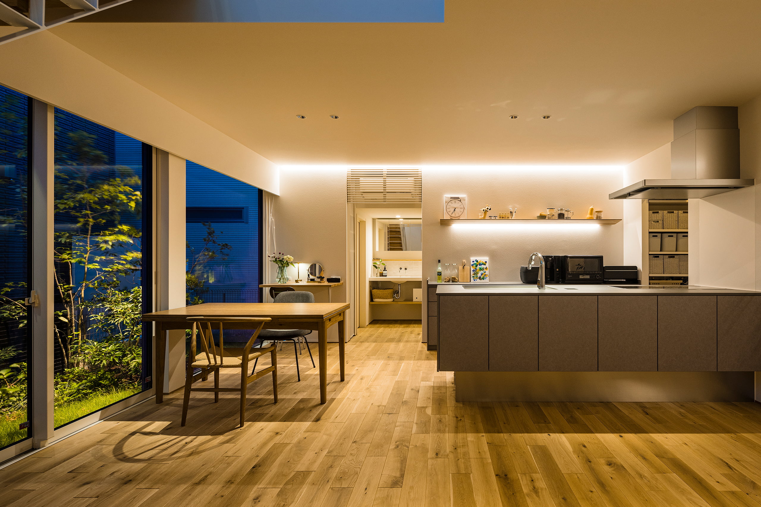 庭の緑とペンダントの輝きが浮かび上がり、景色を彩ります。
