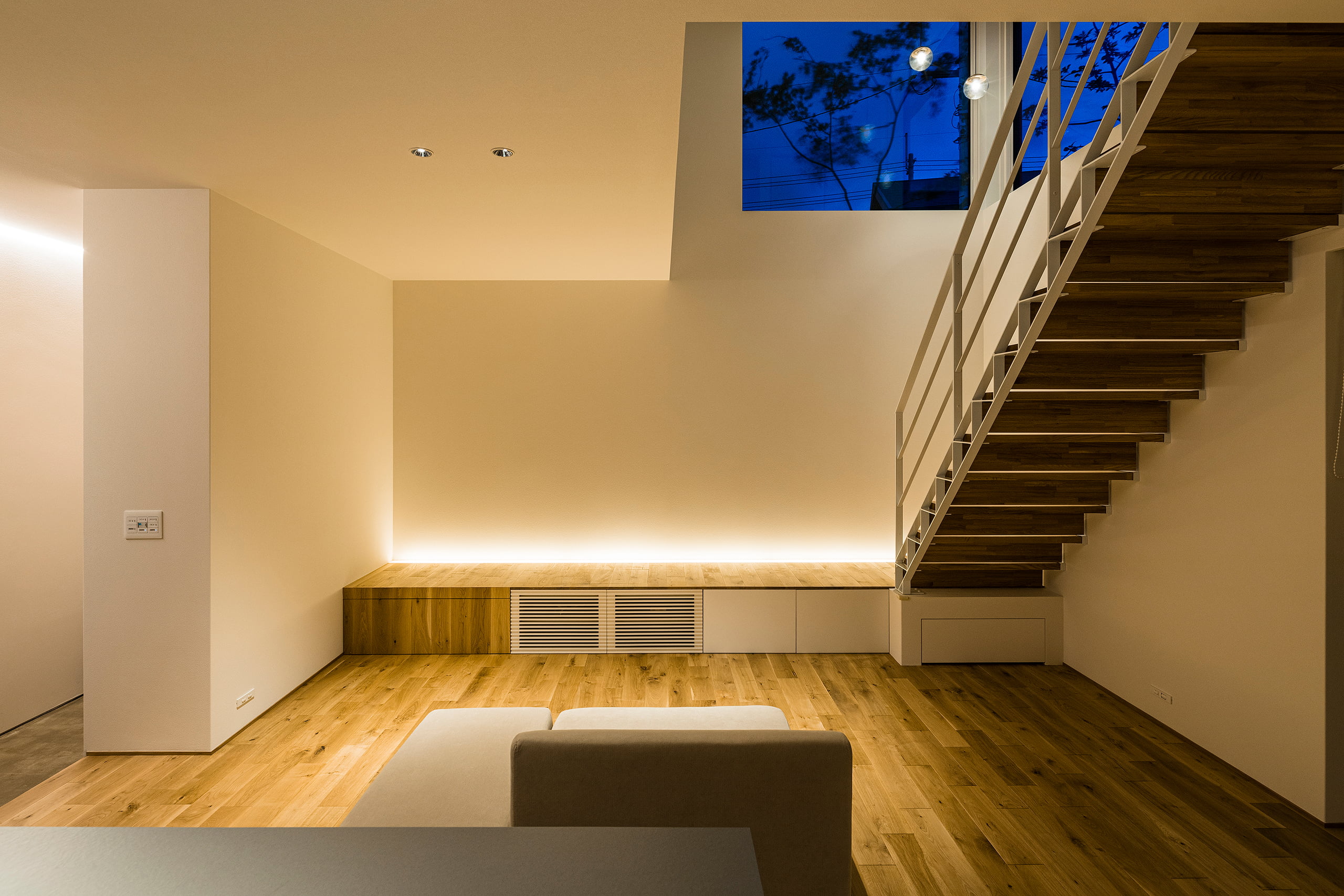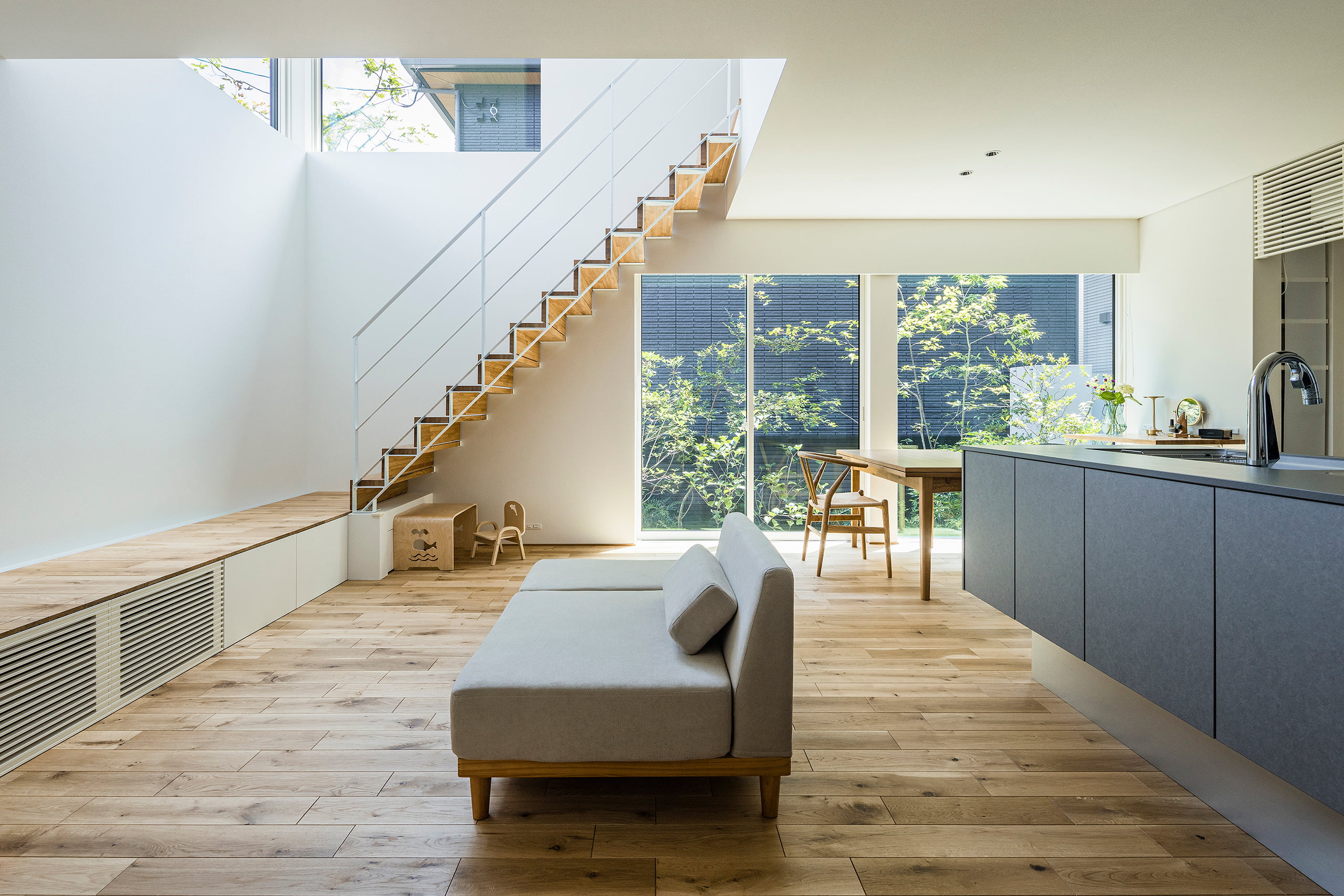 オークを基調としたナチュラルなインテリアのオープンリビングの住宅。