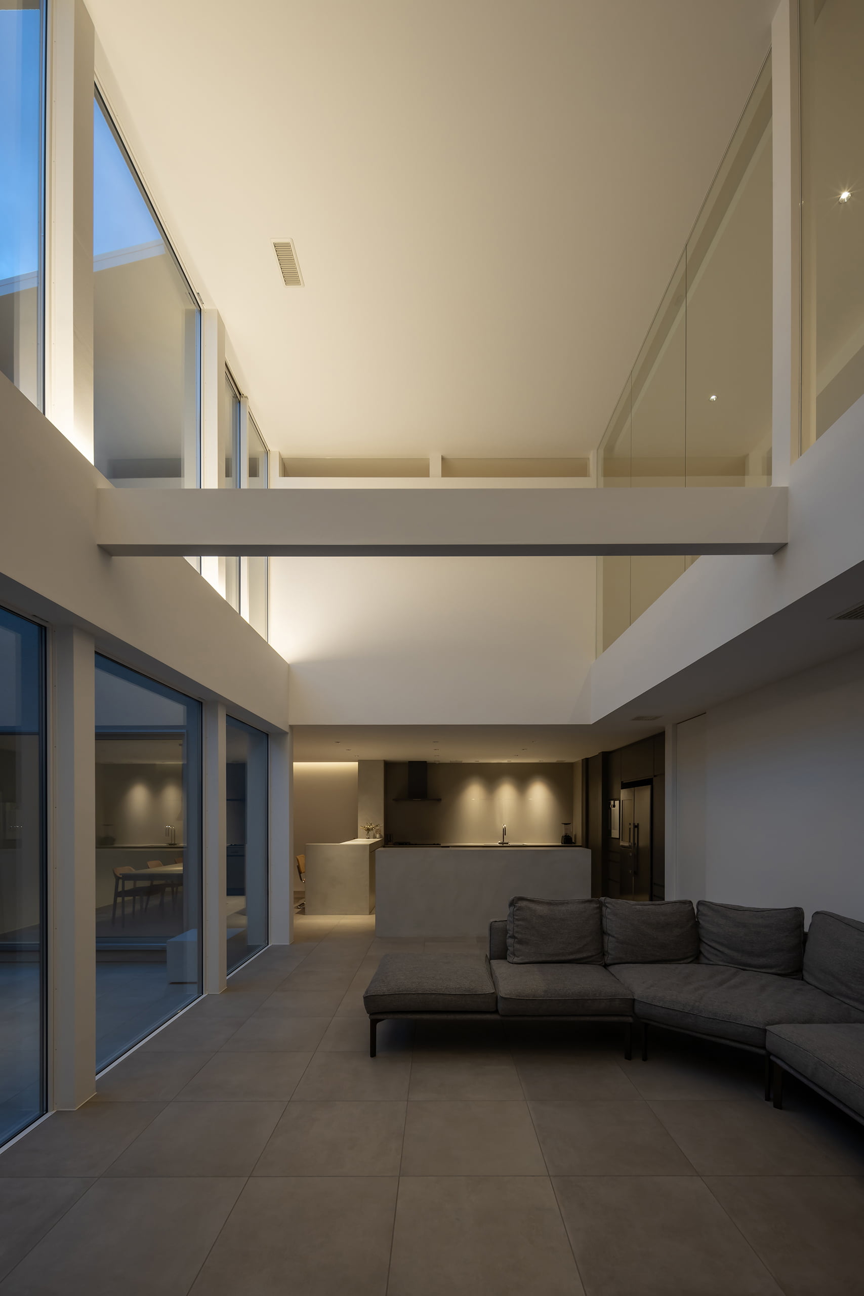 リビングの吹抜けは、大胆にアッパー間接照明のみ。