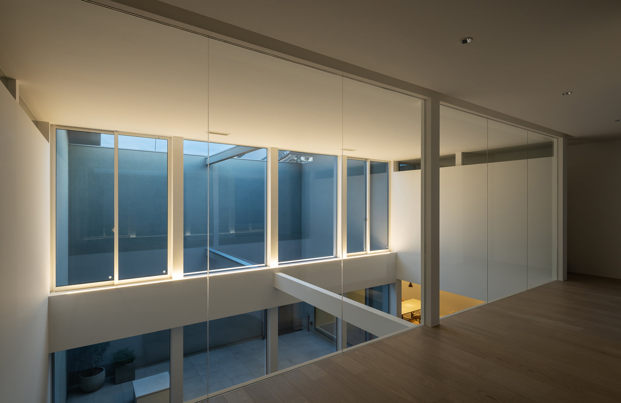 吹抜けの際にスリムなライン照明をロの字型に設置。