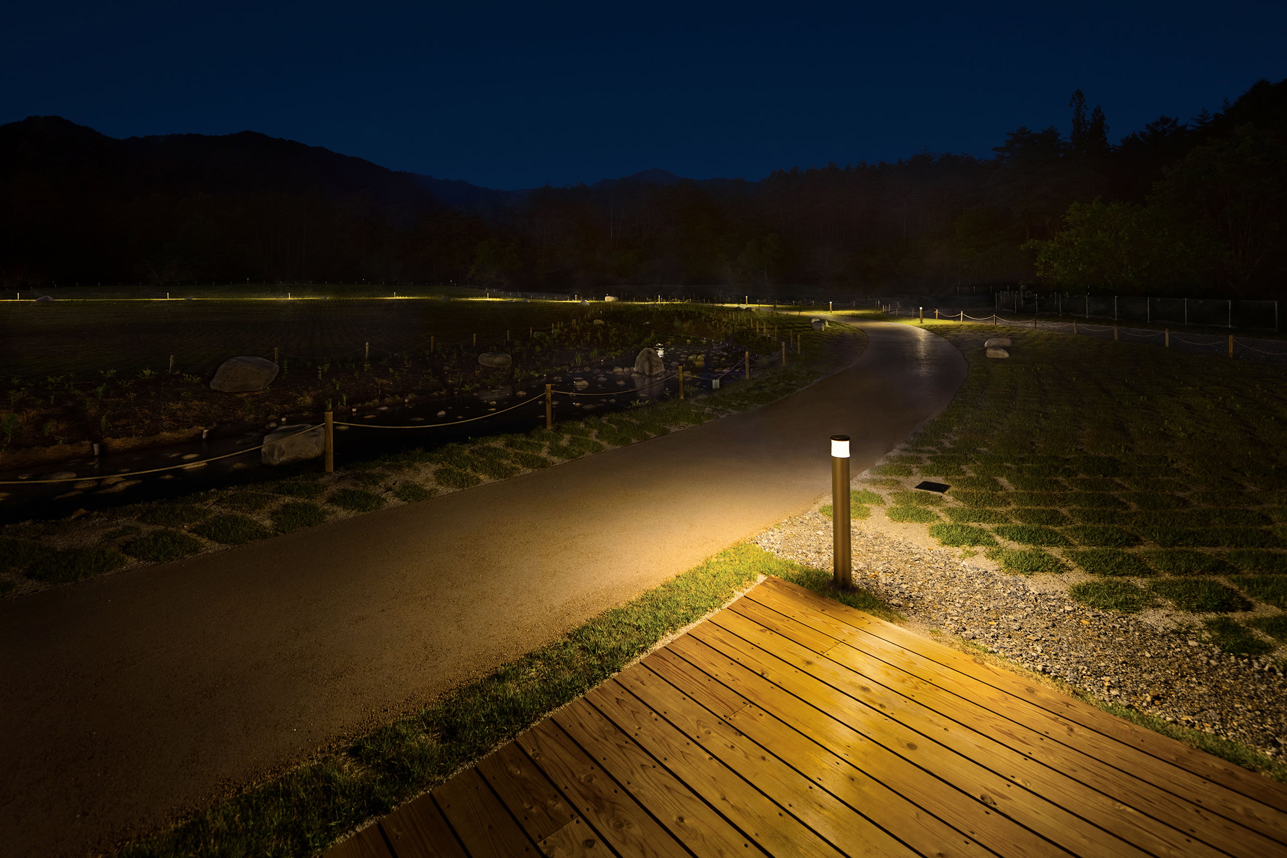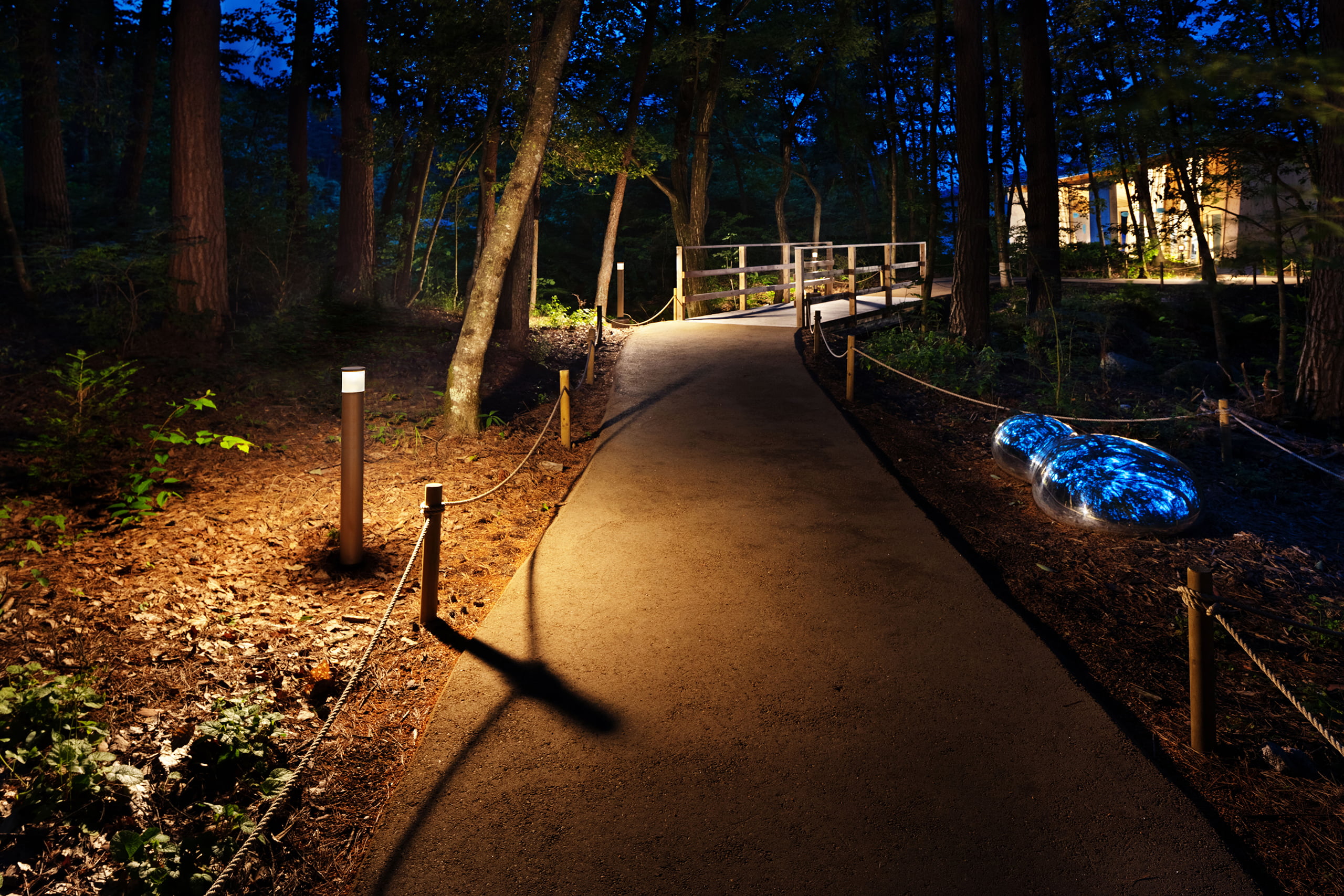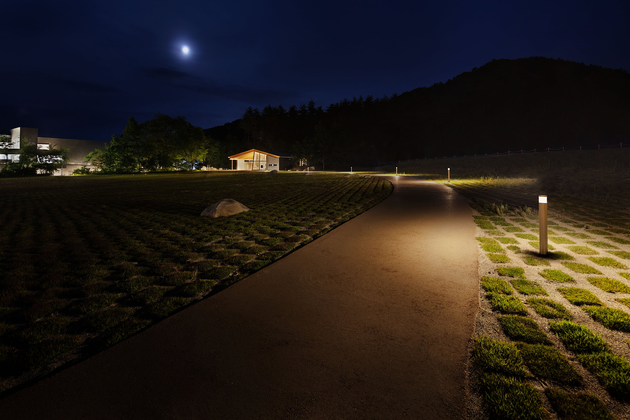 豊かな自然に囲まれた北アルプスのふもとにある天然水の工場。ブランド体感型施設として自然の魅力が感じられる遊歩道や広場、展示棟などがあり、来場者が自然を眺めながら自由に過ごすことができる。寒冷地でもある長野県に立地する施設であり、冬場の積雪や温度差など厳しい環境下でも充分な耐候性を持つZEROの器具を中心に照明を配置している。