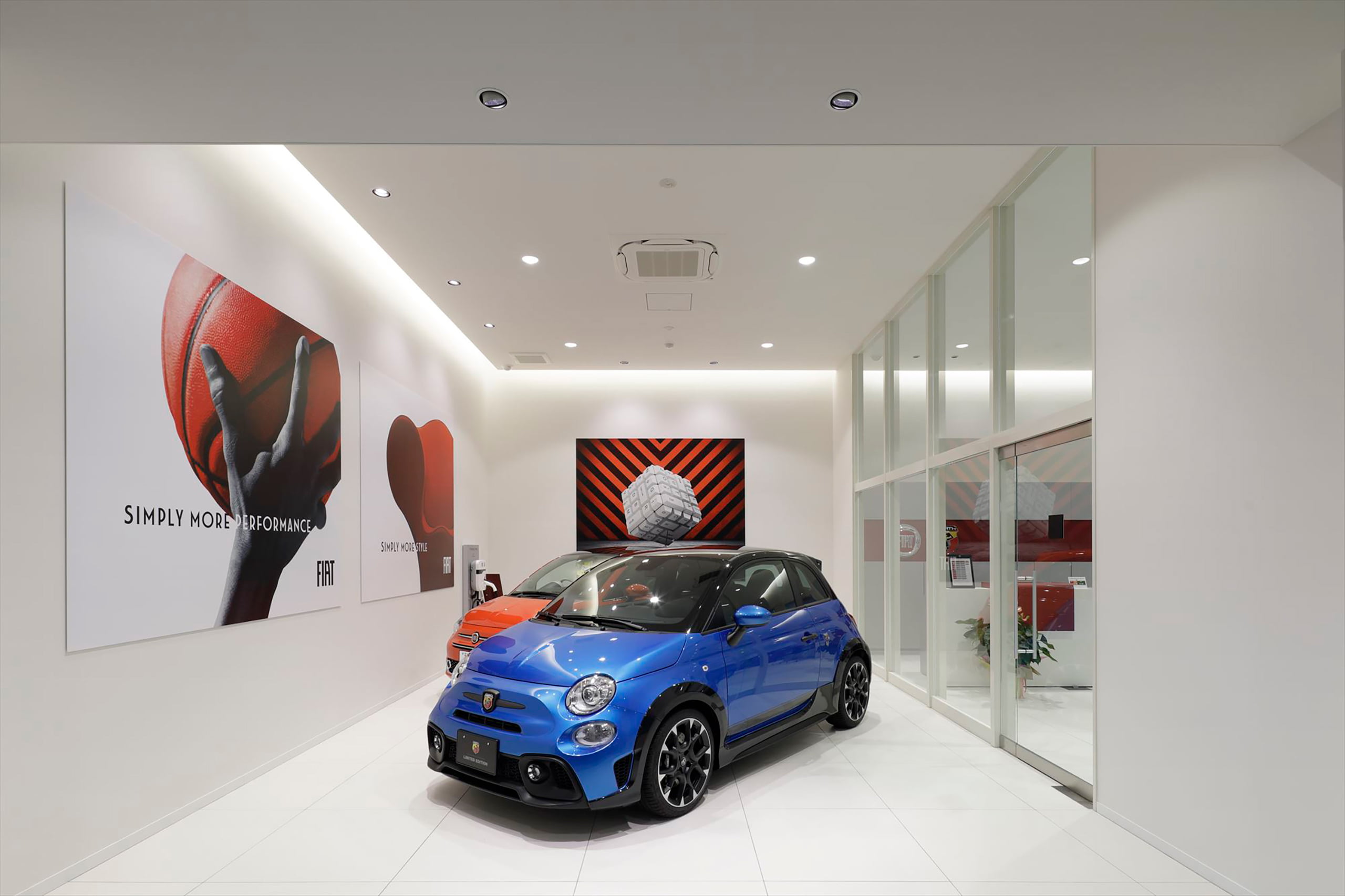 ショールームの中で輸入車とその壁面を彩るグラフィックをピックアップさせている。