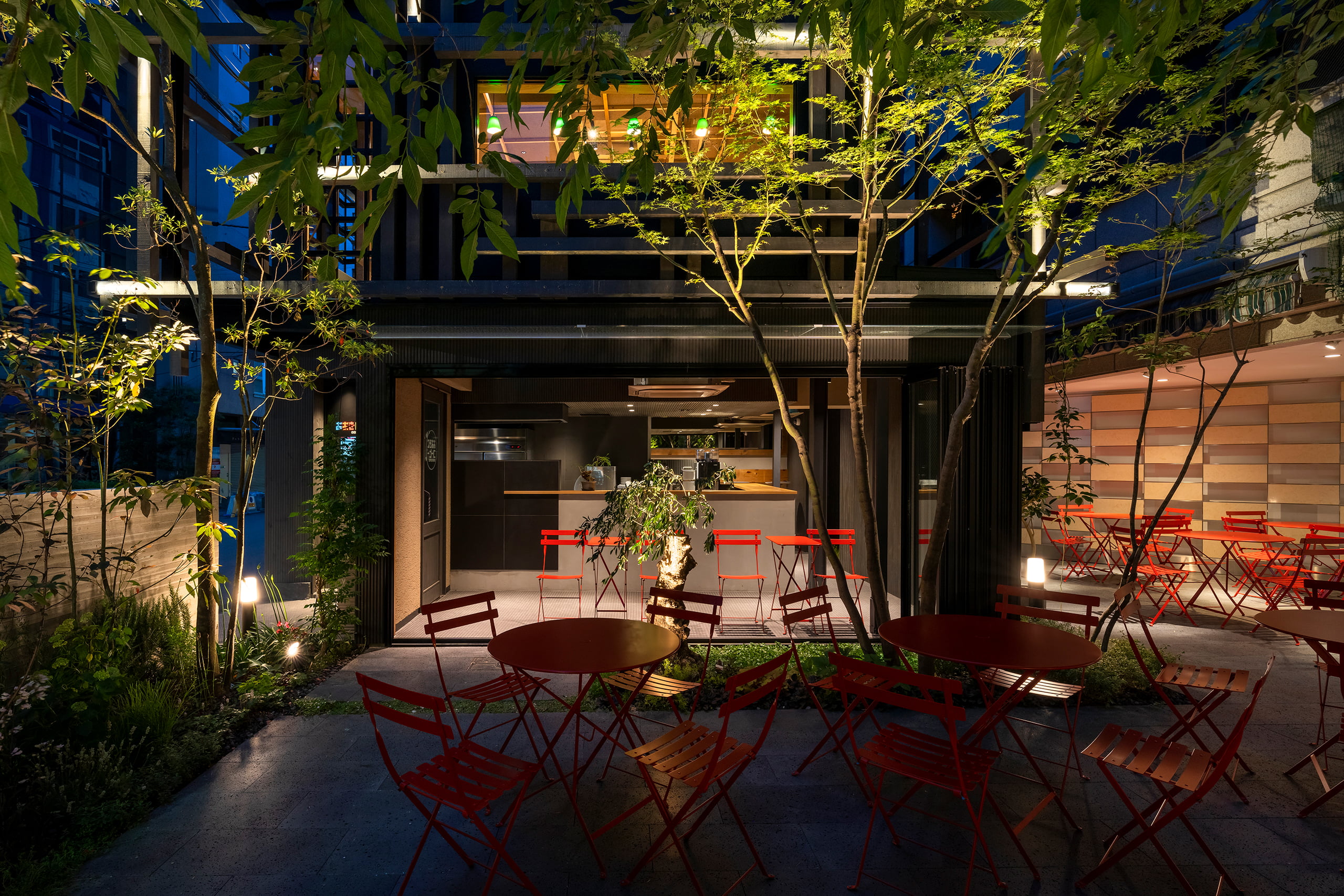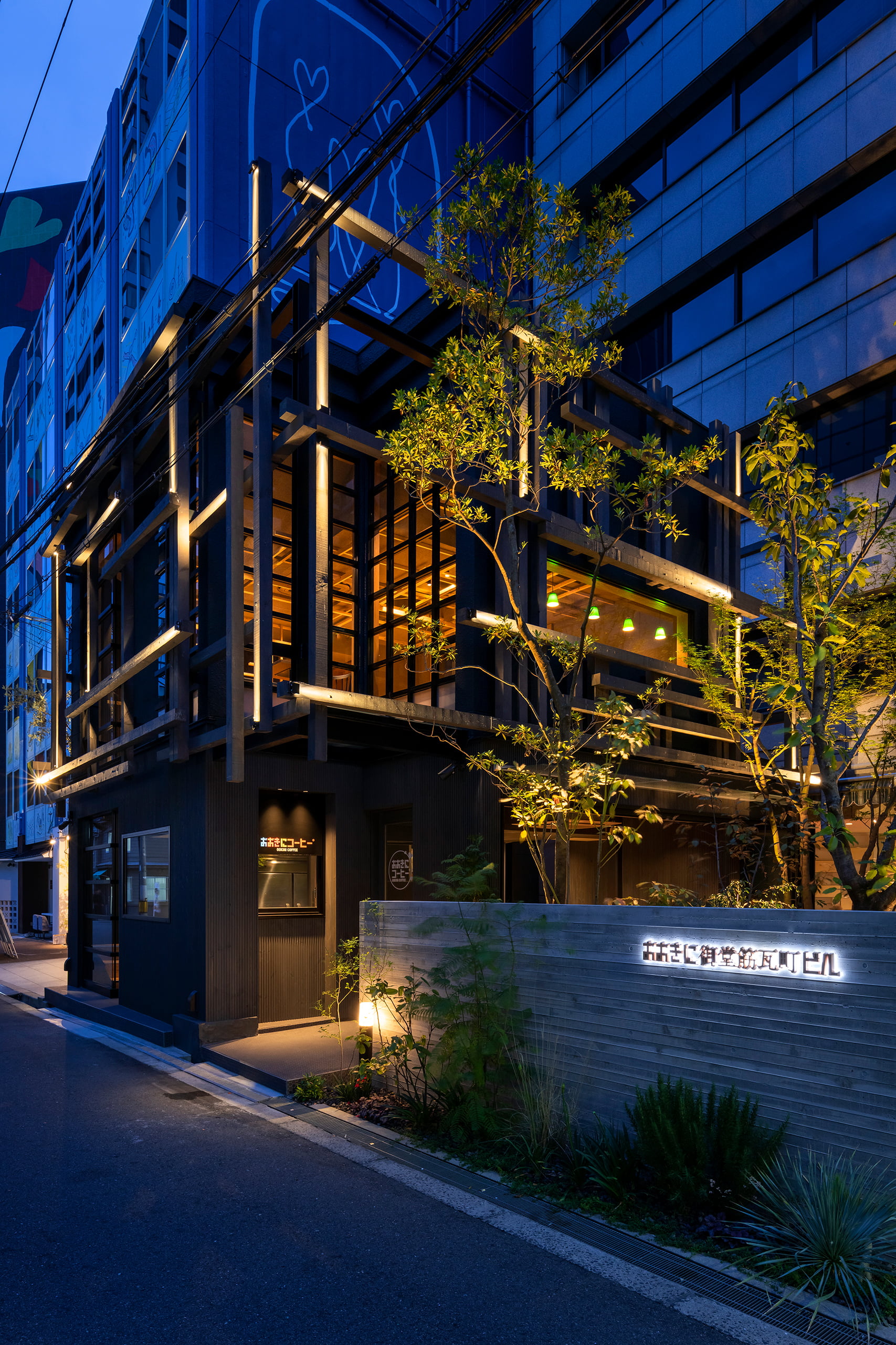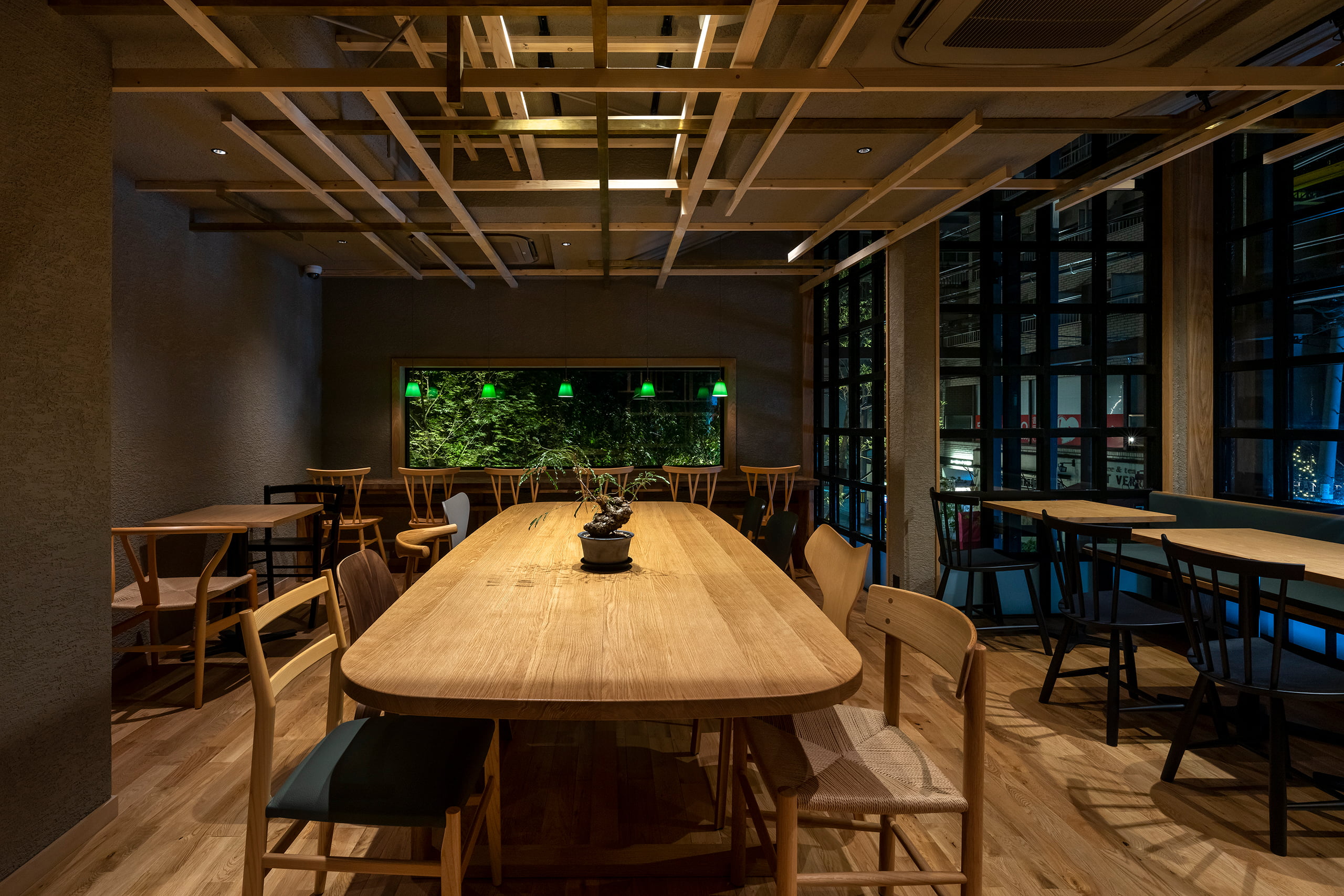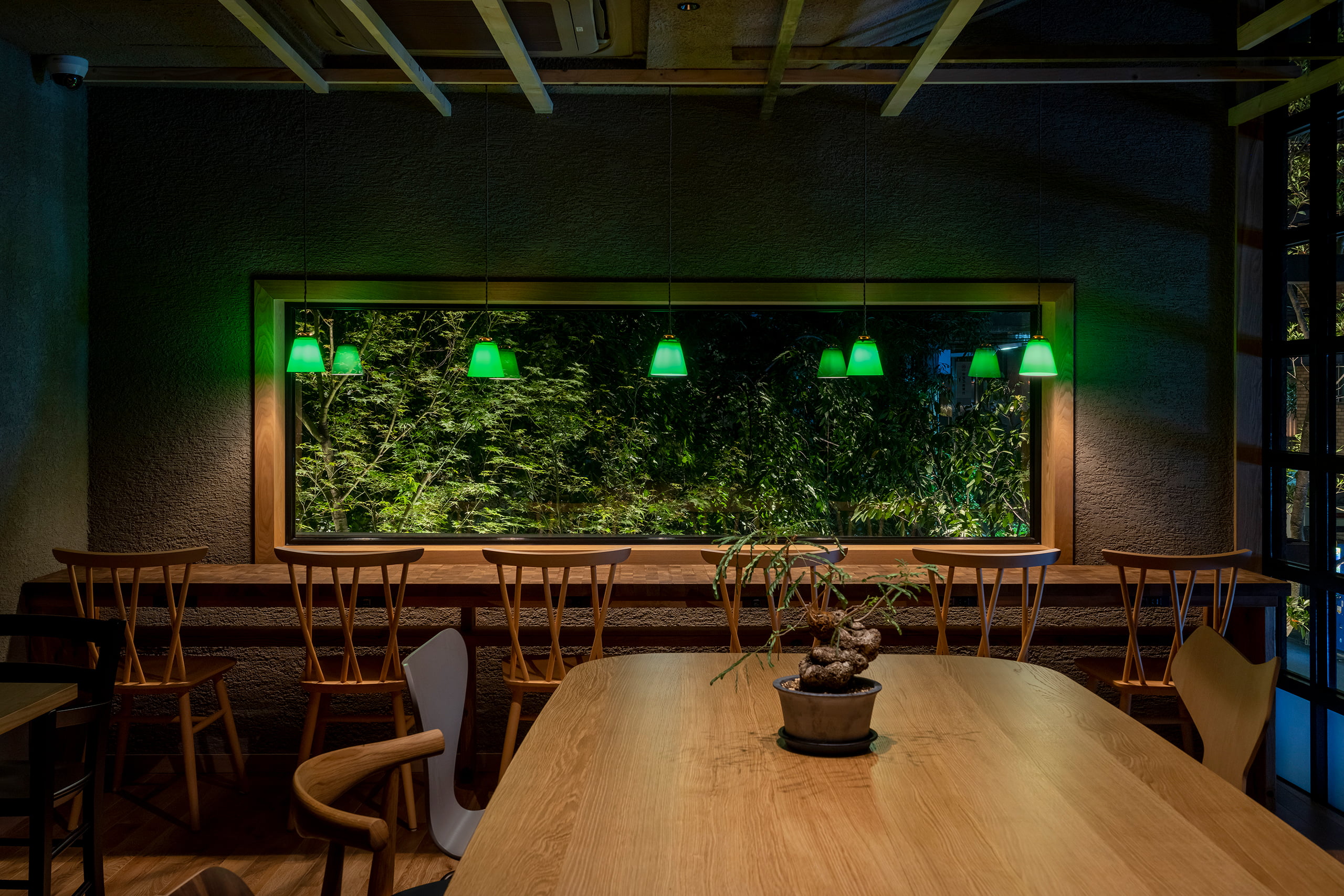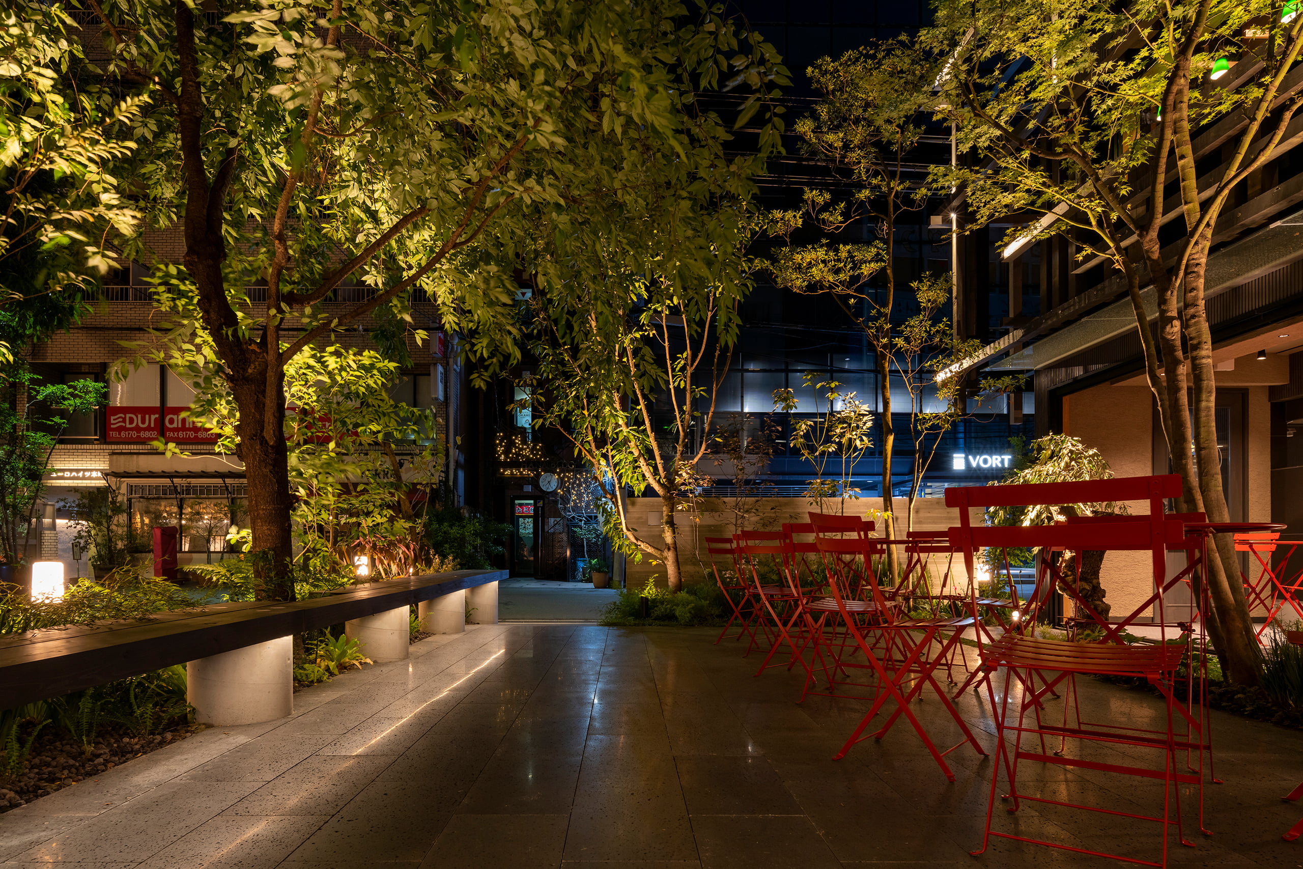 それに応える照明計画として、小型の挟角配光スポットで木材と建築の輪郭を浮かび上がらせ、通りすがりの人々の目に留まる、インスタレーション作品のような印象的なライティングを目指した。
