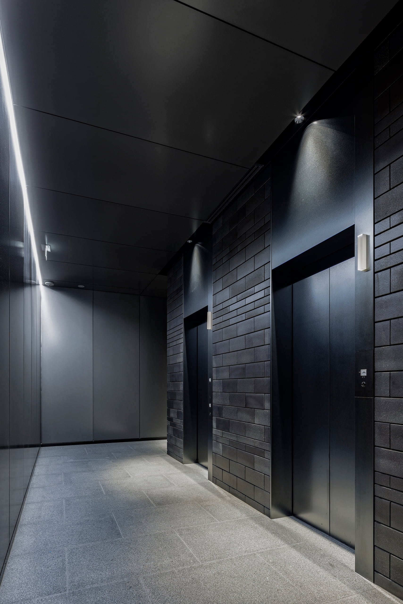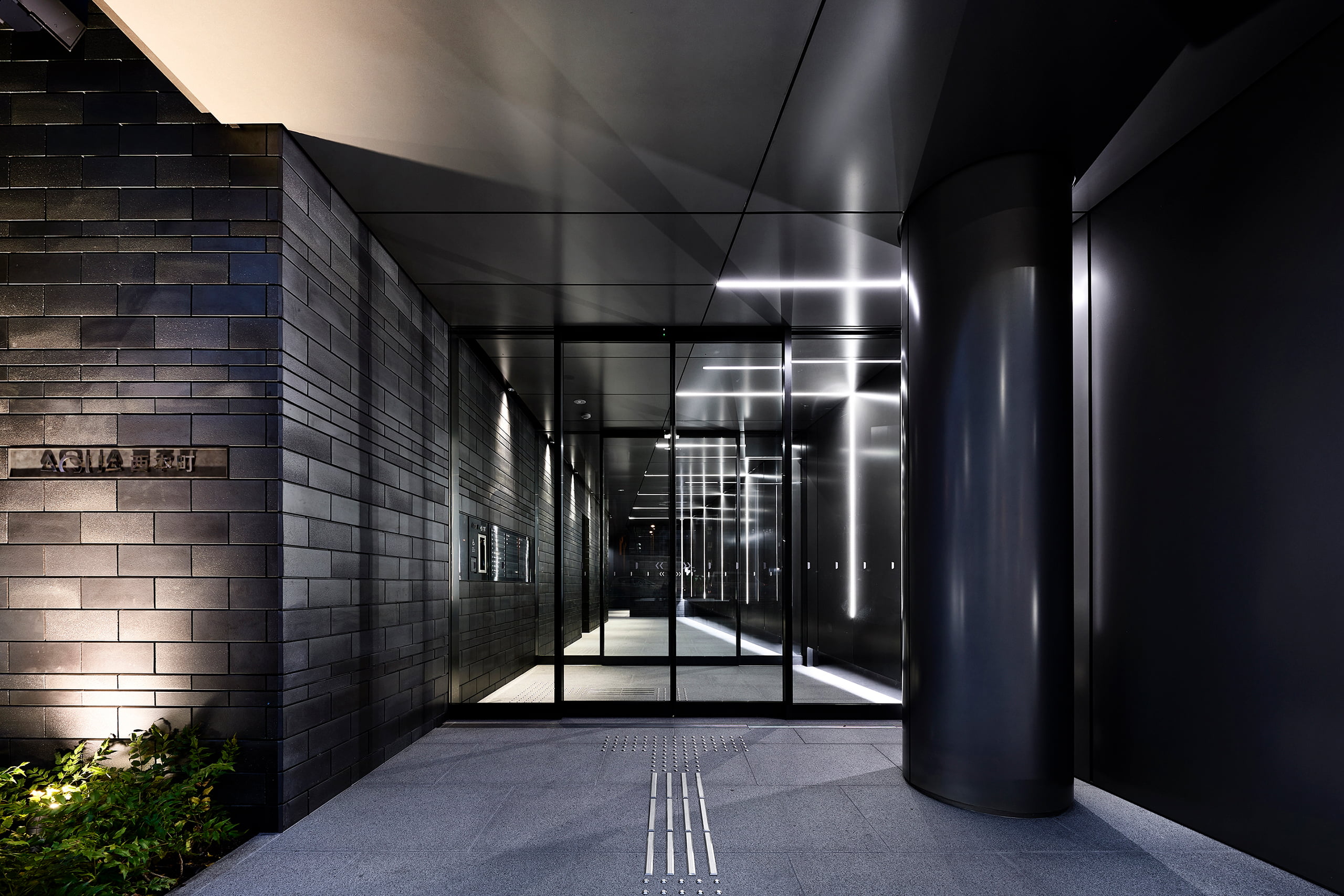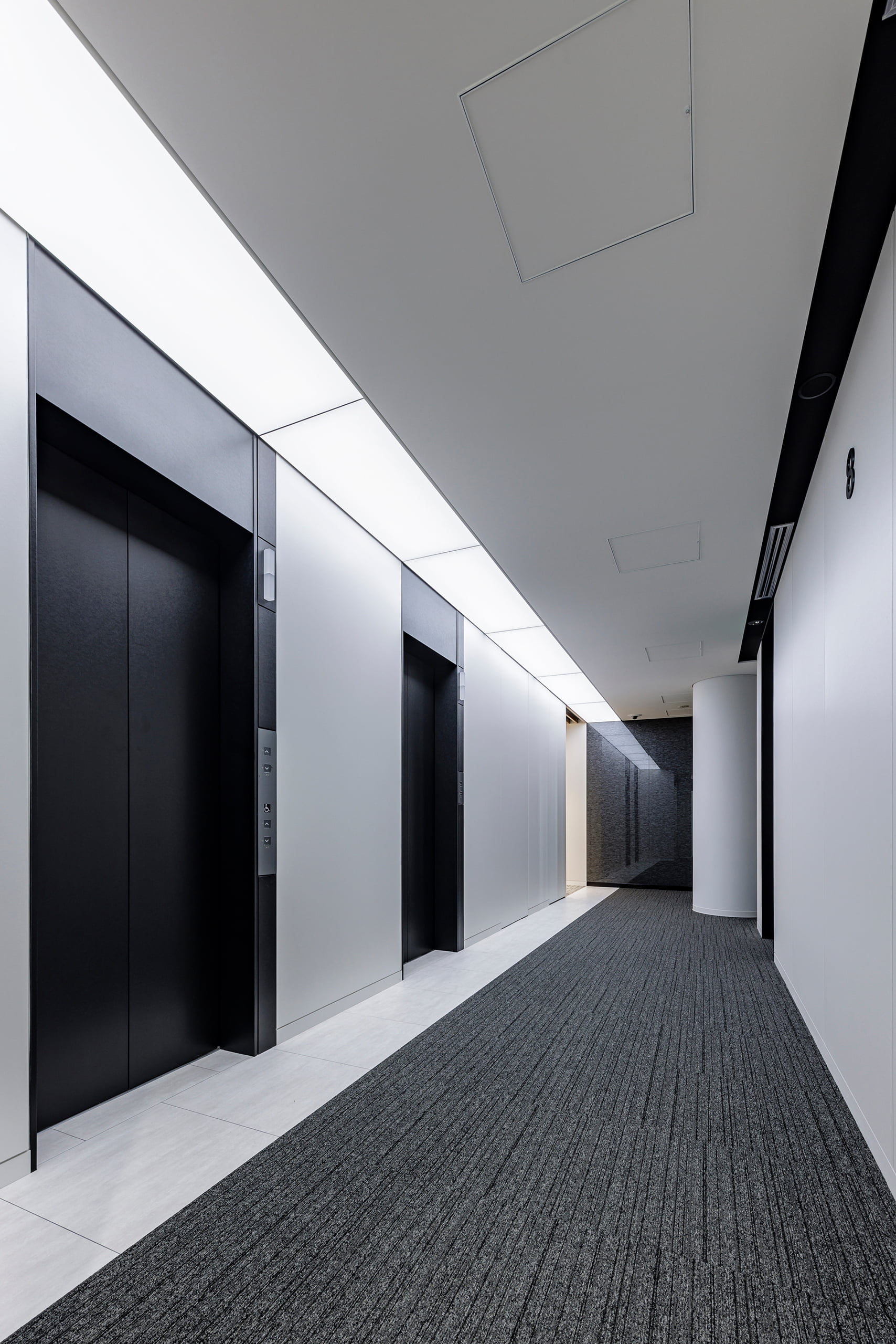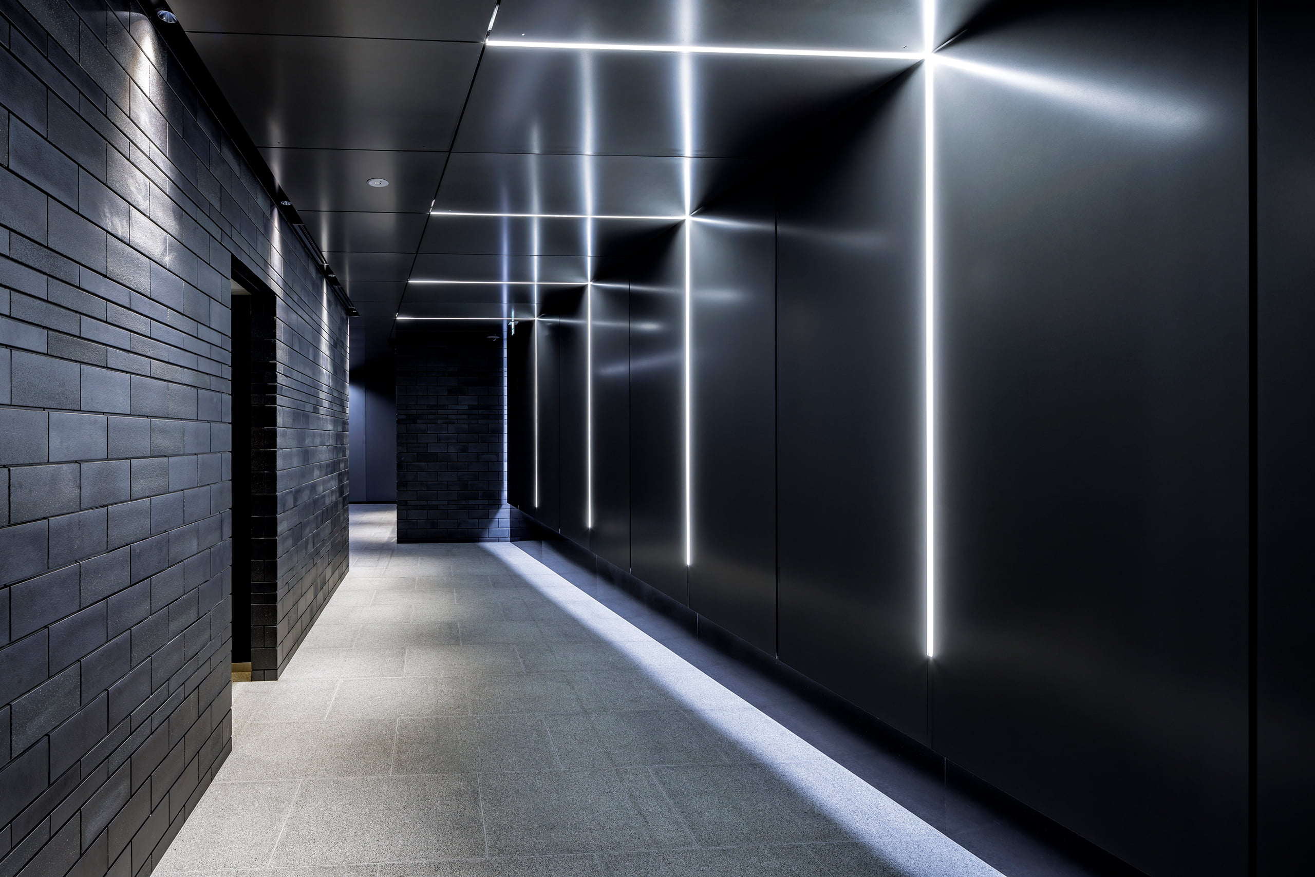 エントランスからEVホールにかけてはタイルと斜めに貫⼊する⾦属パネルで構成し、連続するL字のライン照明を埋込み、硬質で都市的な内へと引き込む線的なデザインとした。