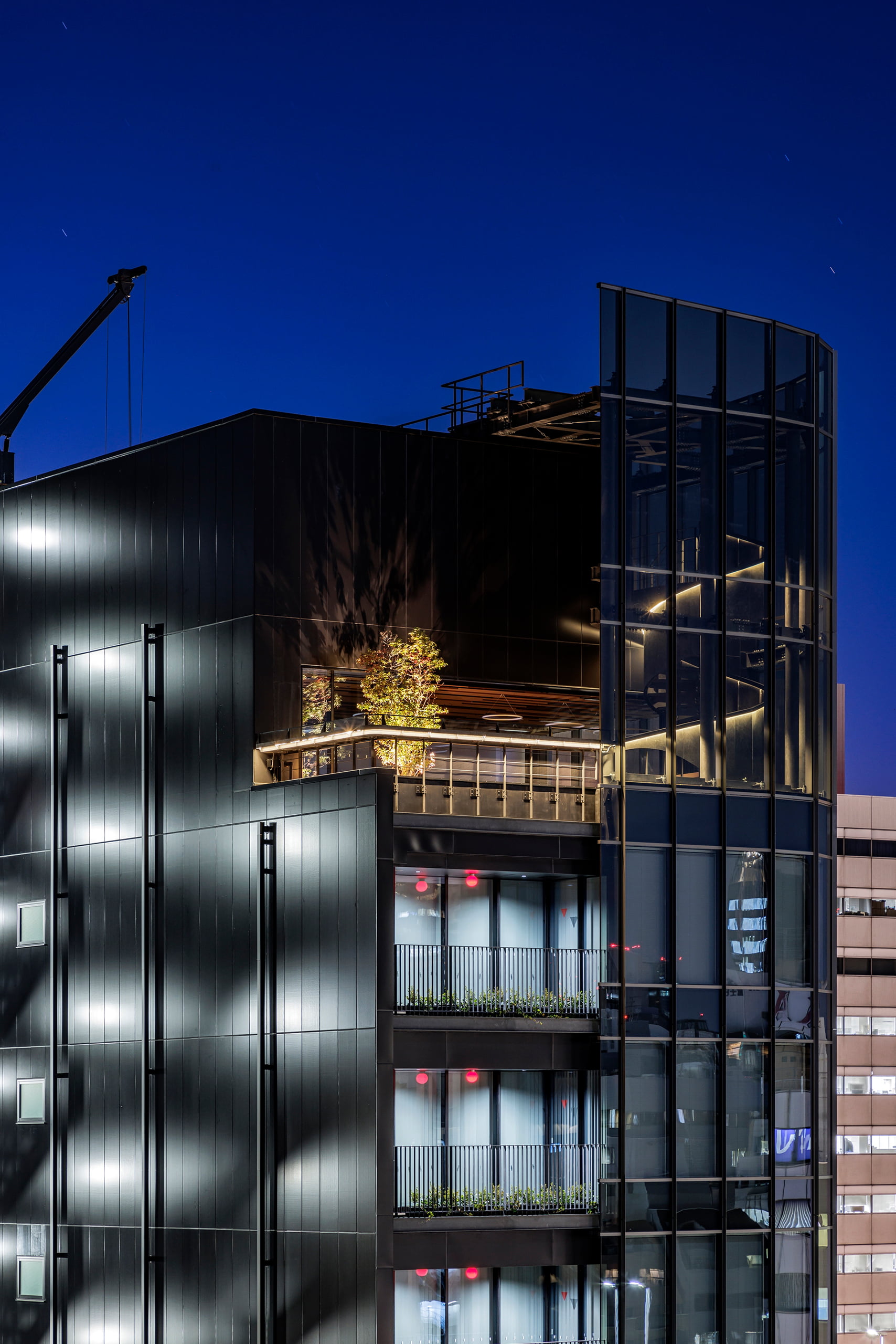 シンボルツリーのある11階テラスからシェアスペースにかけては、自然素材が内部空間にも浸透していく流動的な建築デザインとなっており、円形ペンダント照明や螺旋階段の手摺へ3Dライン照明を採用し、空間のコンセプトと調和した照明計画としている。