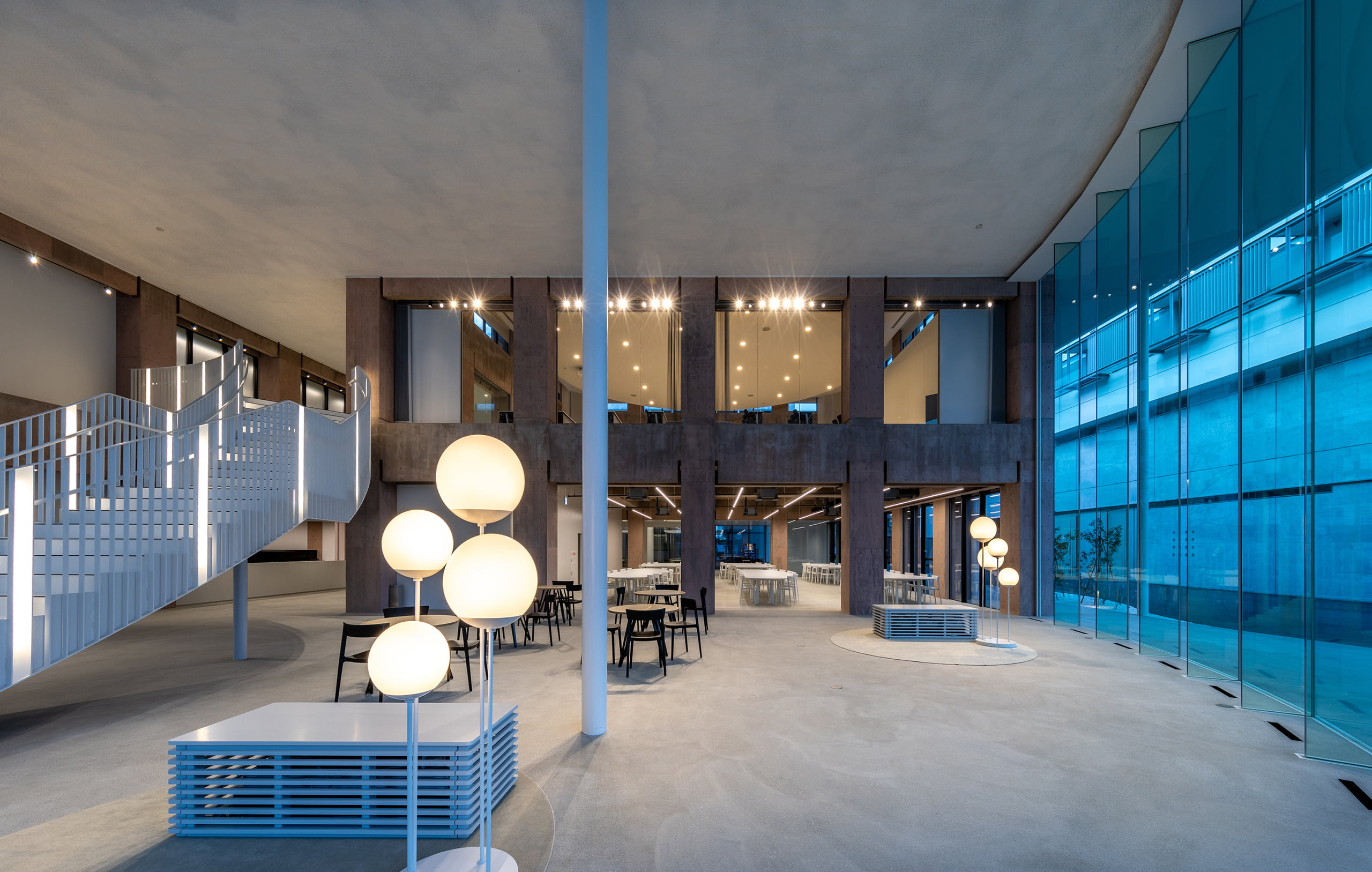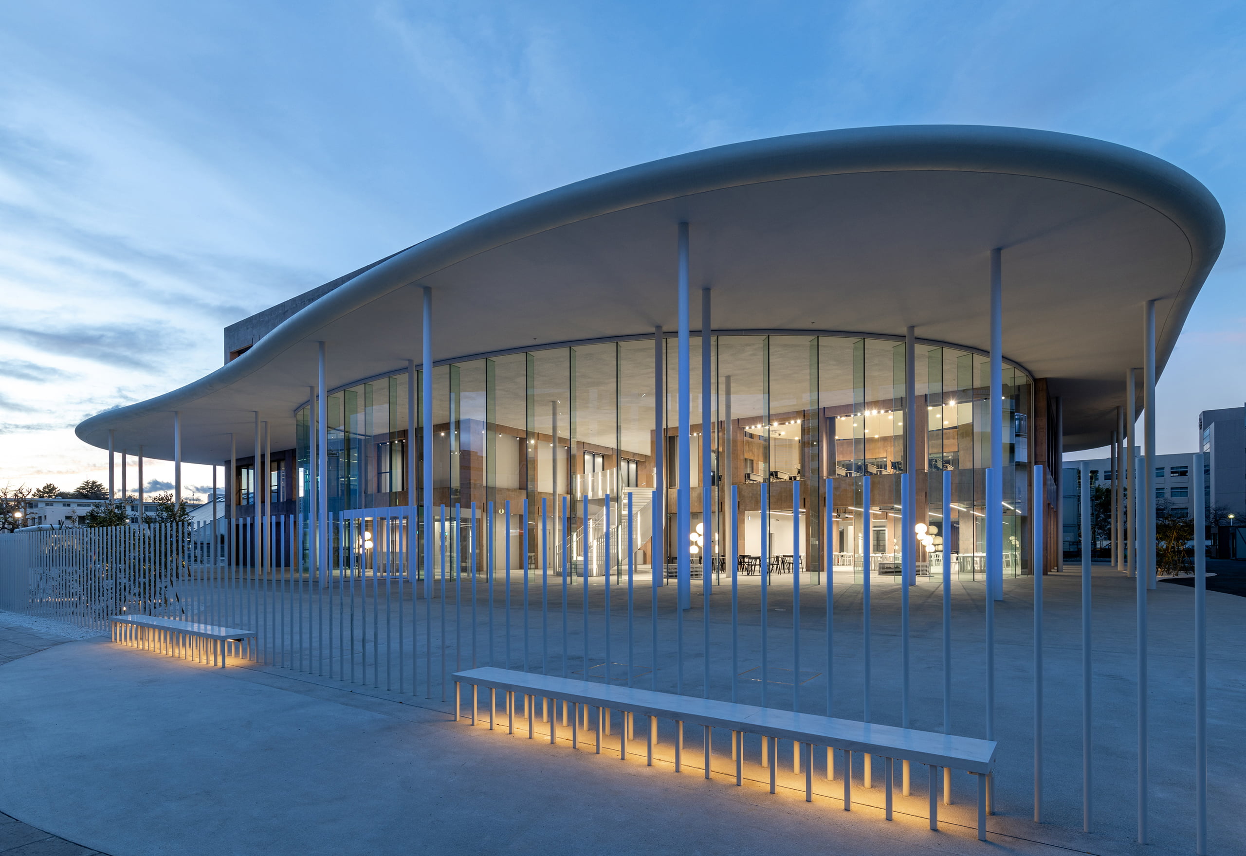 キャンパスルーフに照明は設置せず、特注スタンドや階段手すり照明と周囲のスポットライトで構成。雲のような特徴的なルーフが夜のキャンパスに浮かび上がり、柔らかい光で包み込み人々を館内へと誘う演出となっている。
