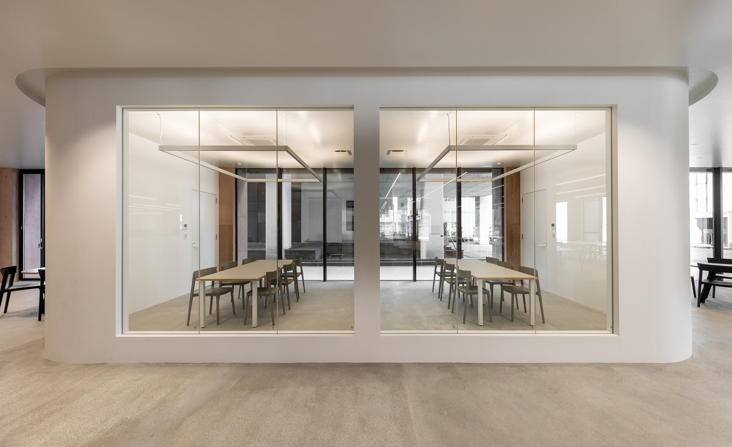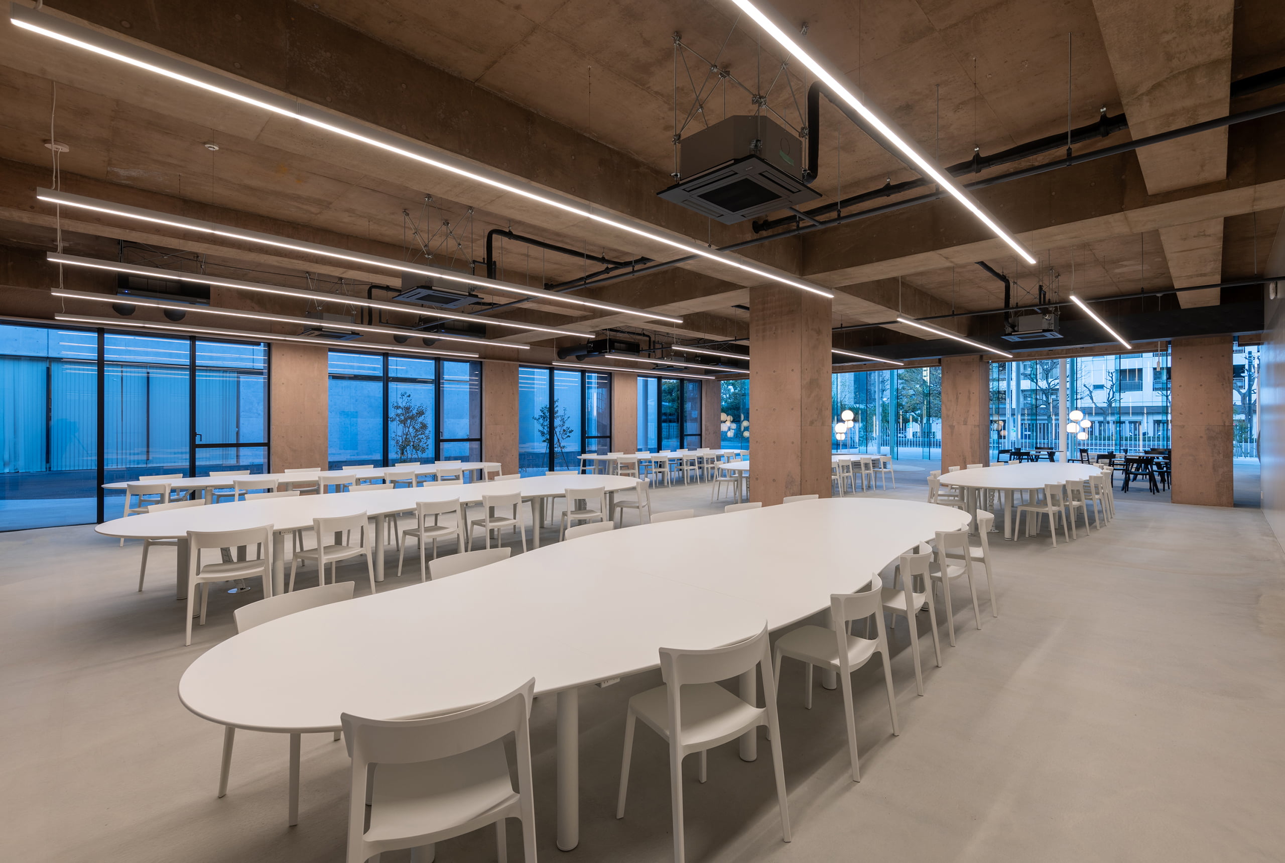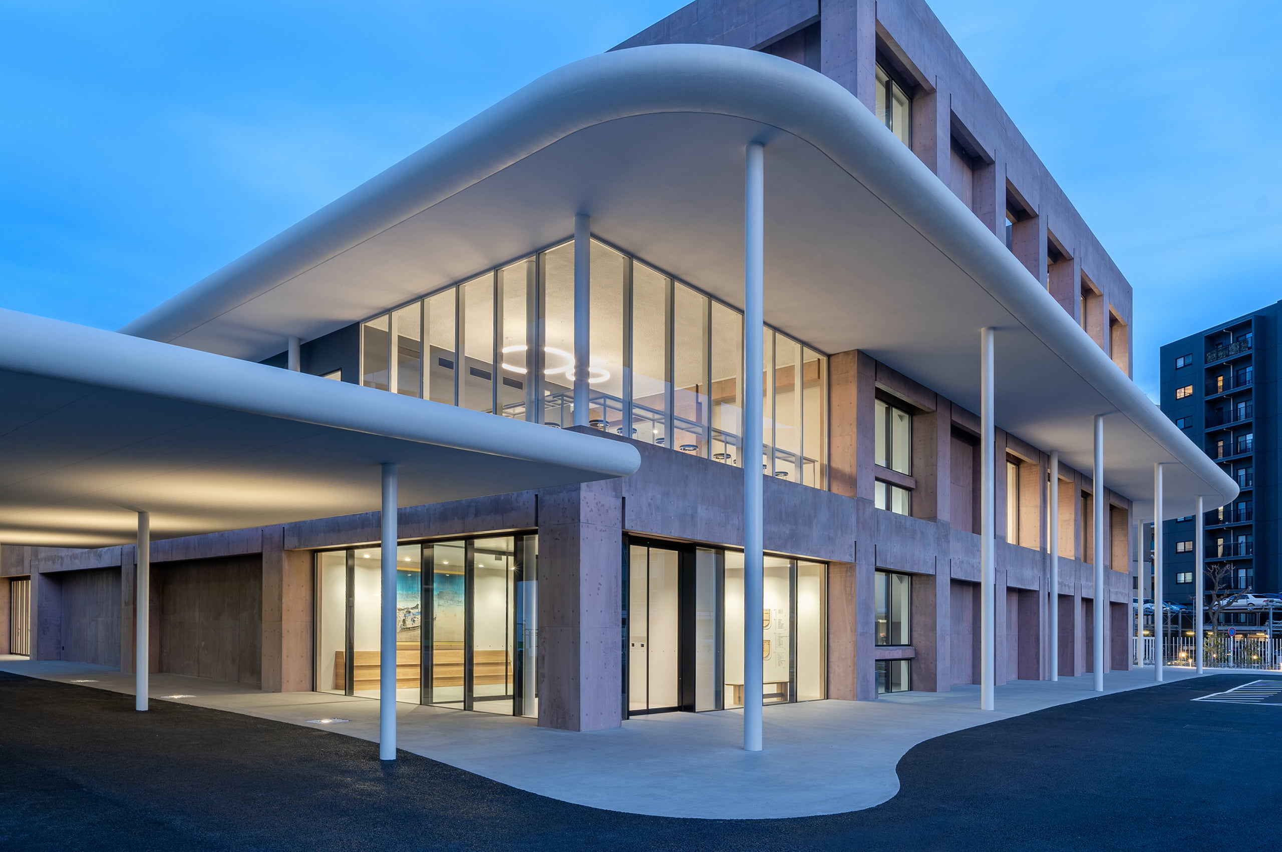 カラーコンクリート仕上げの事務棟と学修棟を、おおらかで伸びやかな白いキャンパスルーフでつないだ空間は、学生と訪れる人々を招き入れ、そして包み込む。