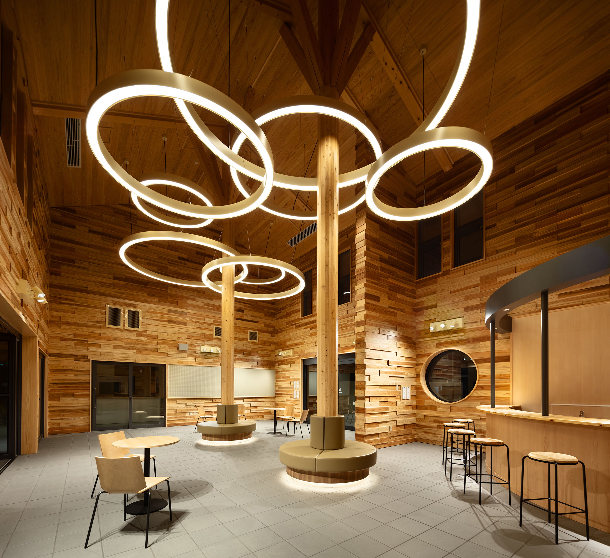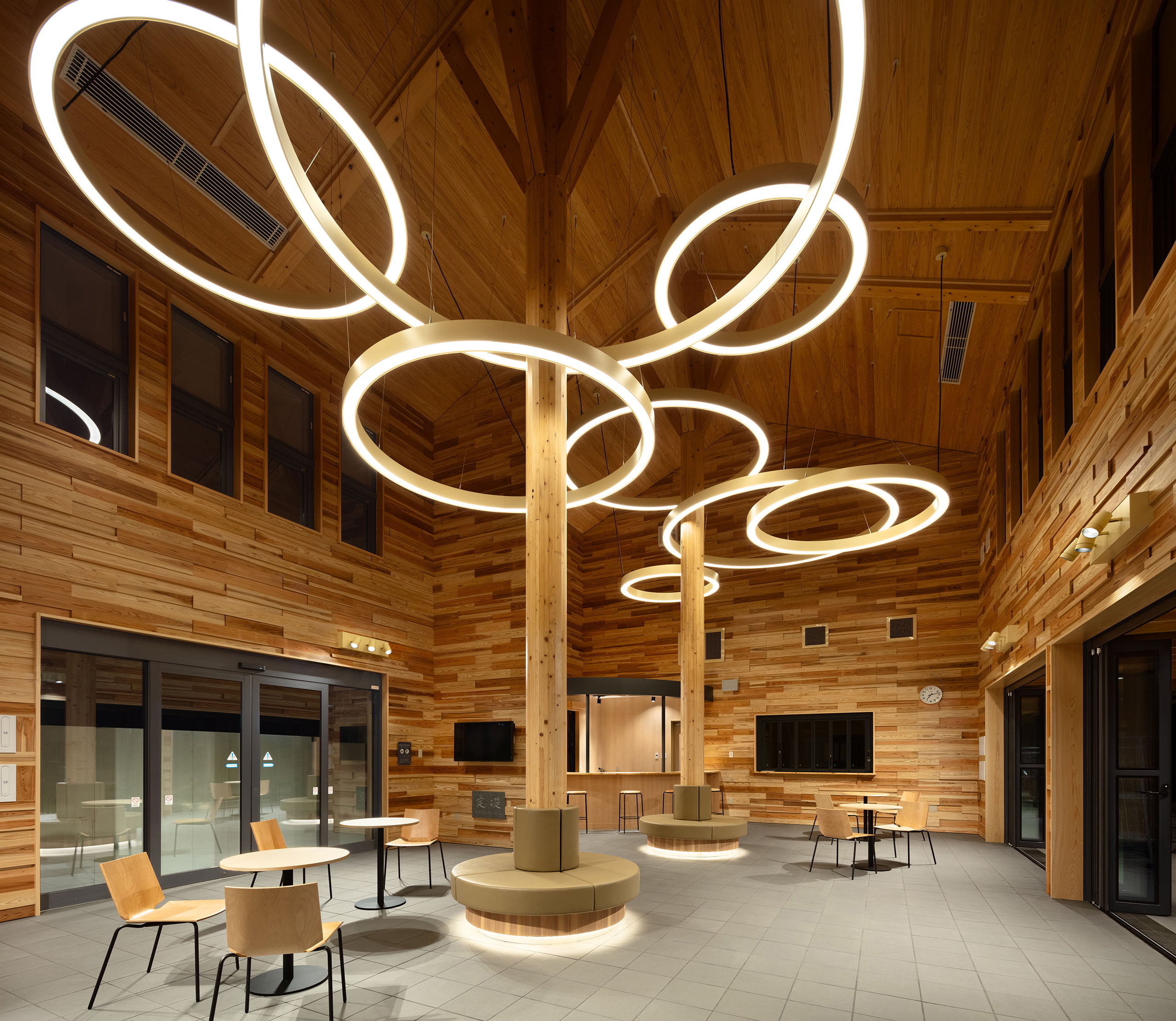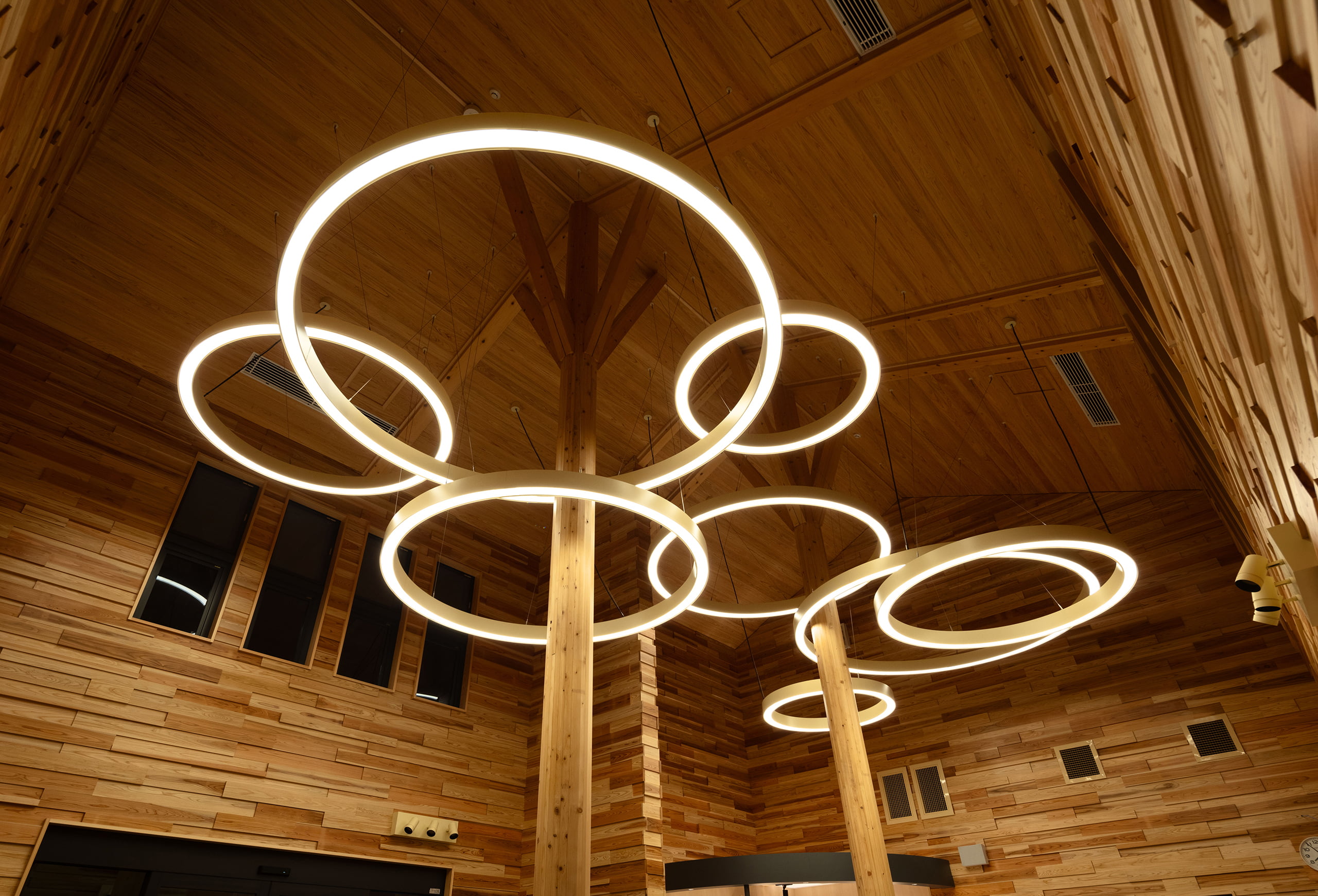 滋賀県の木材を使った木造平屋建てのエントランスに特注リングペンダントを設置。