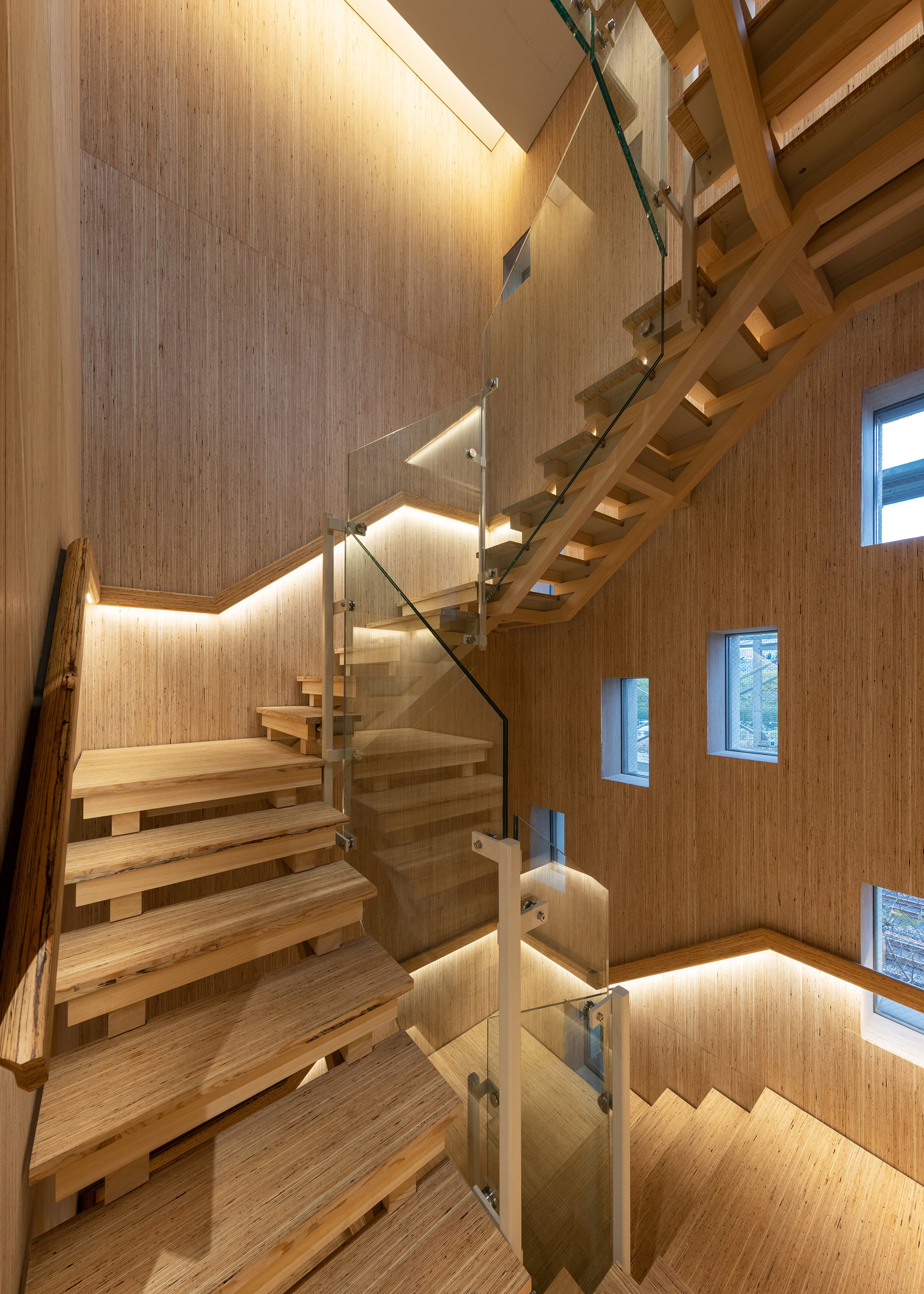 場所ごとに少しずつ密度を変え、階段室を一筋の光でつなぐことで、三層で