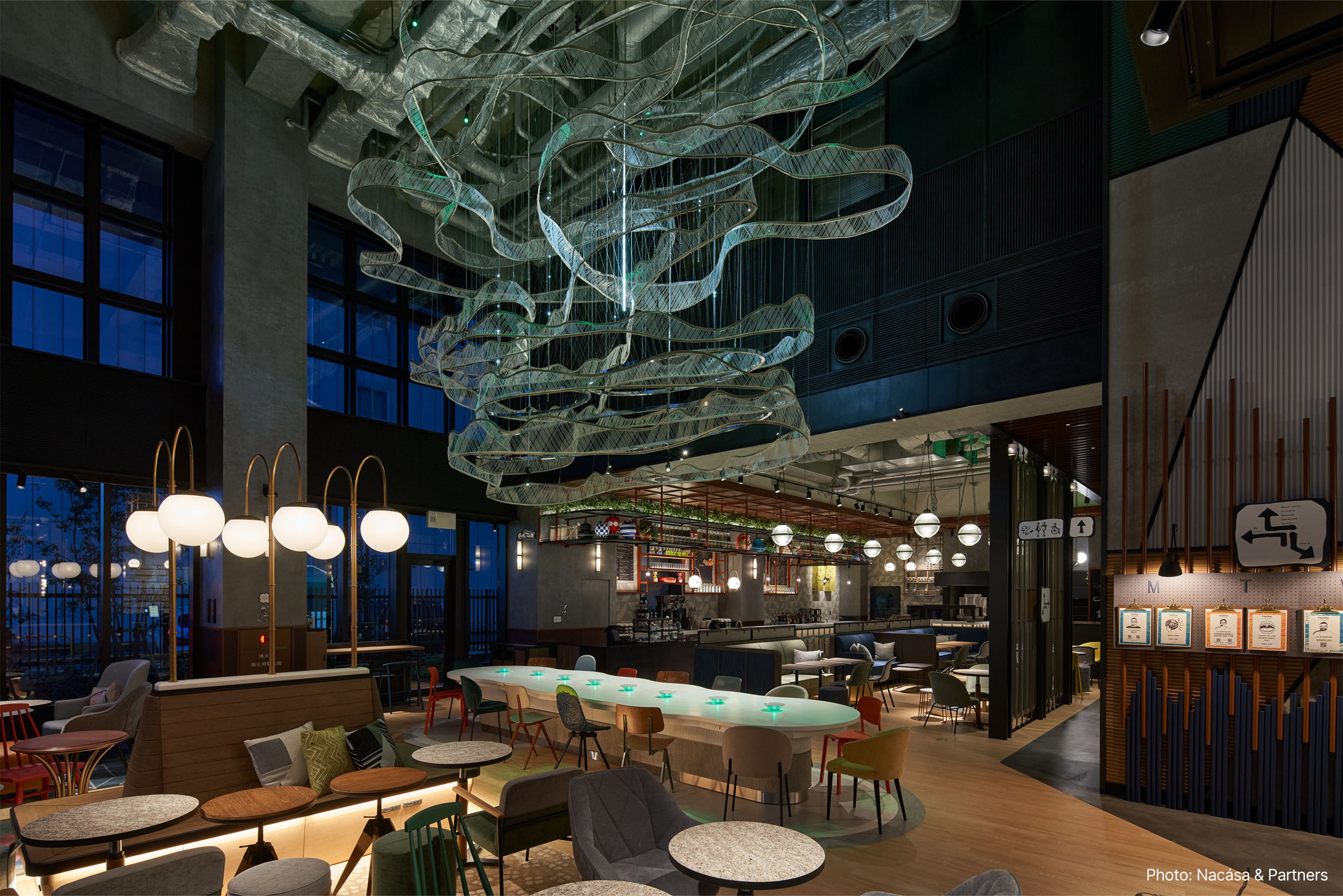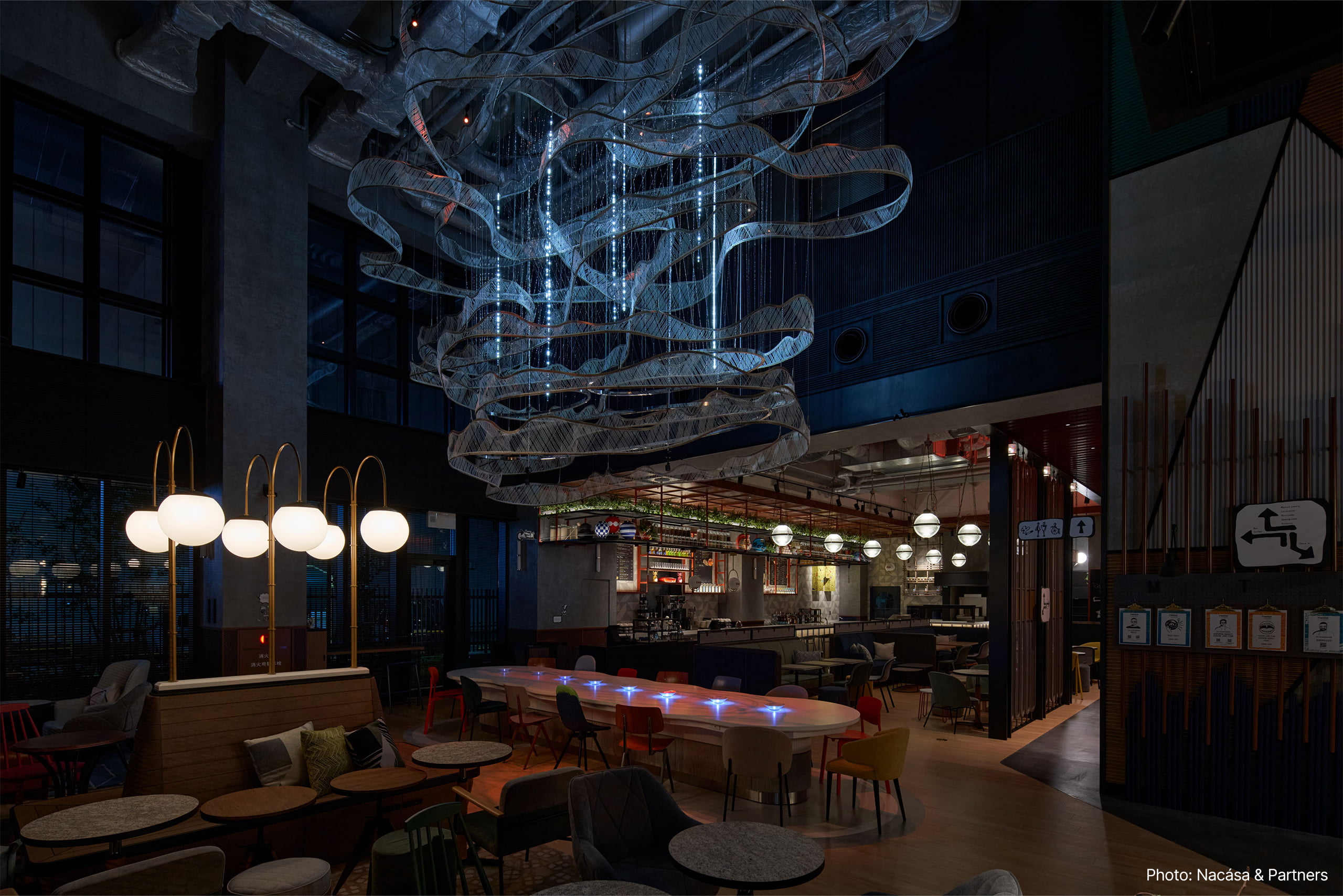 このアートは日本古来からの風習である「雲どり」をテーマに表現され、まず雲に変化が起こるとロビー全体のシーンが朝、昼、夕方、そしてナイトタイムを経てバータイムへ、それぞれの照明が切り替わる仕掛けとなっており、「場の変化」が起こる「兆し」の役割を果たす演出となっている。