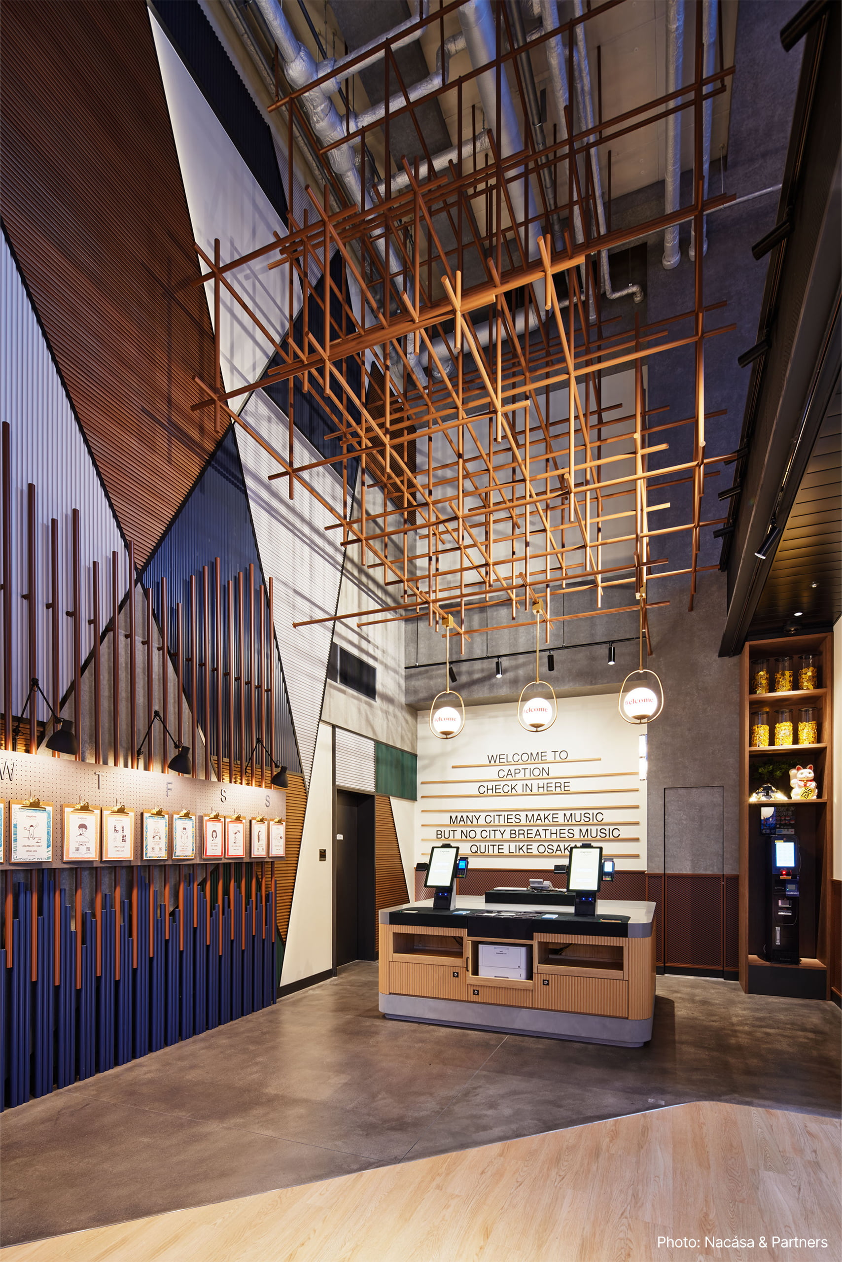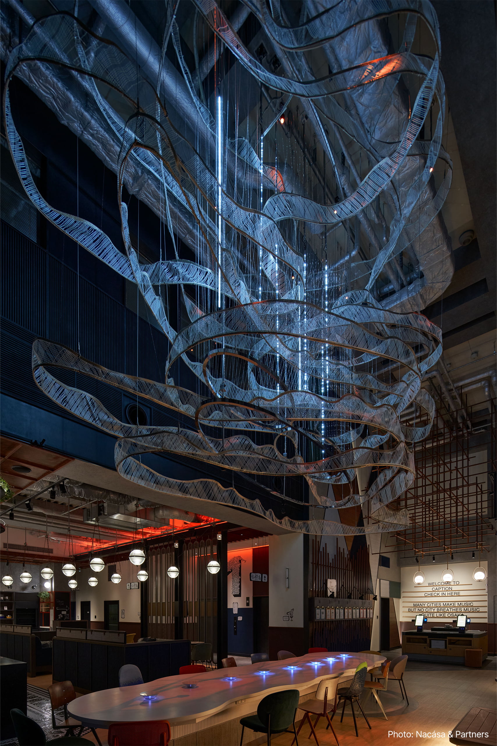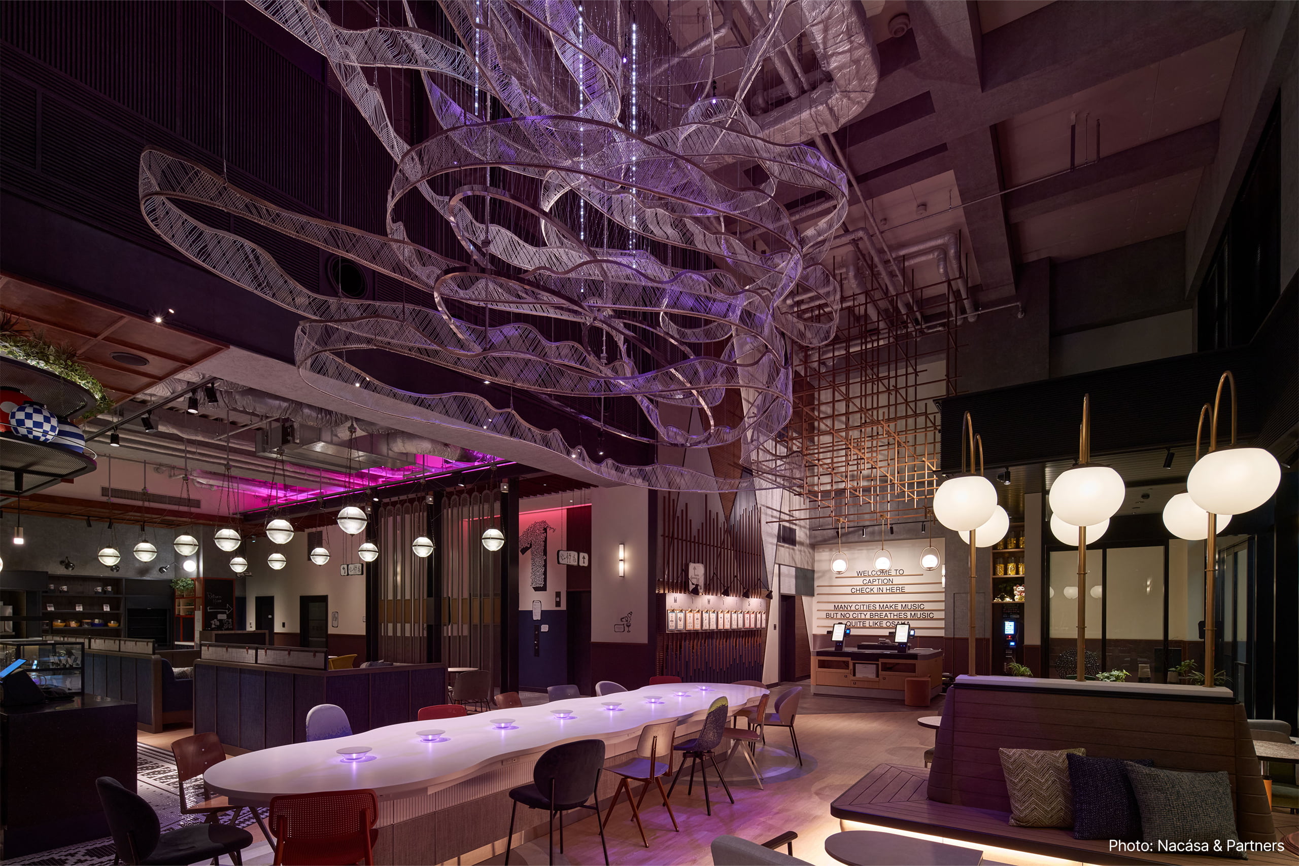 その他ロビー、客室共に日本らしさを残した遊び心のあるデザインが施されており、照明も刀や風鈴などをデザインソースに遊び心のある様々な照明を特注器具で製作している。