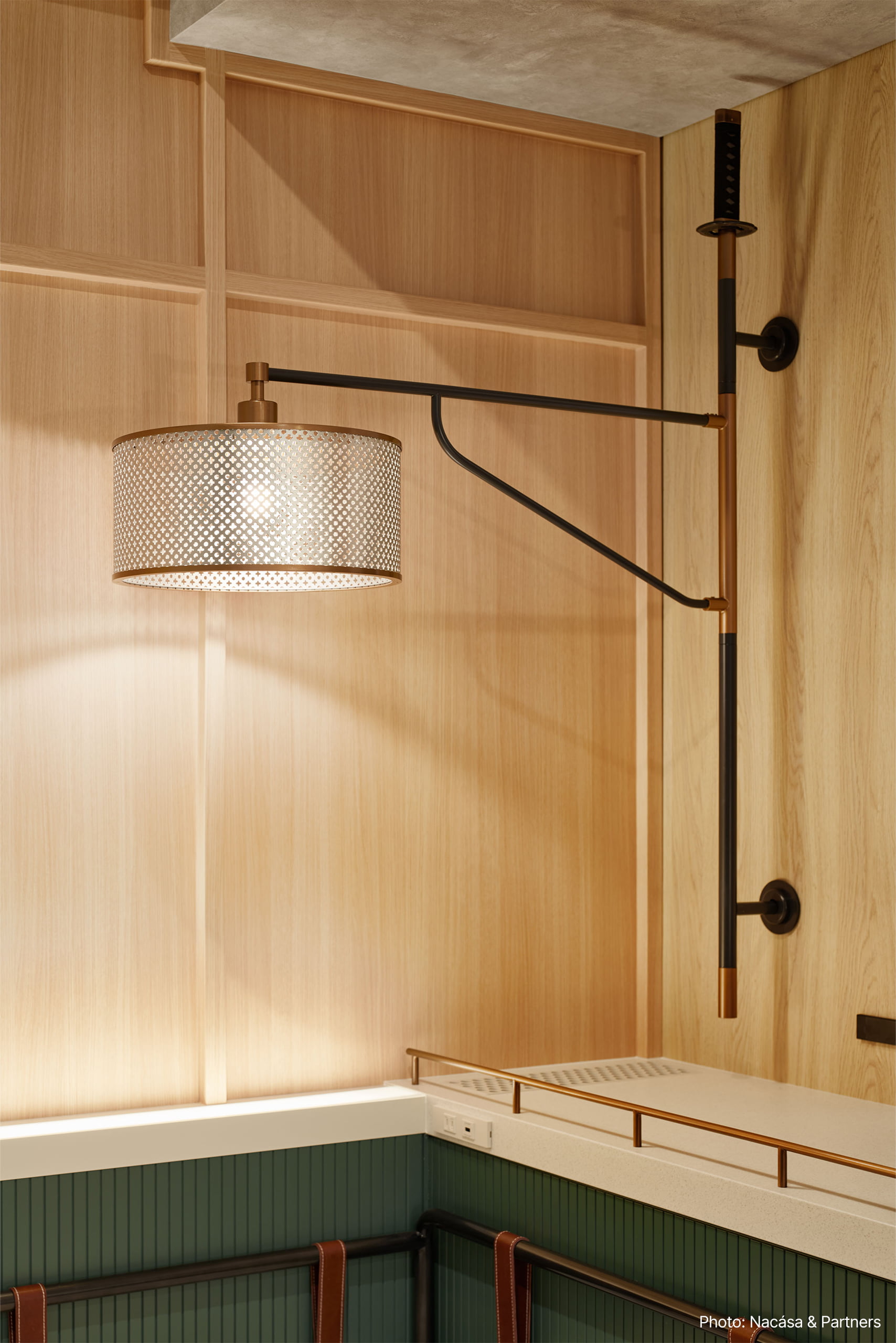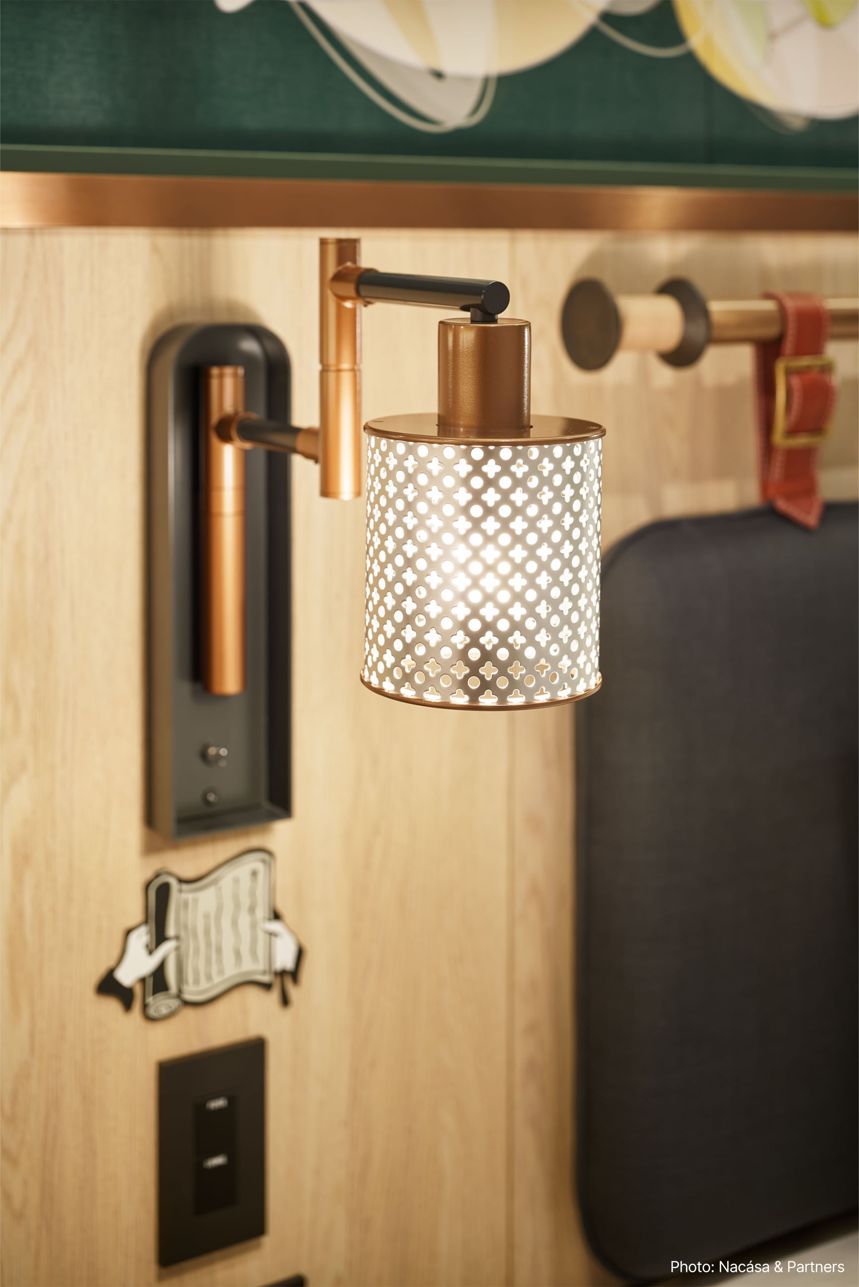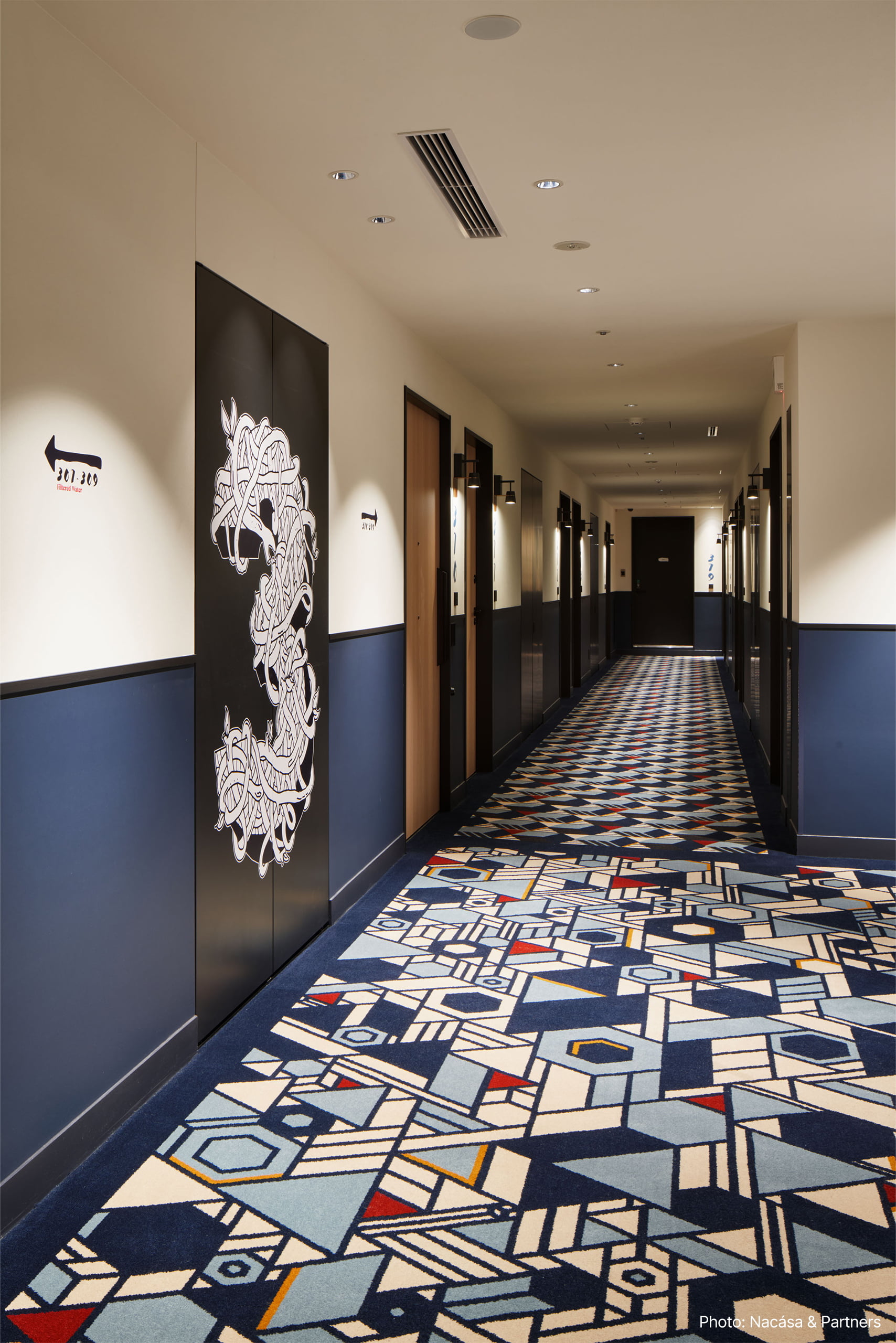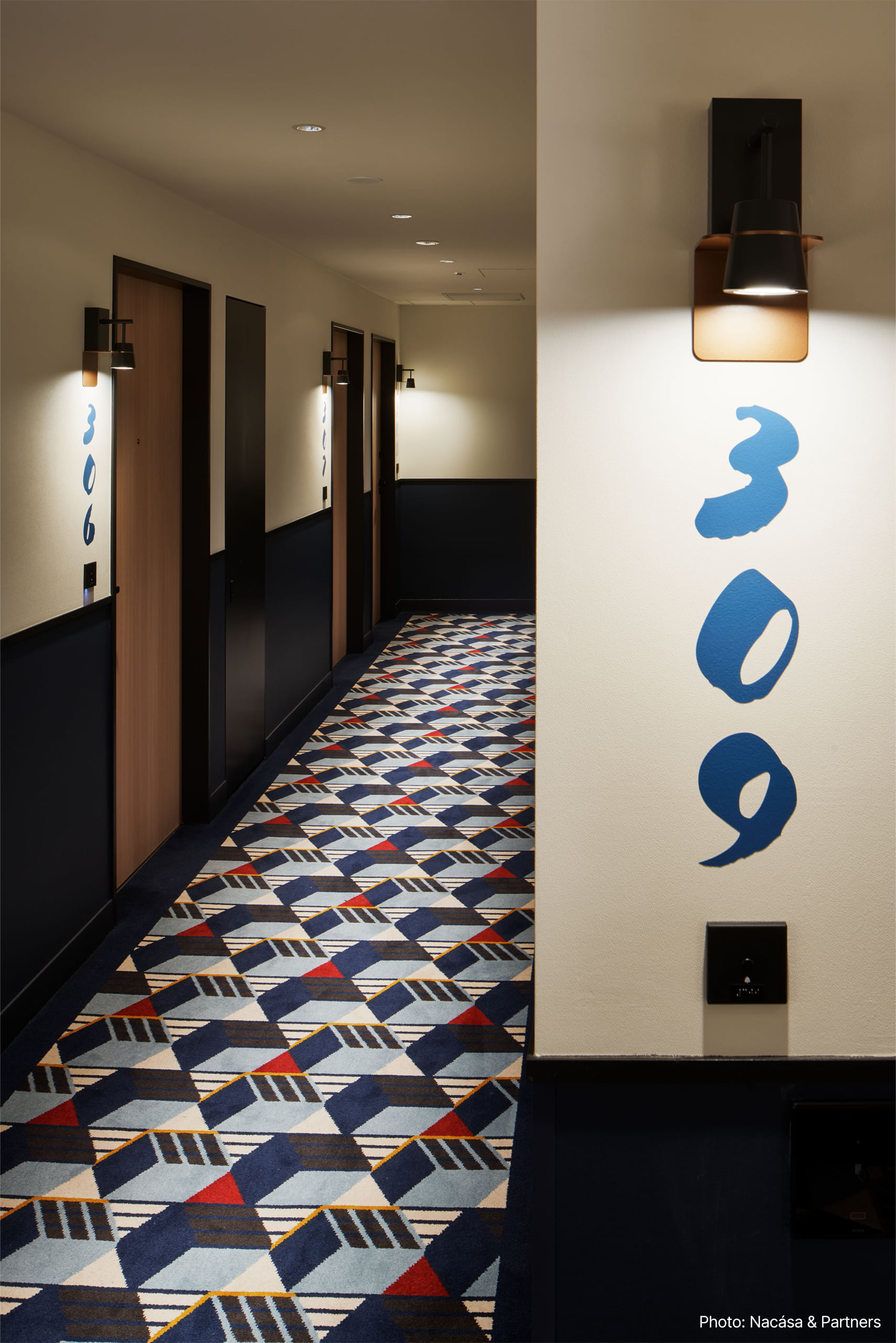 その他ロビー、客室共に日本らしさを残した遊び心のあるデザインが施されており、照明も刀や風鈴などをデザインソースに遊び心のある様々な照明を特注器具で製作している。