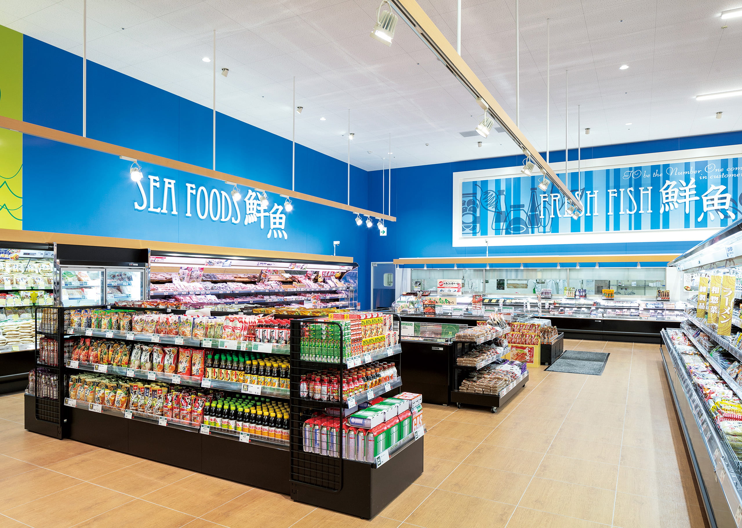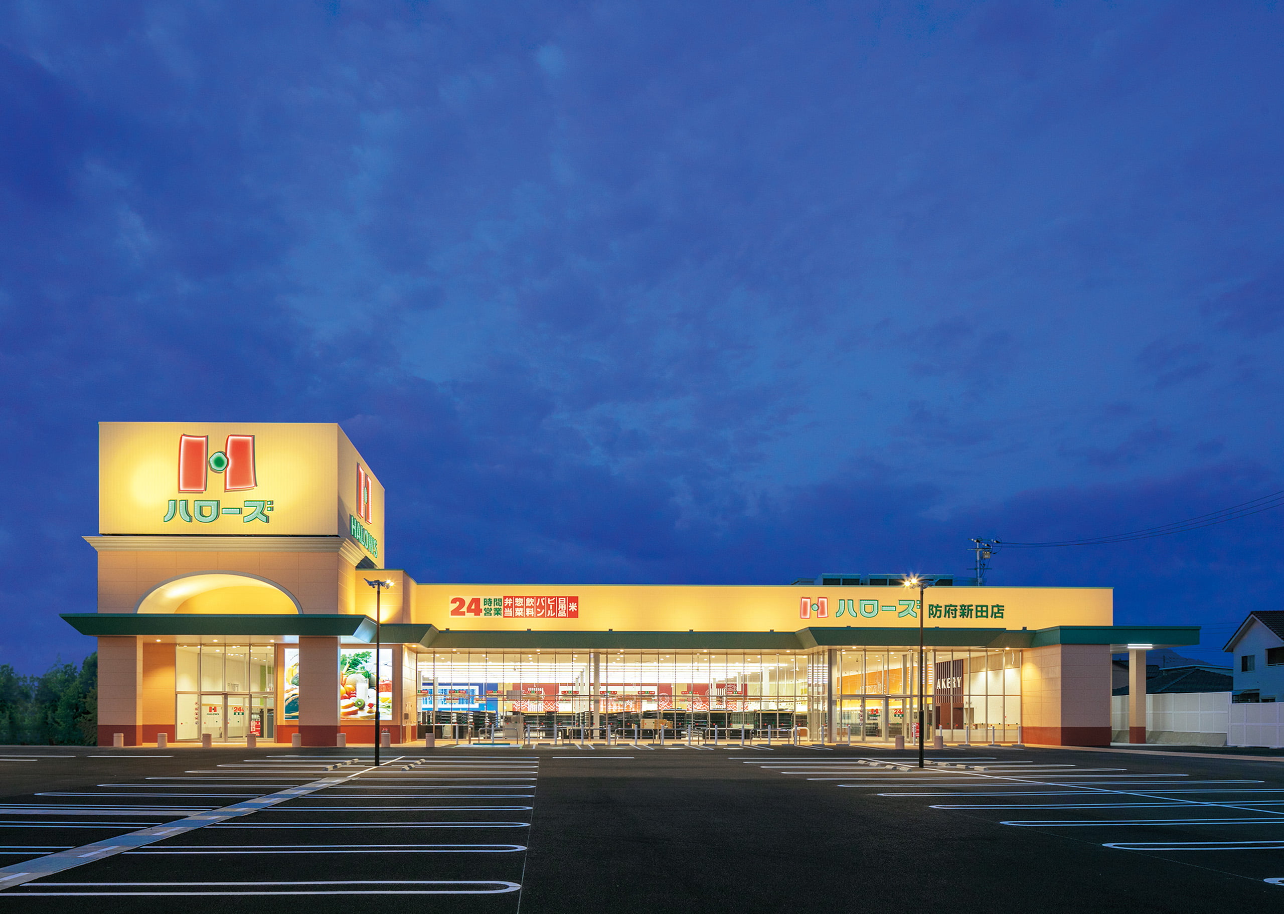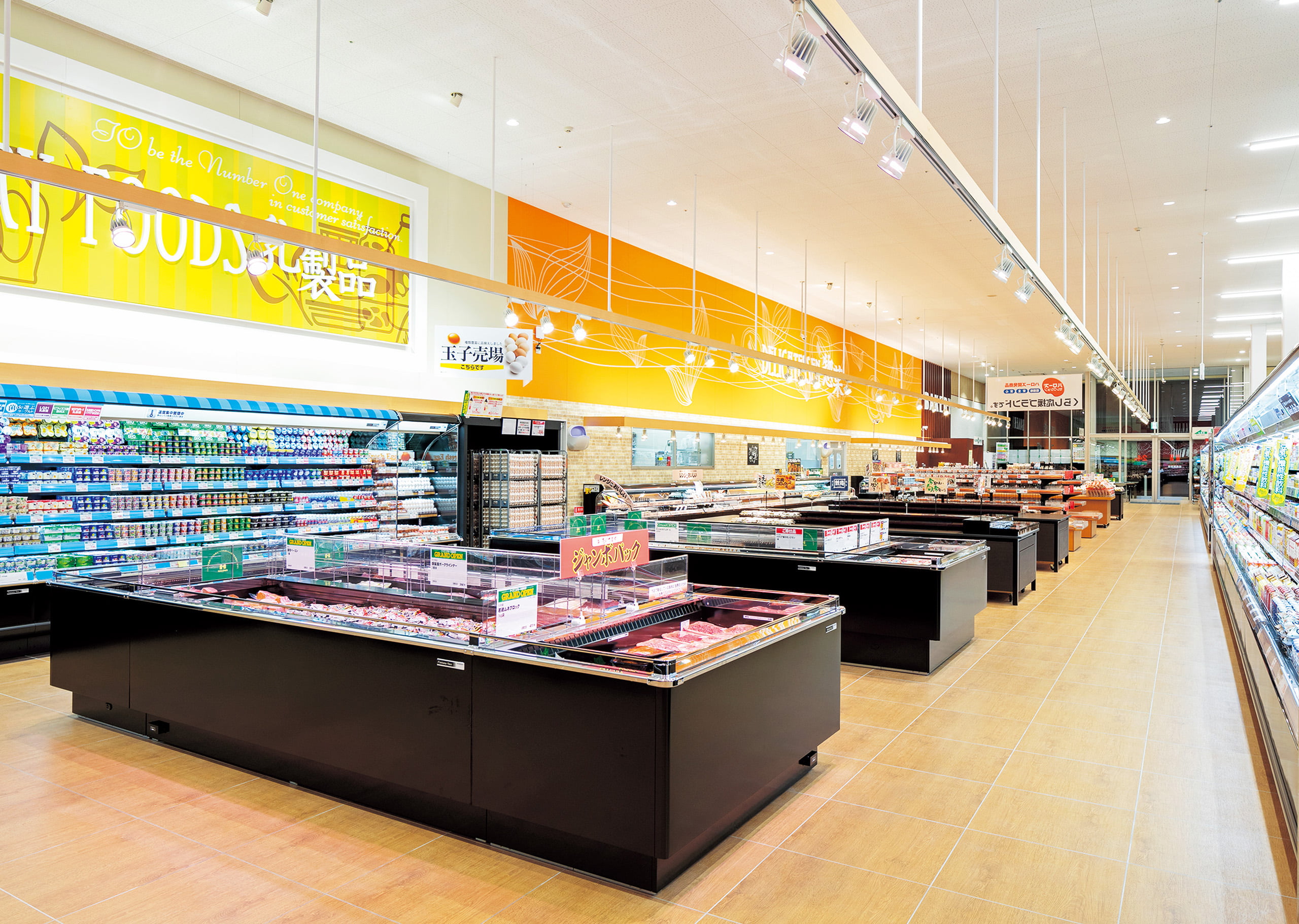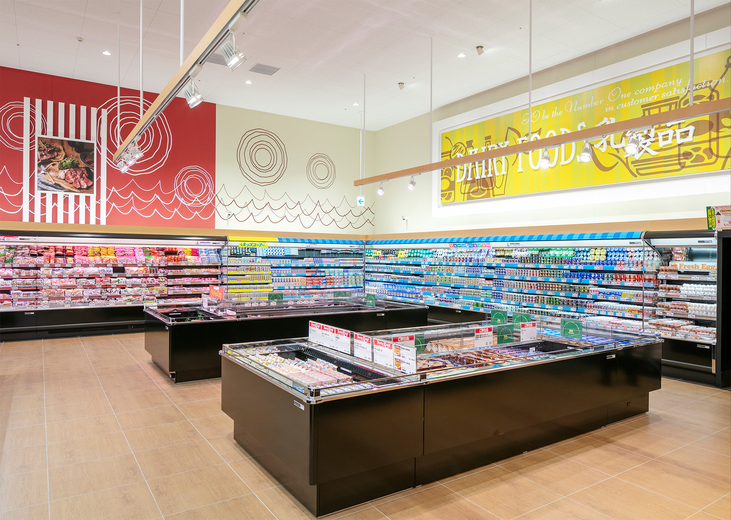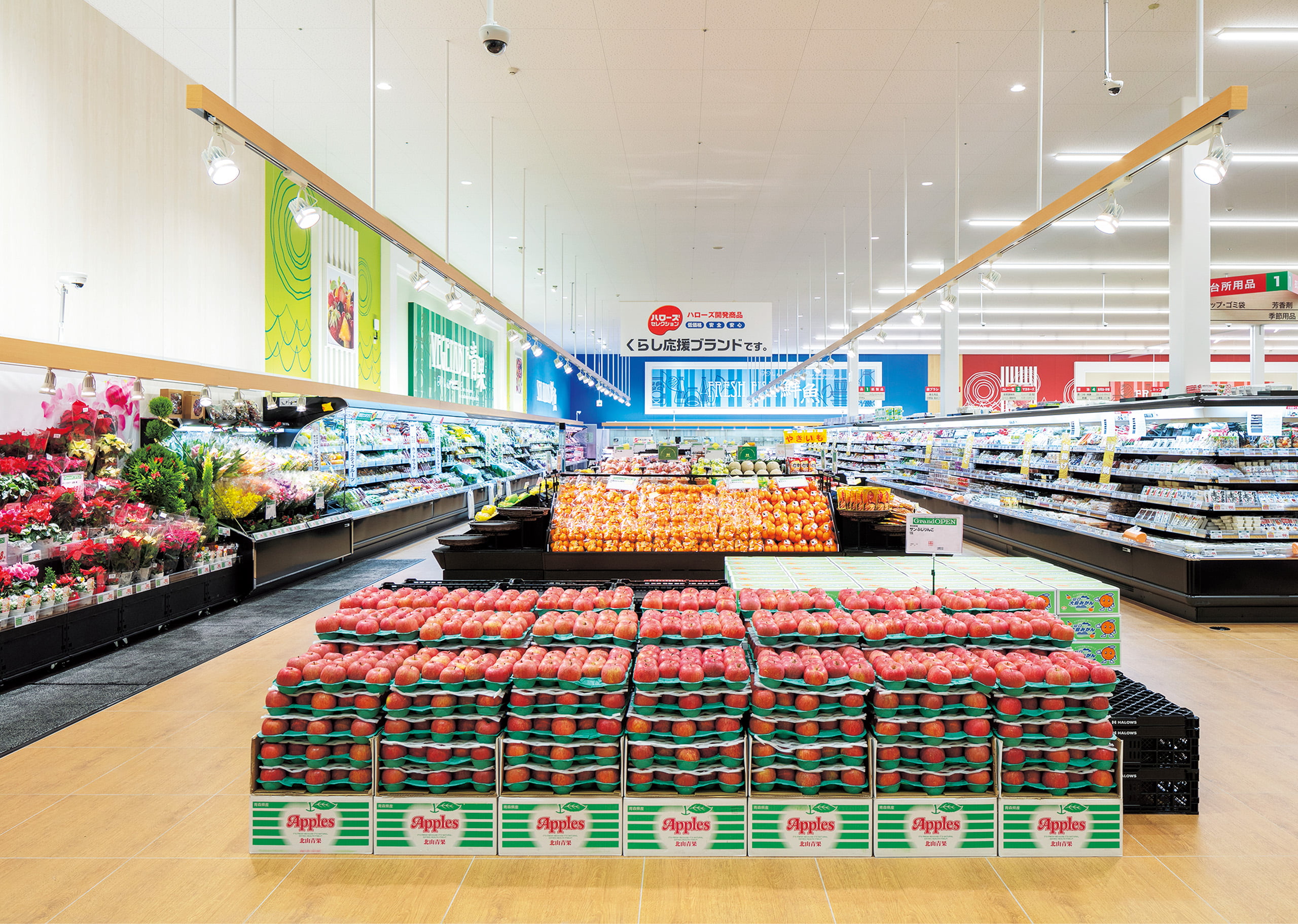 スーパーマーケット ハローズでは、開放感と上質な雰囲気を引き出すための照明計画を採用しました。