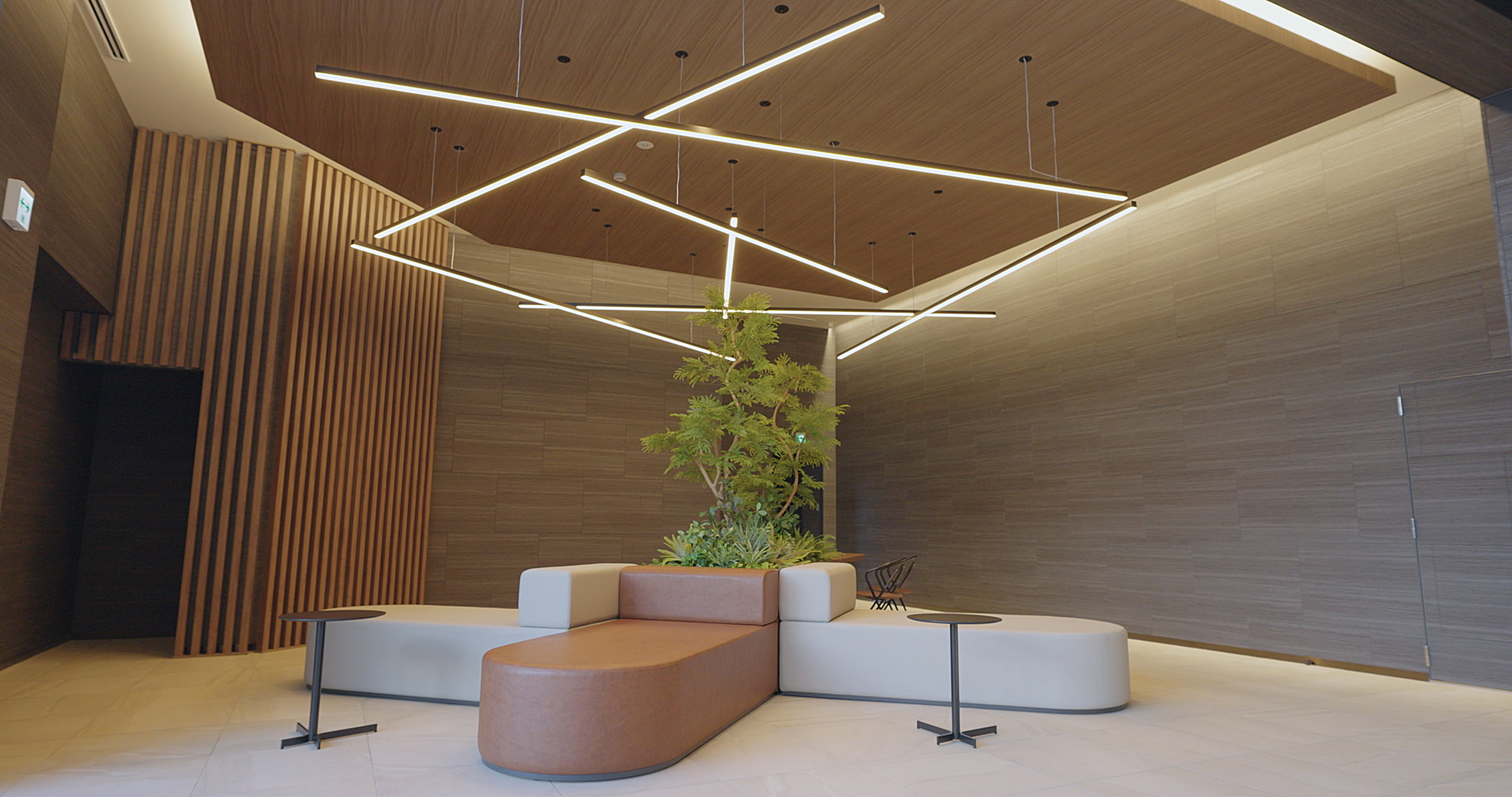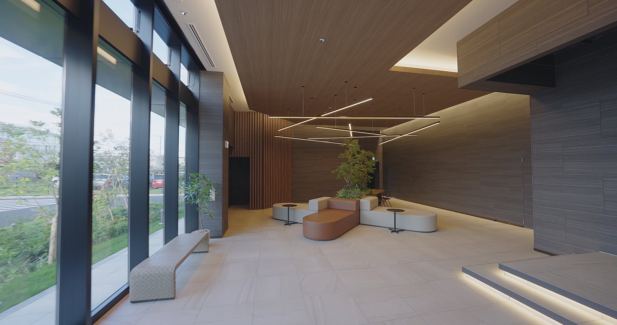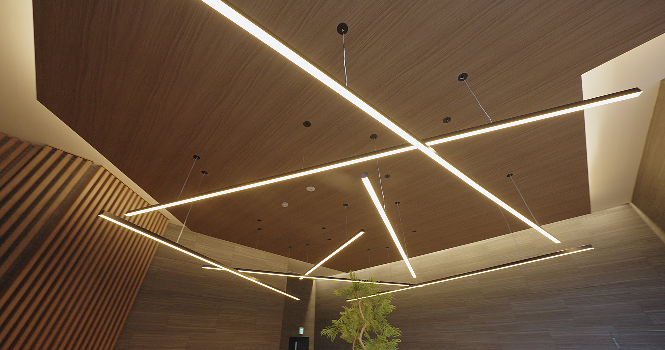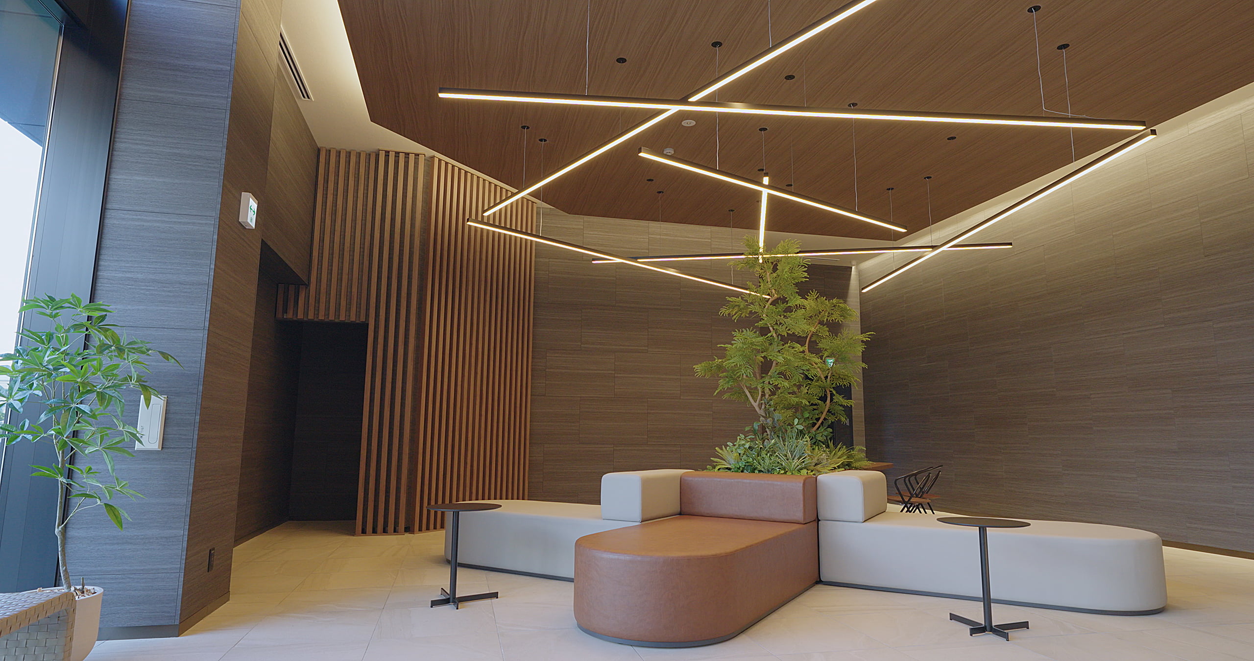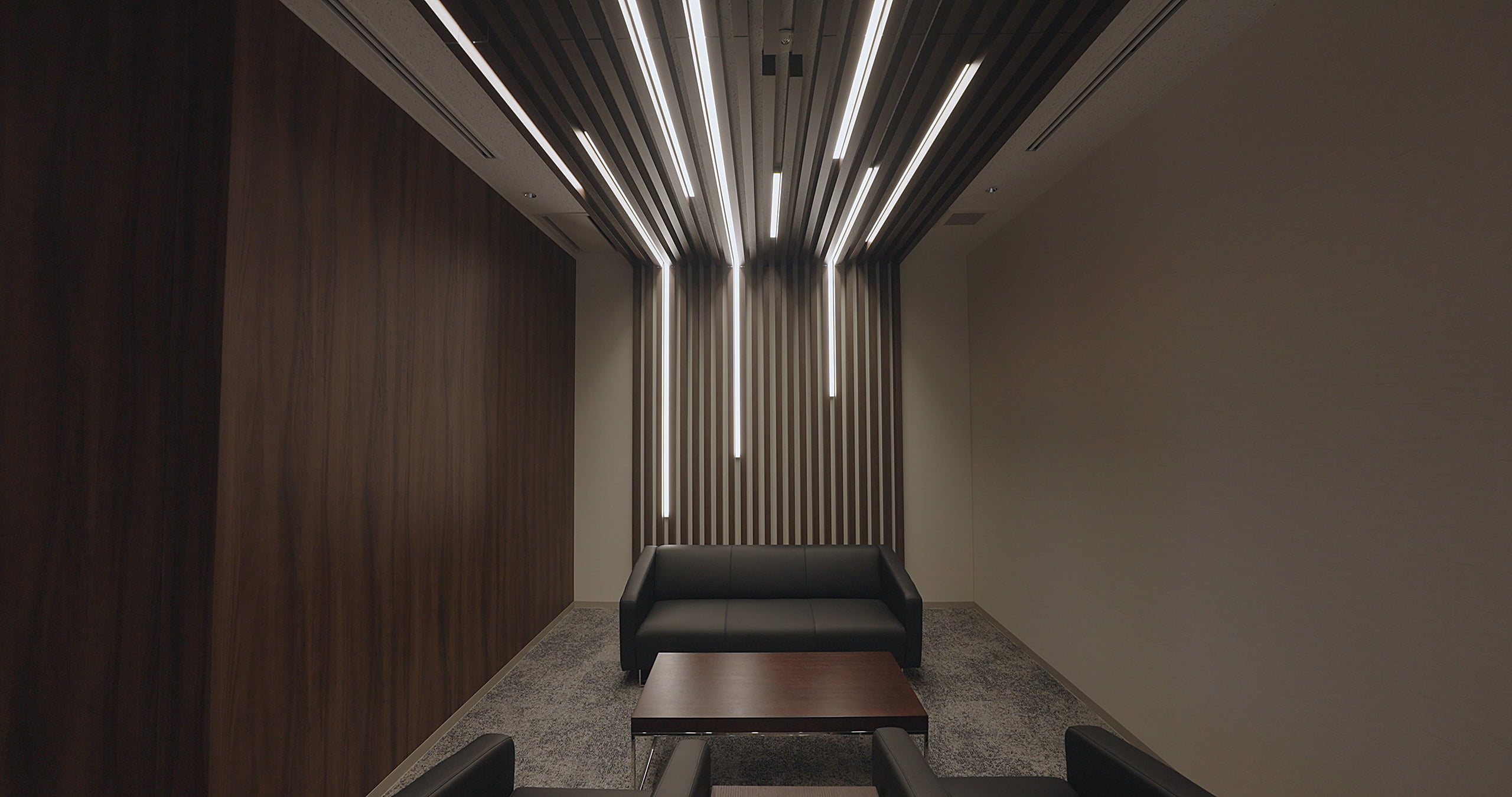こちらのオフィスでは、エントランス、エレベーターホール、執務室、ラウンジなどさまざまなスペースで無線制御システム「SENMU」をご採用いただきました。