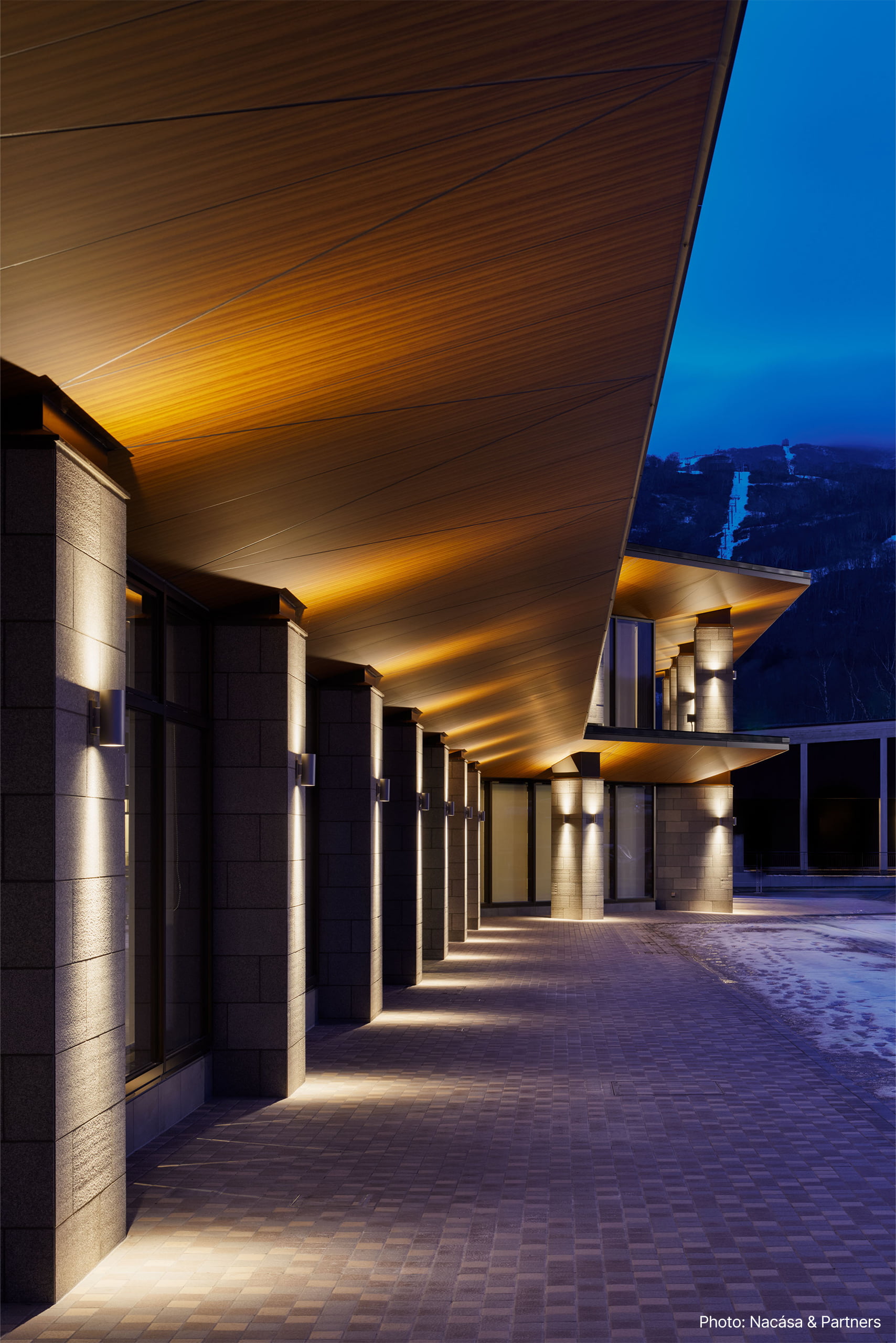 外観のライトアップは、積雪地域にも強い対候性を兼ね備えた〝ZERO〟シリーズを使用し、ファサードを構成する柱・梁・庇・屋根をそれぞれの形状に合った異なる手法で照らすことで、建築が持つ動きのあるファサードをより豊かに演出している。