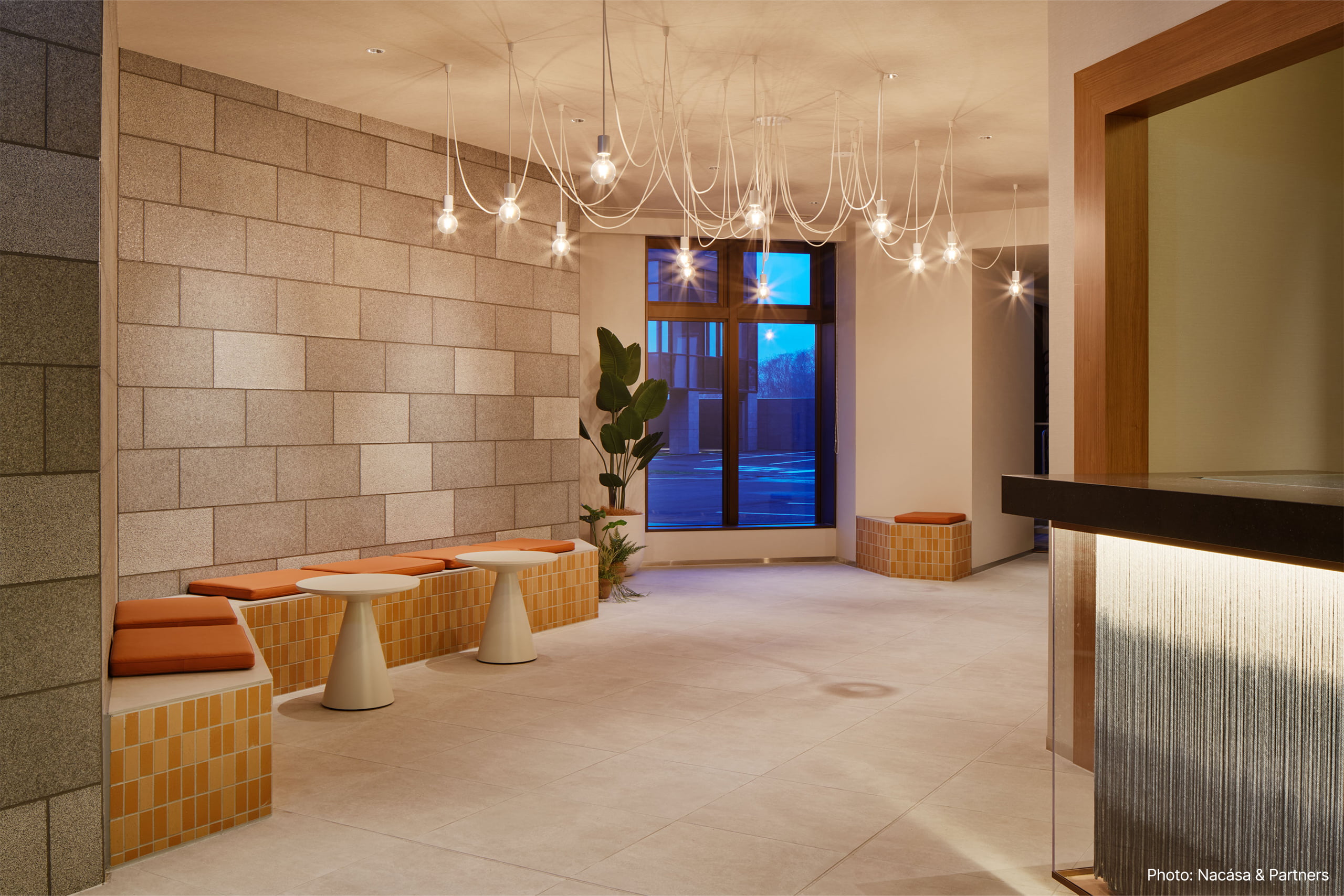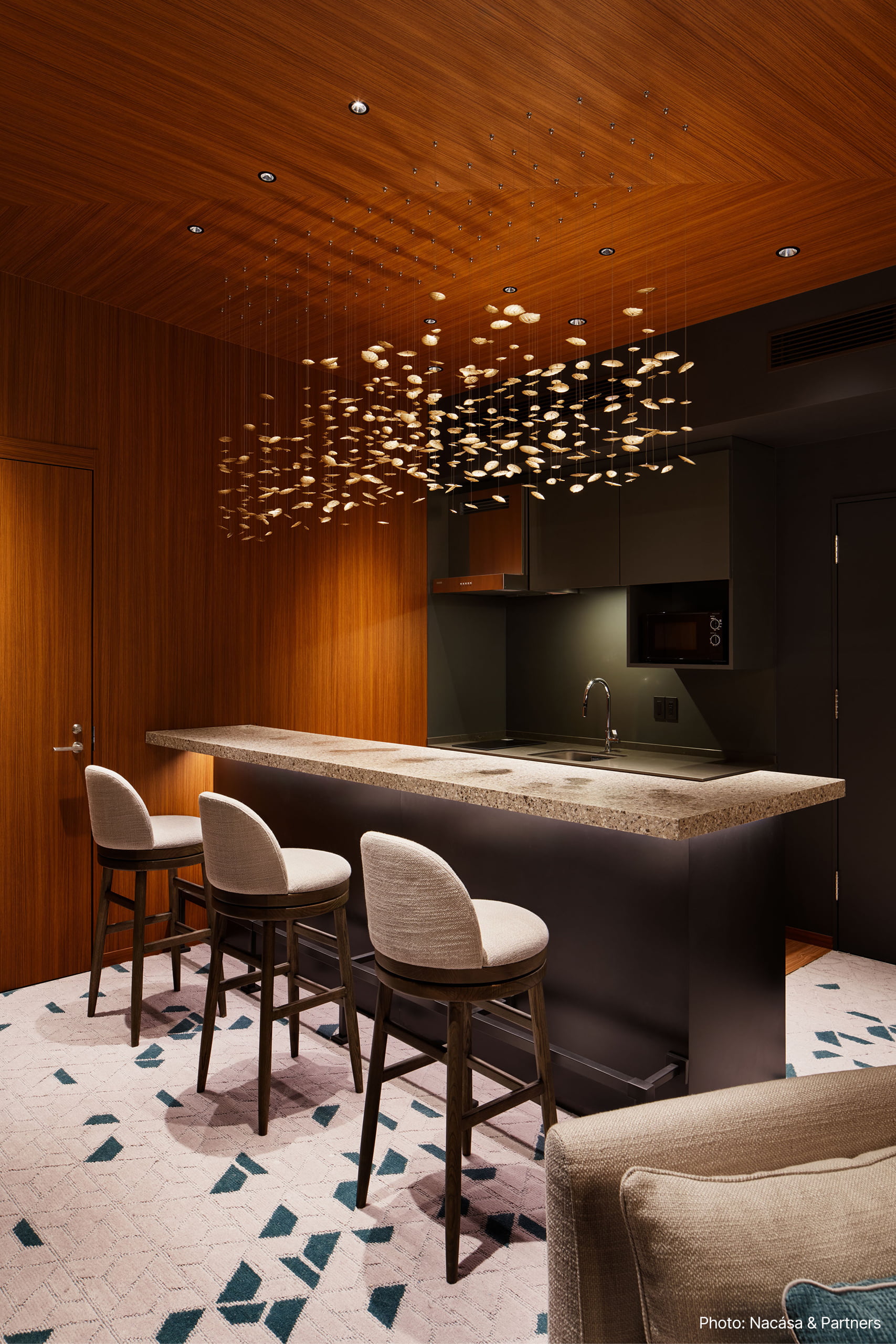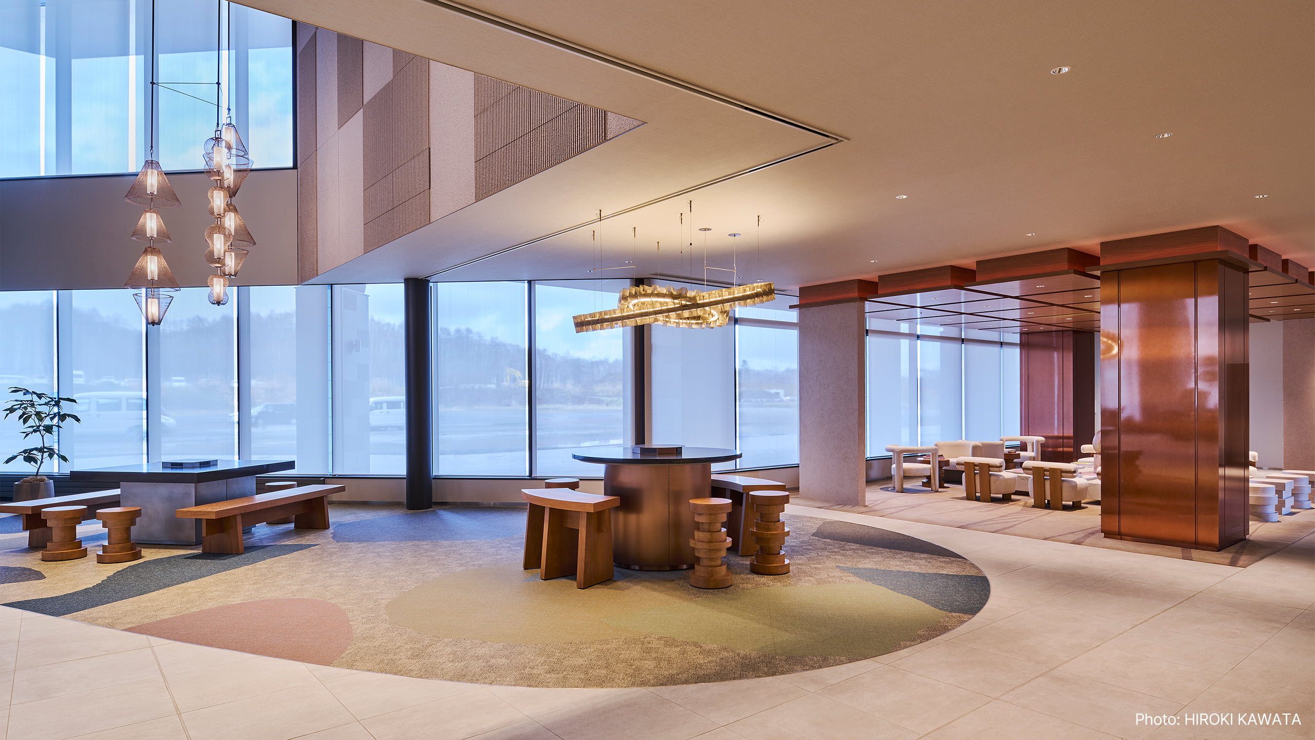 「北海道の恵みを混ぜ合わせ楽しむホテルインテリア 」 をコンセプトに、照明もエリアのコンセプトに合わせた雪だるまやジャガイモなどをモチーフとした特注照明を制作し、落ち着きと温もりを感じるデザインとした。