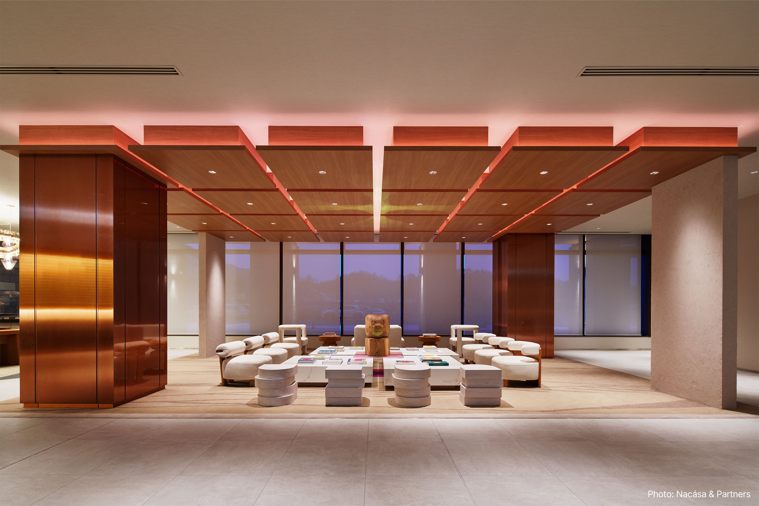 外光を多く取り入れる吹き抜け空間は 2700~5000K の調光調色器具(ダウンライト)を採用し、日中・夜・深夜でシーンが変わり時間と共に異なる空間を演出している。