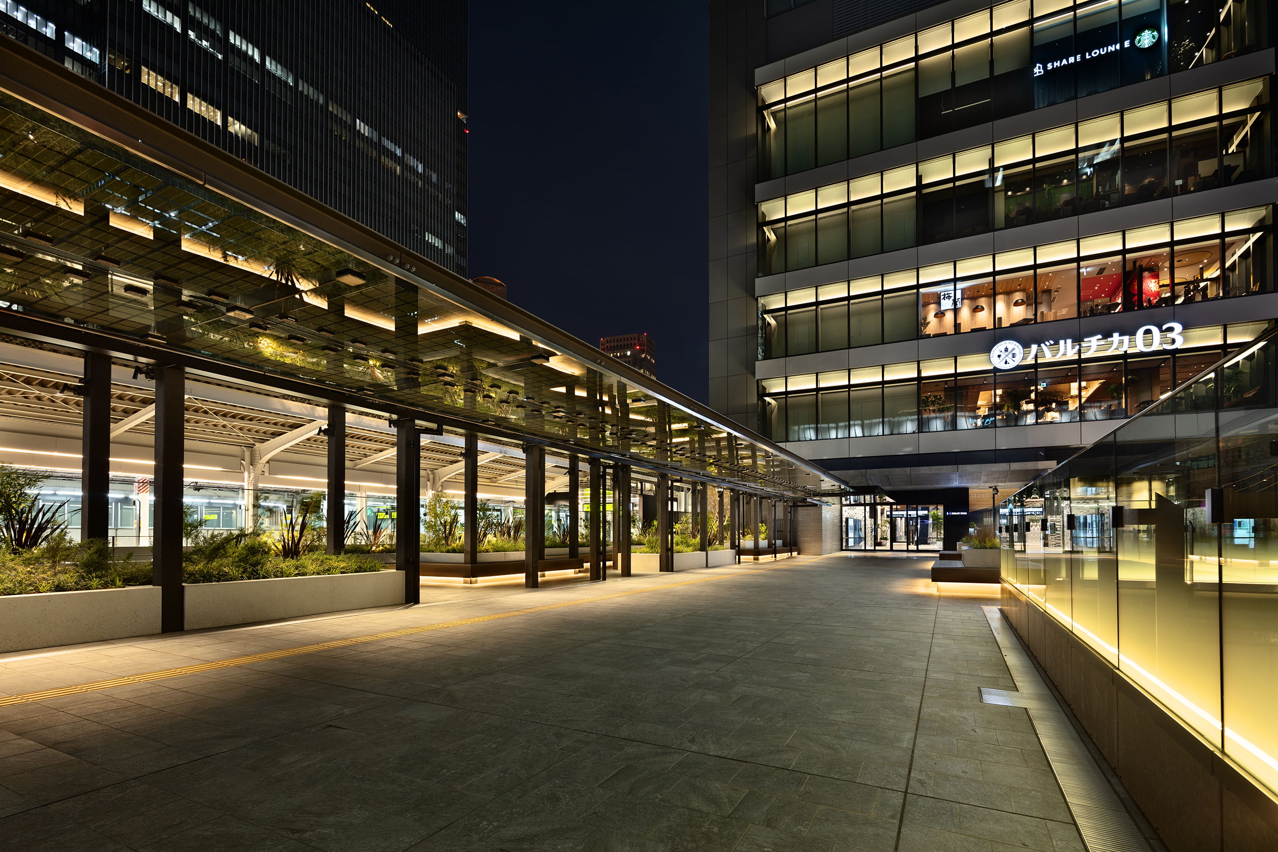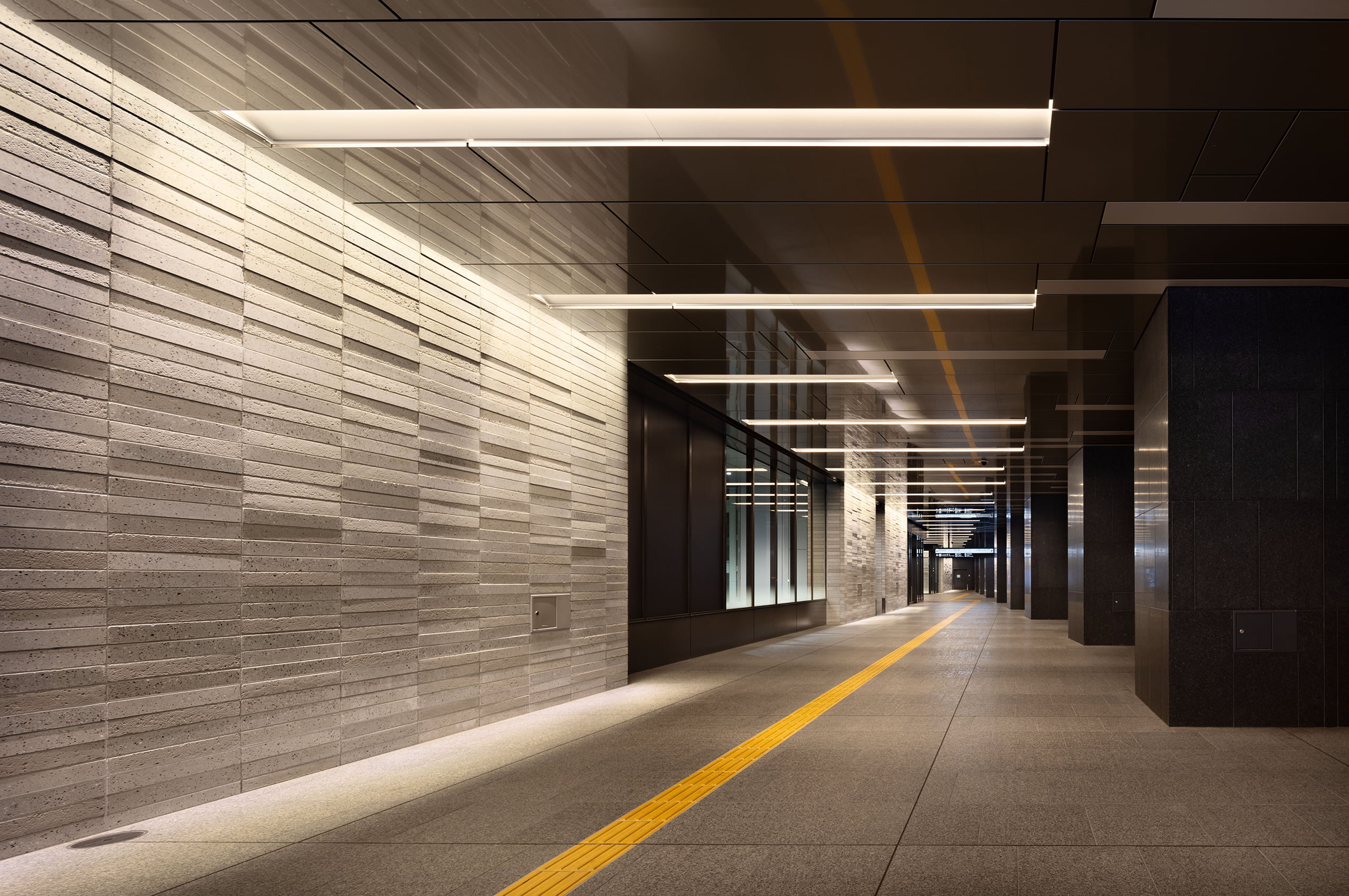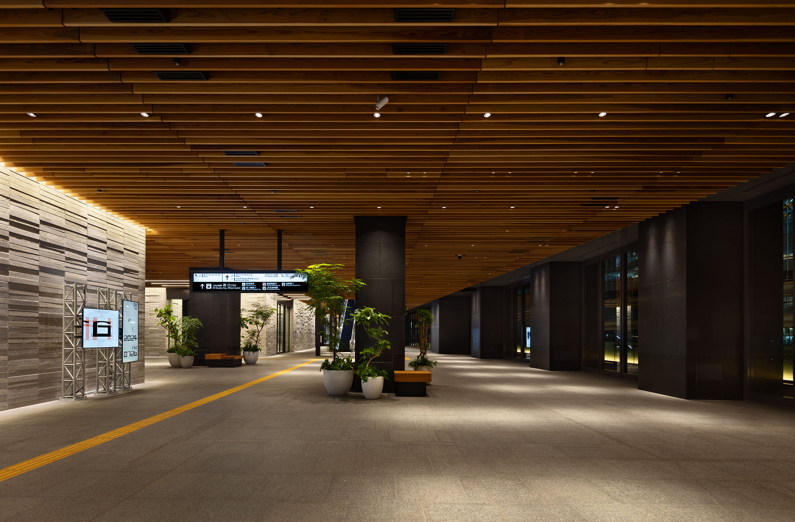 さらに、駅エントランスでは「縦の光」と「面の光」の組み合わせにより、空間の奥行きを強調。鉄道のダイヤグラムをモチーフにしたゲートデザインと光の演出が、駅の新たな玄関口としての魅力を高めている。