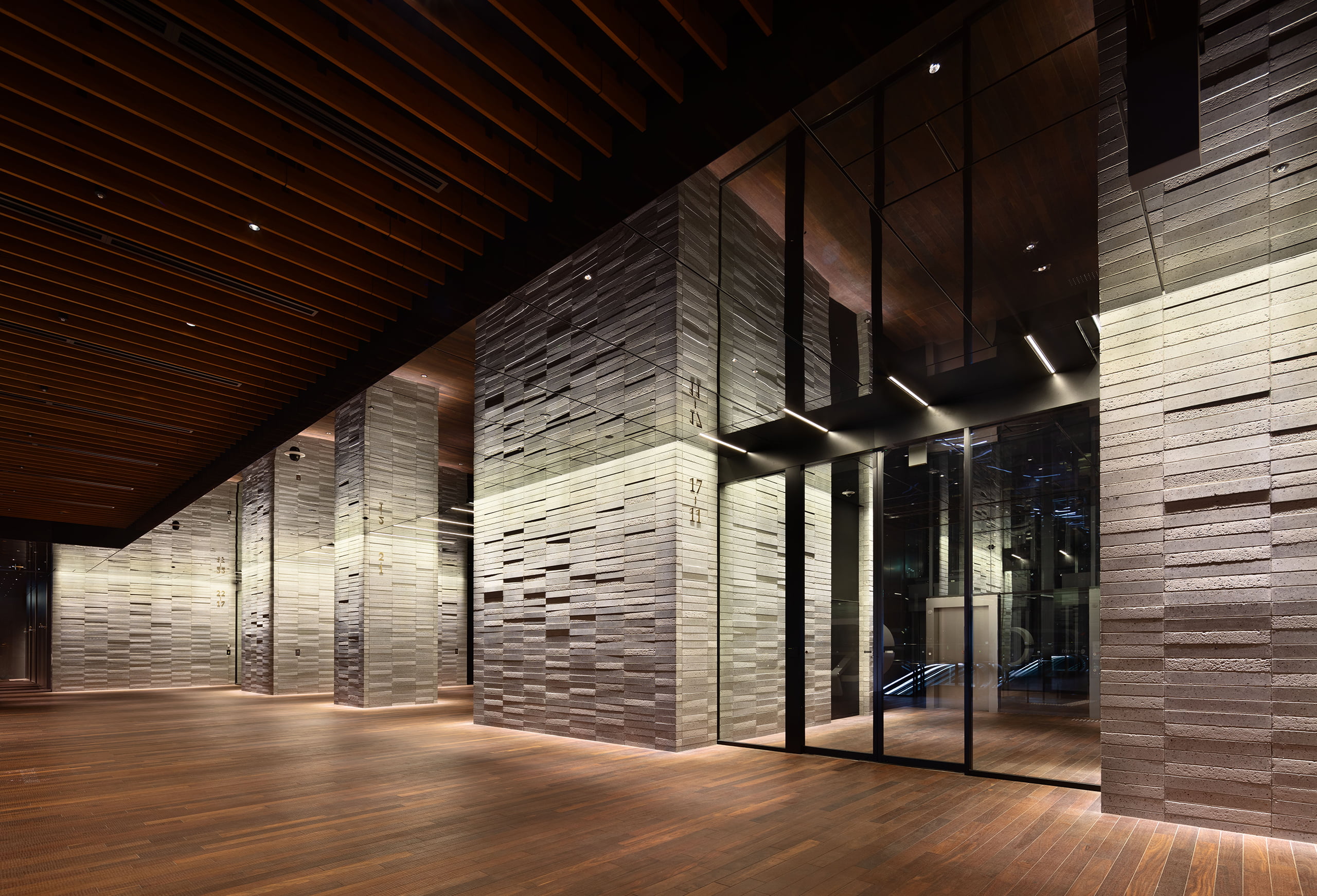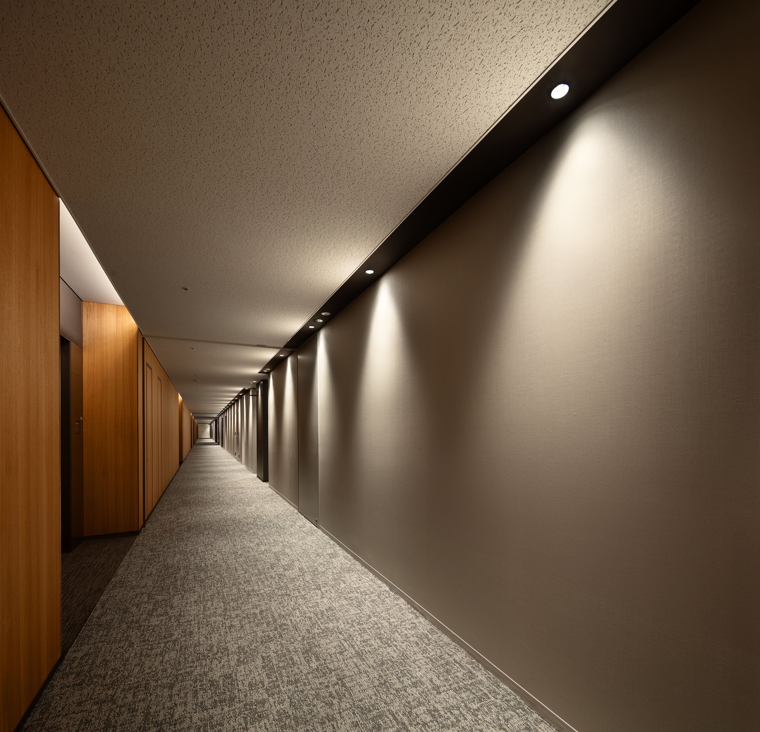 建物の特徴である超スレンダーボリュームを際立たせるため、「フィン照明」を採用。