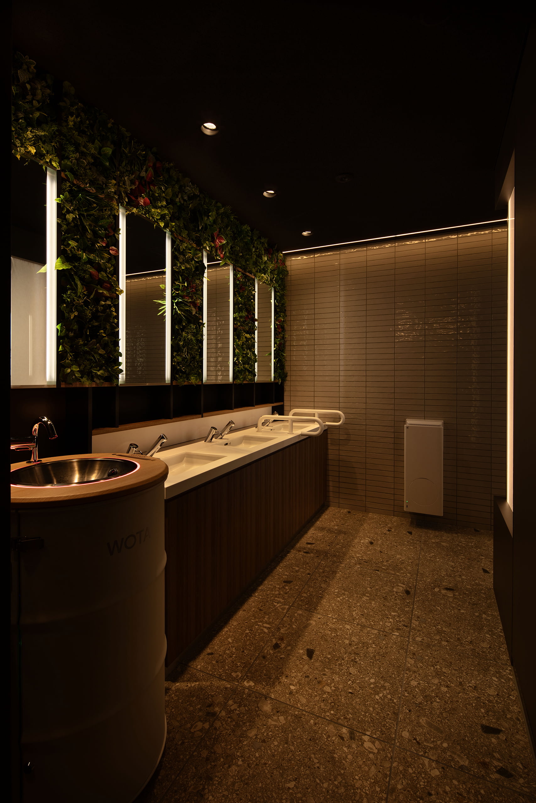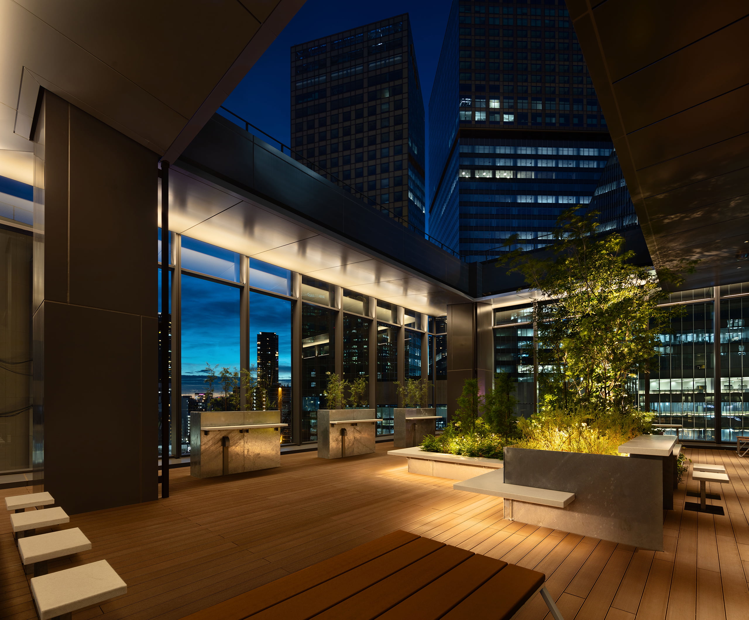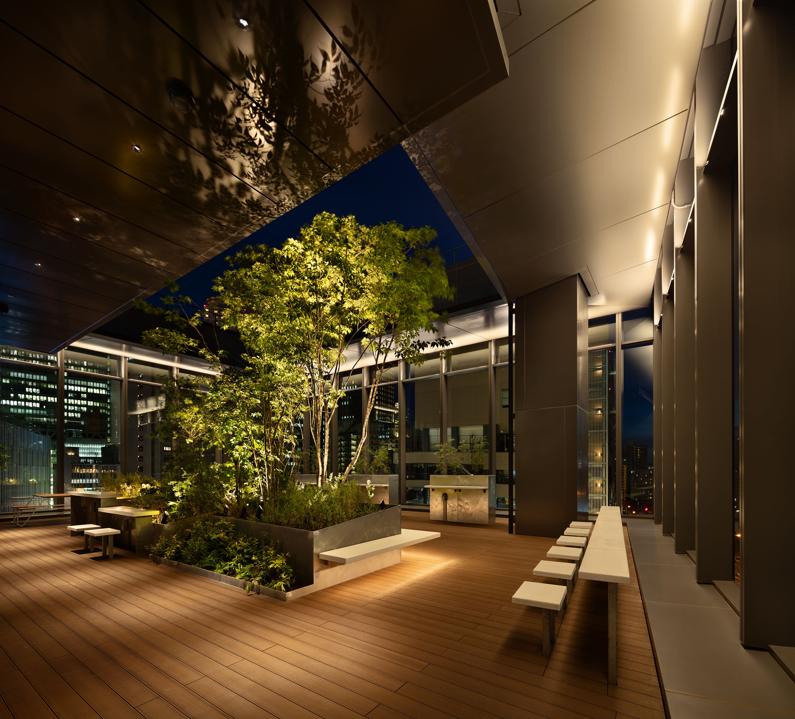 また、低層の飲食フロアでは、内部の賑わいを街へとつなぐライティングデザインを採用。「光の暖簾」による柔らかな光が、訪れる人々を温かく迎え入れている。