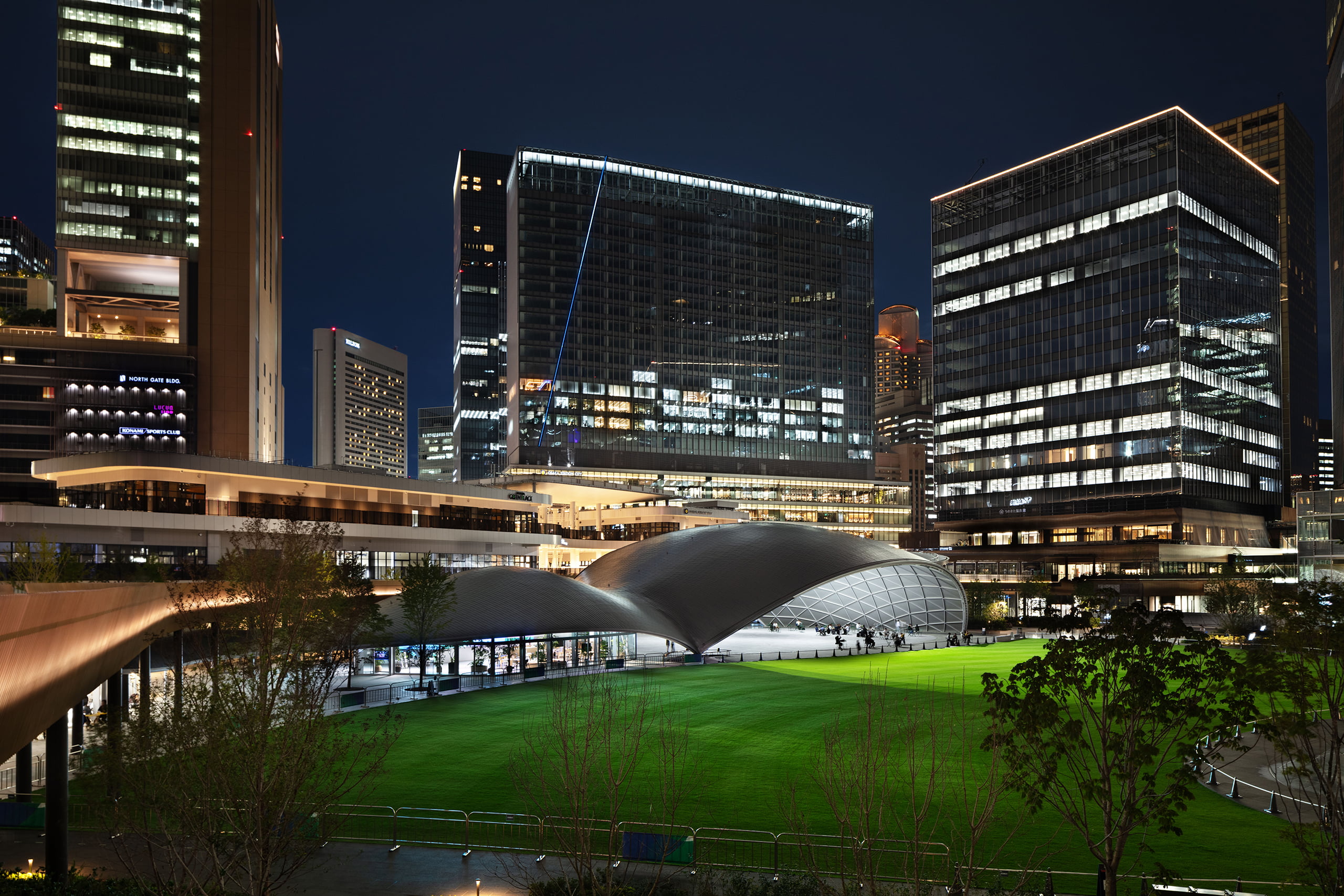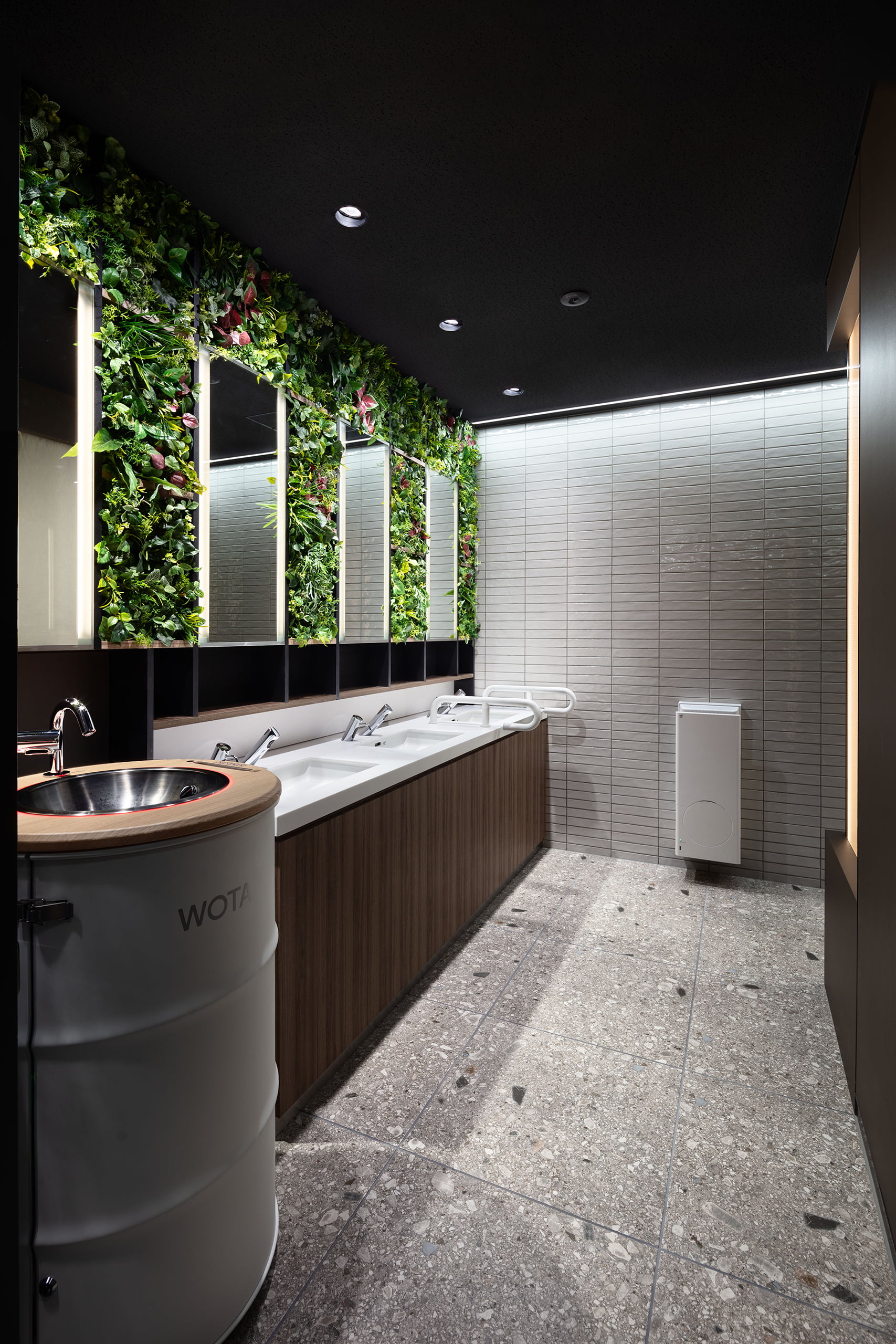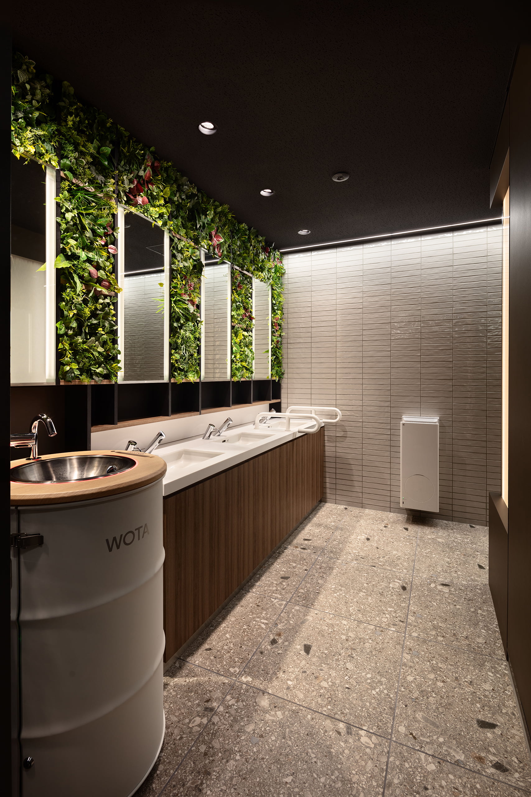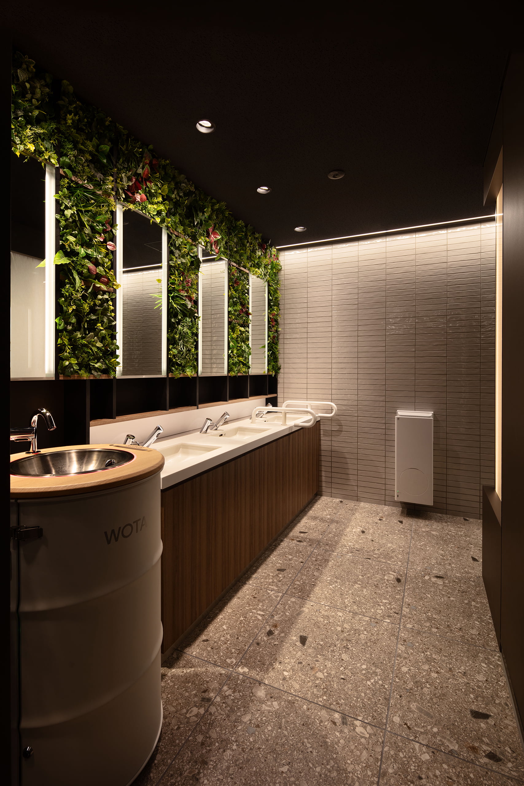 また、低層の飲食フロアでは、内部の賑わいを街へとつなぐライティングデザインを採用。「光の暖簾」による柔らかな光が、訪れる人々を温かく迎え入れている。