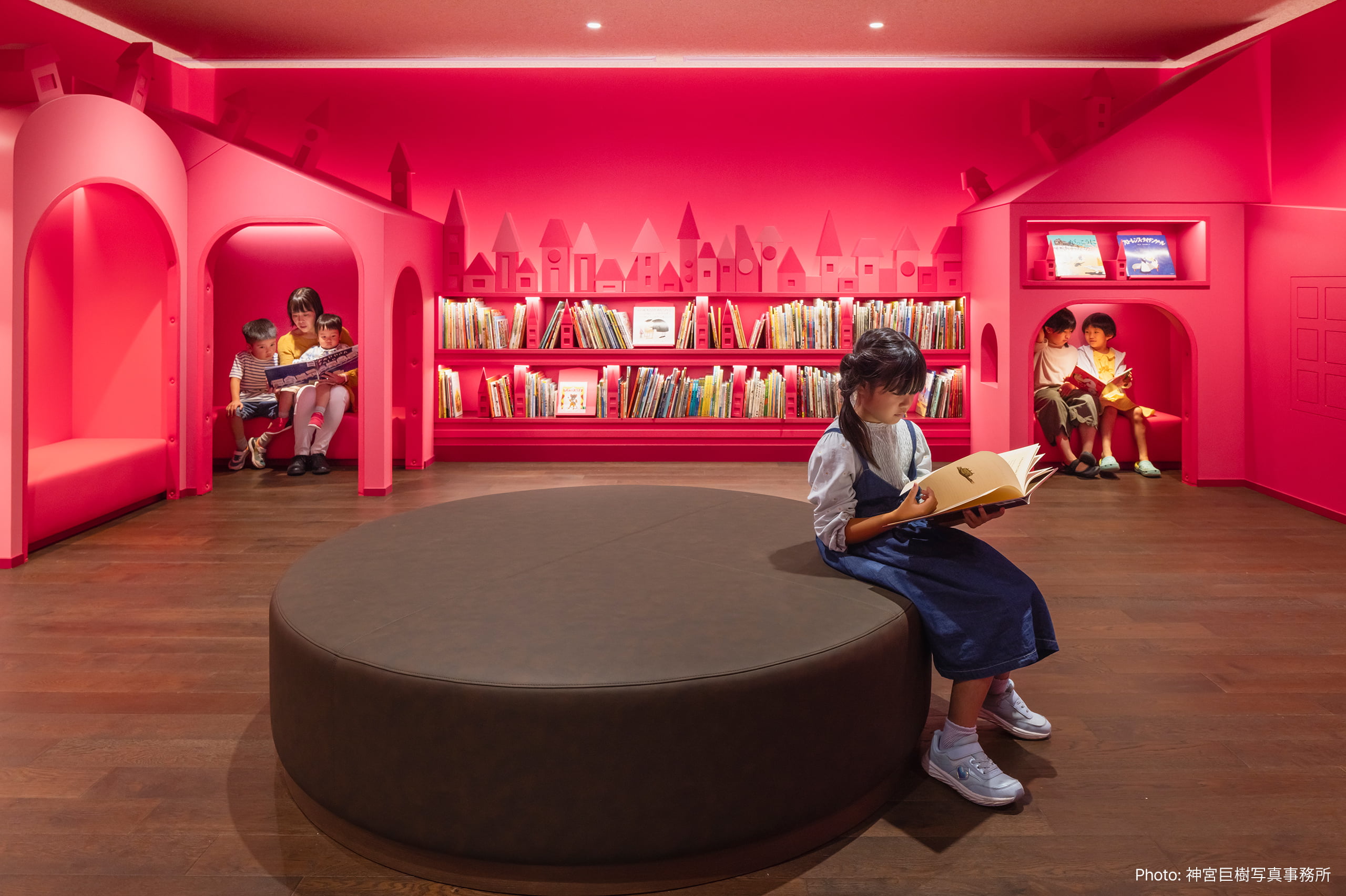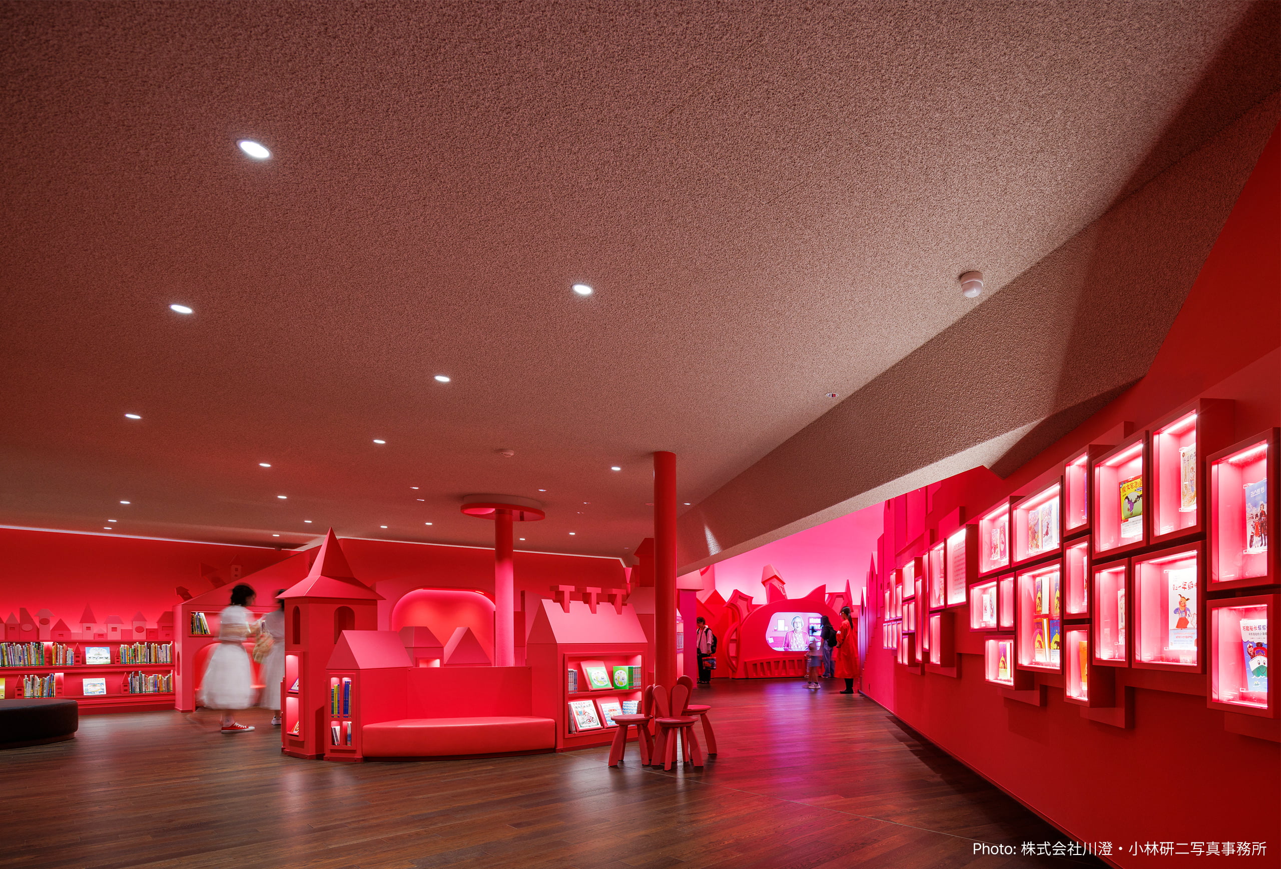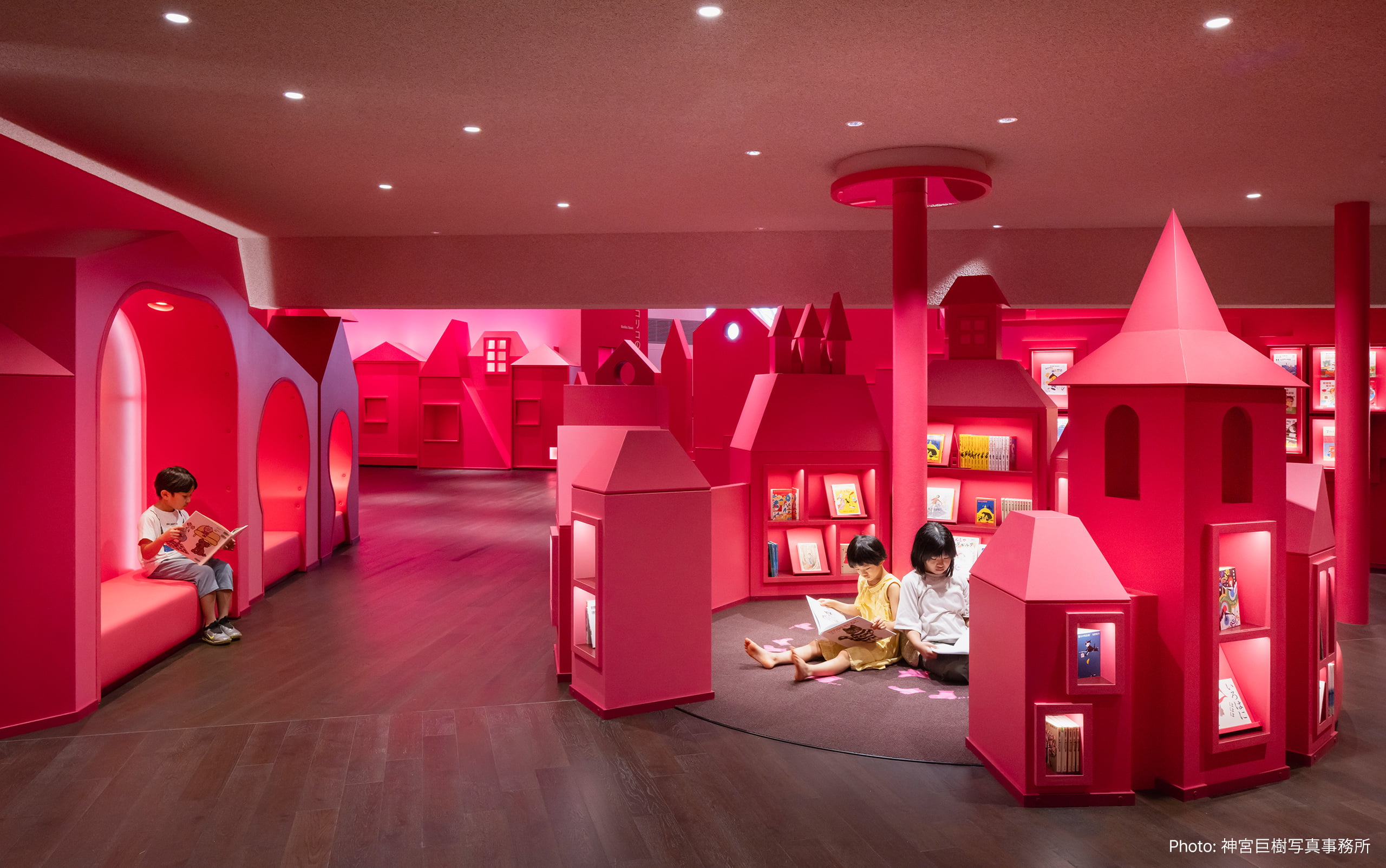 なぎさ公園の丘に建つ、角野栄子さんの作品と功績を多くの方々に知っていただくとともに、未来を担う子供たちが児童文学に親しみ、豊かな想像力を育む場となることを目指した児童文学館。展示スペースは、全体的にフラットに照らすのではなく、各所に光がたまる場所を作り、自分の気に入った光だまりの下で本を読めるよう照明を計画した。家の窓を思わせる本棚の照明は、家の窓から漏れる明かりを連想させる柔らかい間接照明で照射。