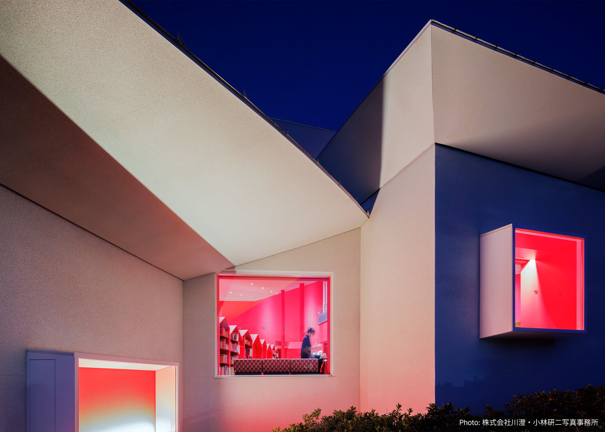外観は建築の開口部や疑似的な窓に対して間接照明を設置し、家の窓から漏れる光の柔らかさを表現している。丘の上に立つ白い建築と黄昏時の青い空。そして建築の窓から漏れるイチゴ色を乗せた光が混ざり合い、温かく美しい風景を作り出している。
