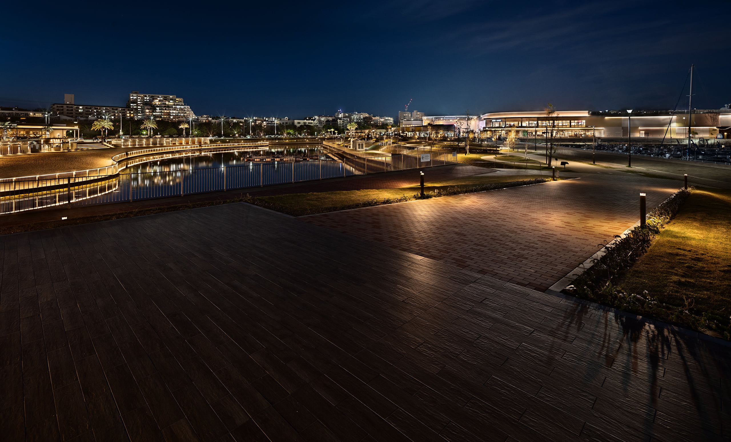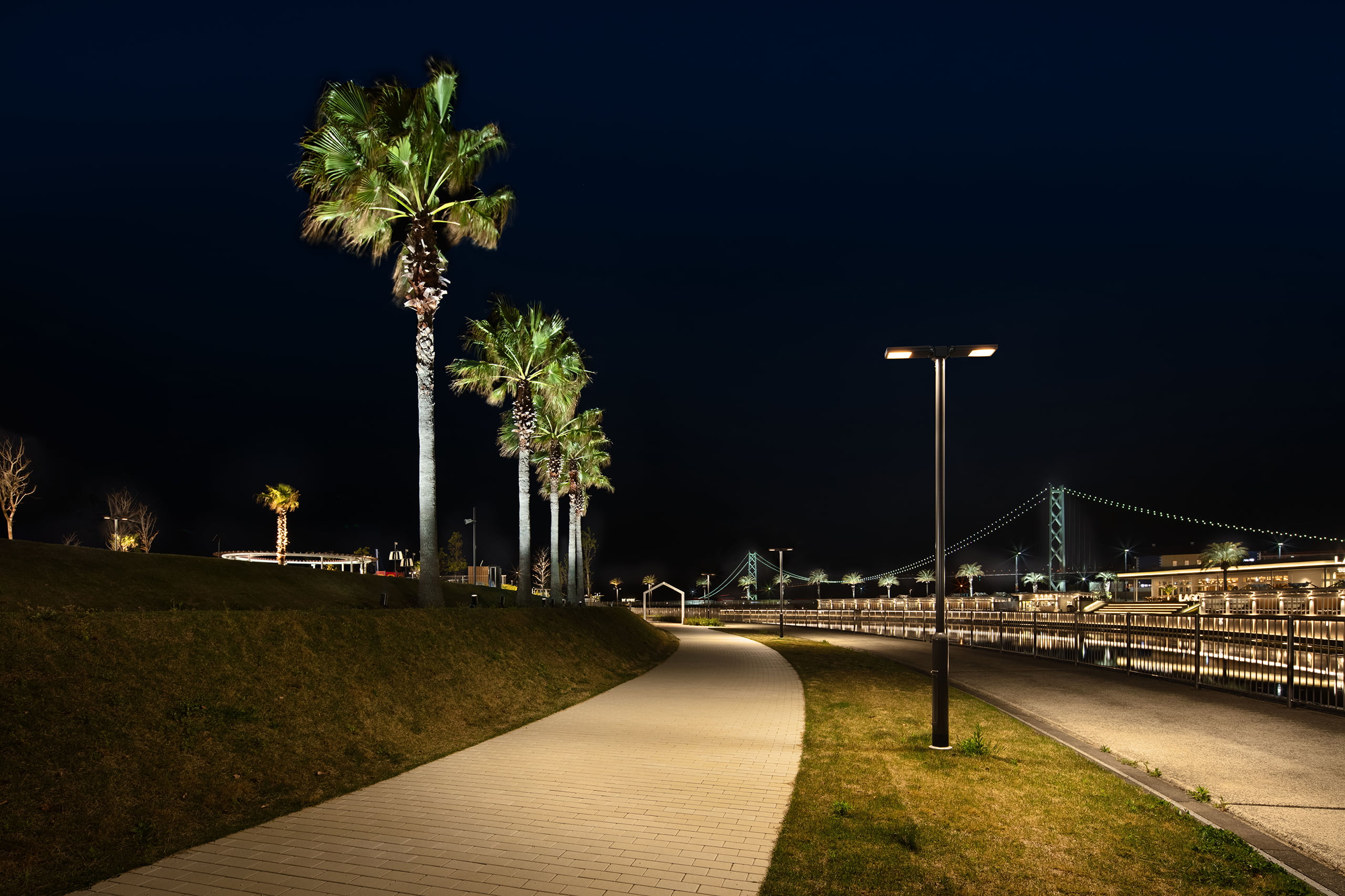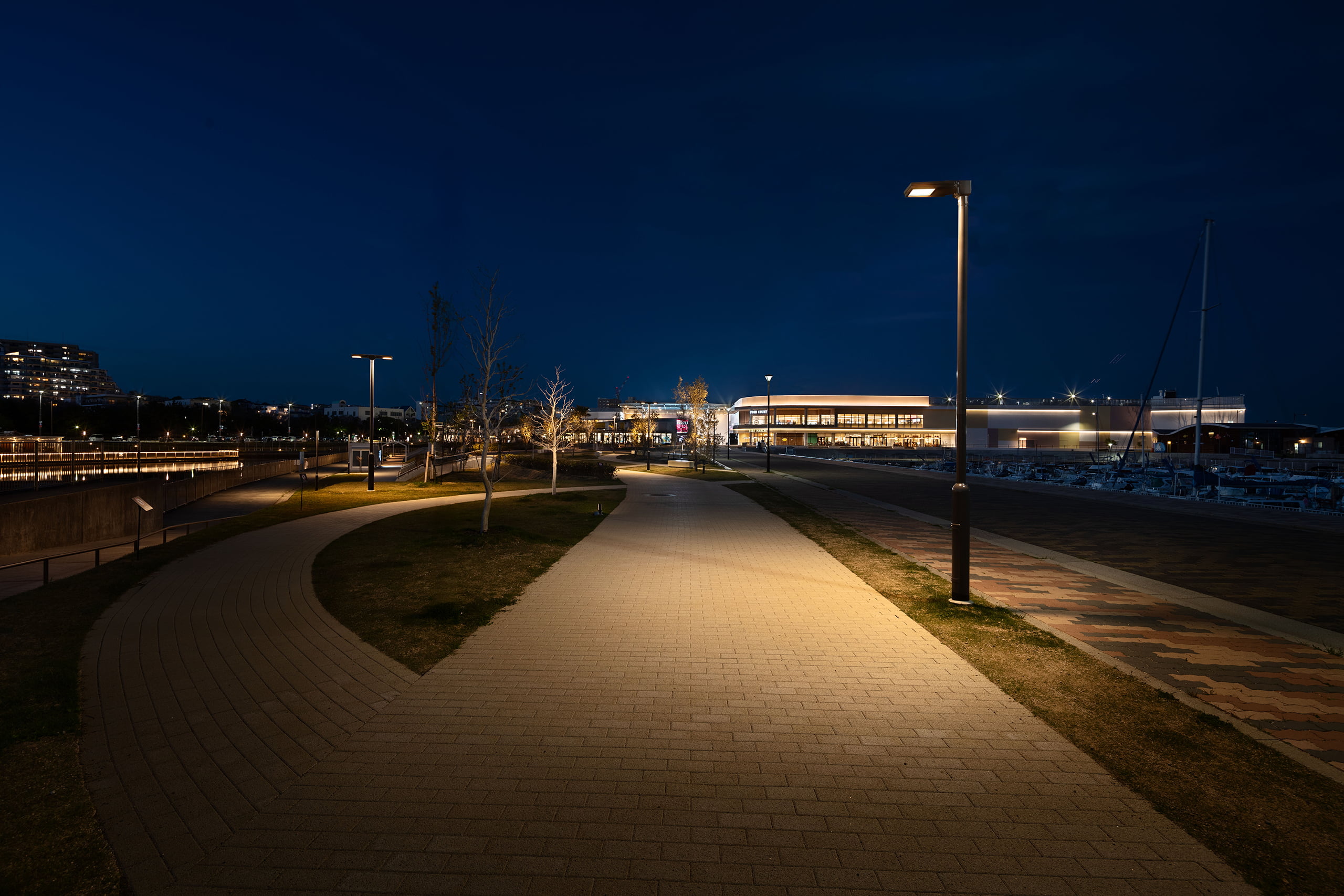 照明計画としては、パーク内の安全・安心した照度確保と、景観を損なわないための下方配光エリアポールと、全拡散光のミドルポールを連続配置にする事で、対岸からのアイキャッチとするライティングを提案。