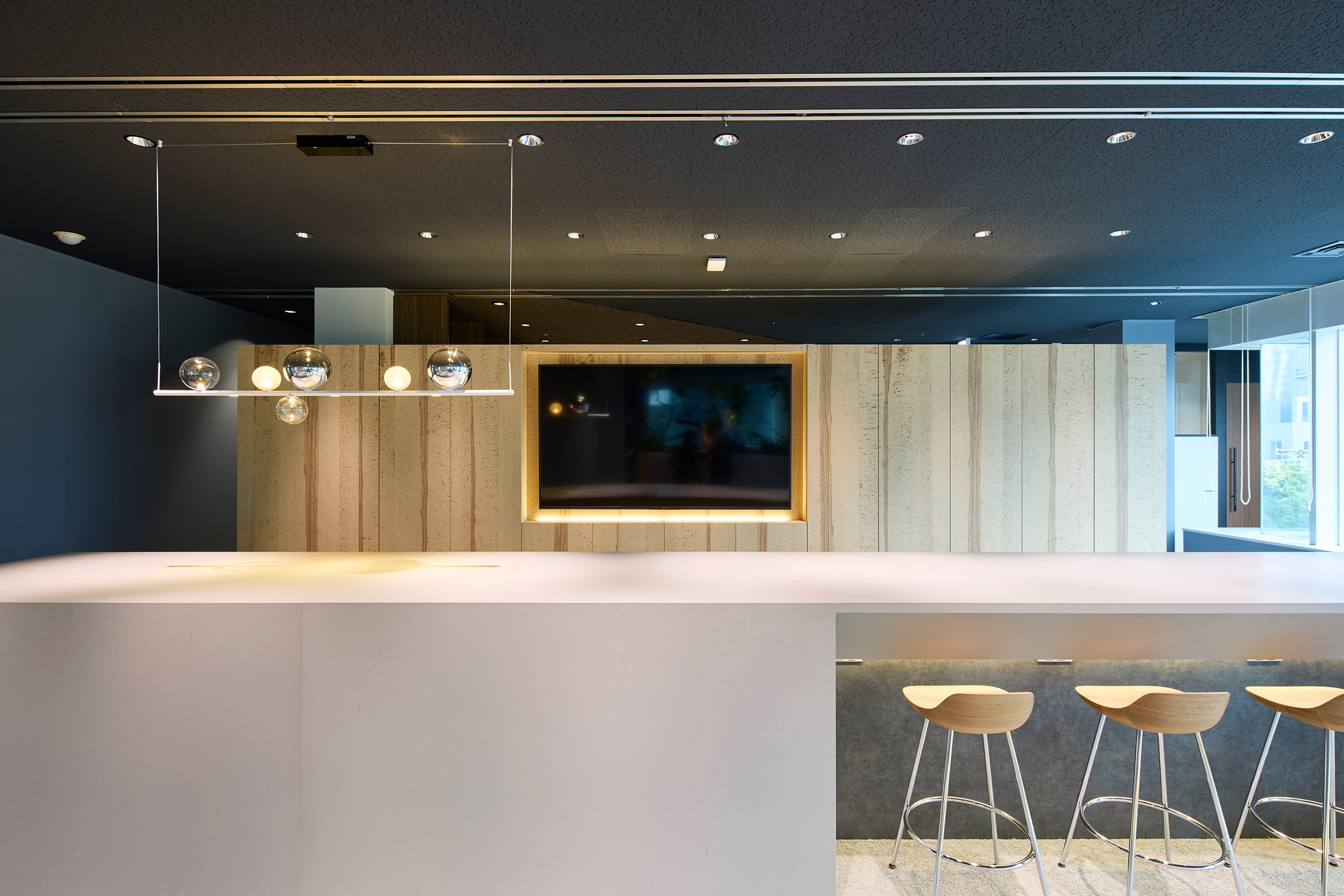 カウンターや造作ソファなどのインテリアや素材感を効果的に魅せています。