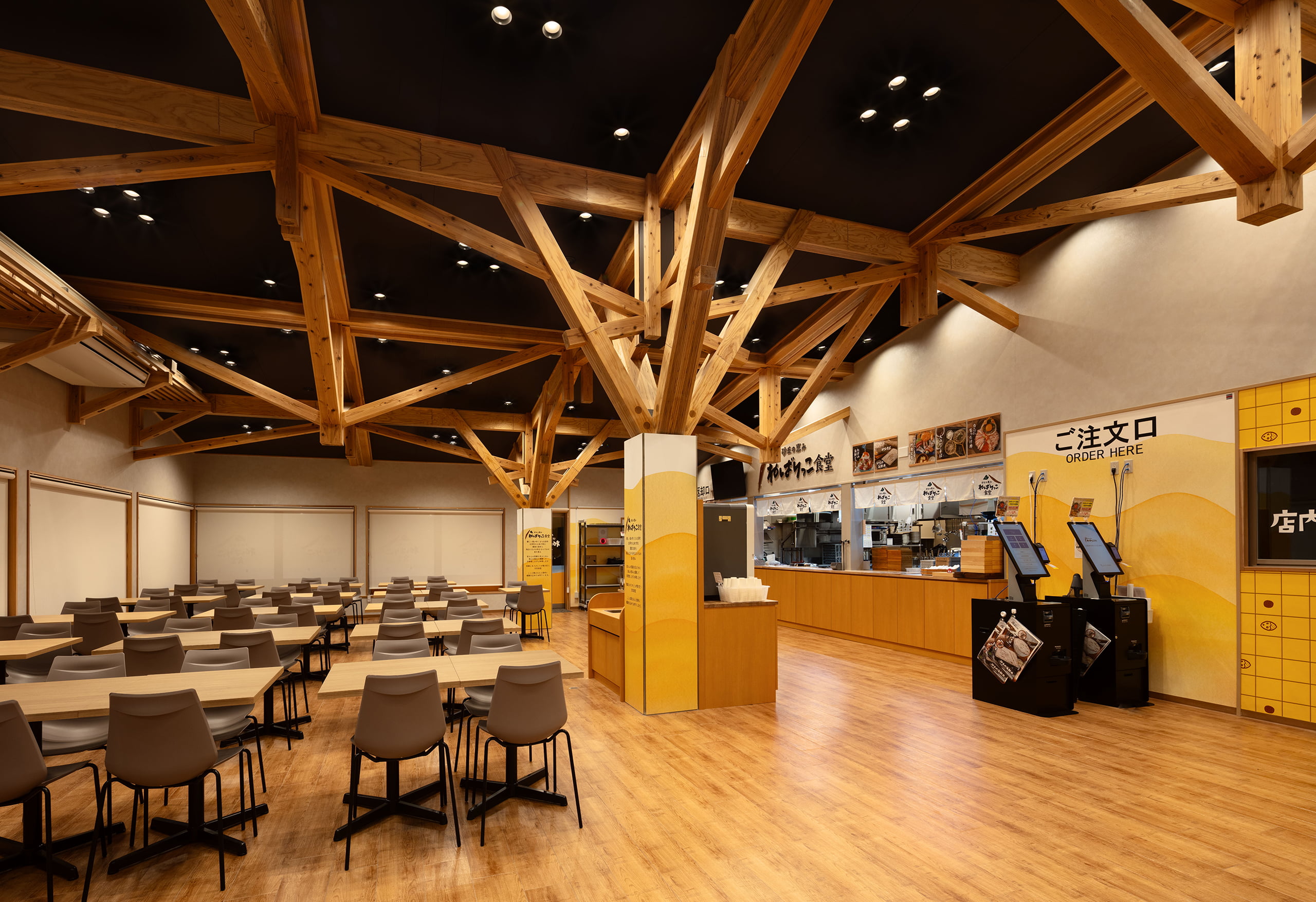 照明はそれぞれのエリアの照度は確保しながらも外観からの統一感を感じられるような色温度になるように工夫し、木材の美しさが引き立つような配灯にしました。