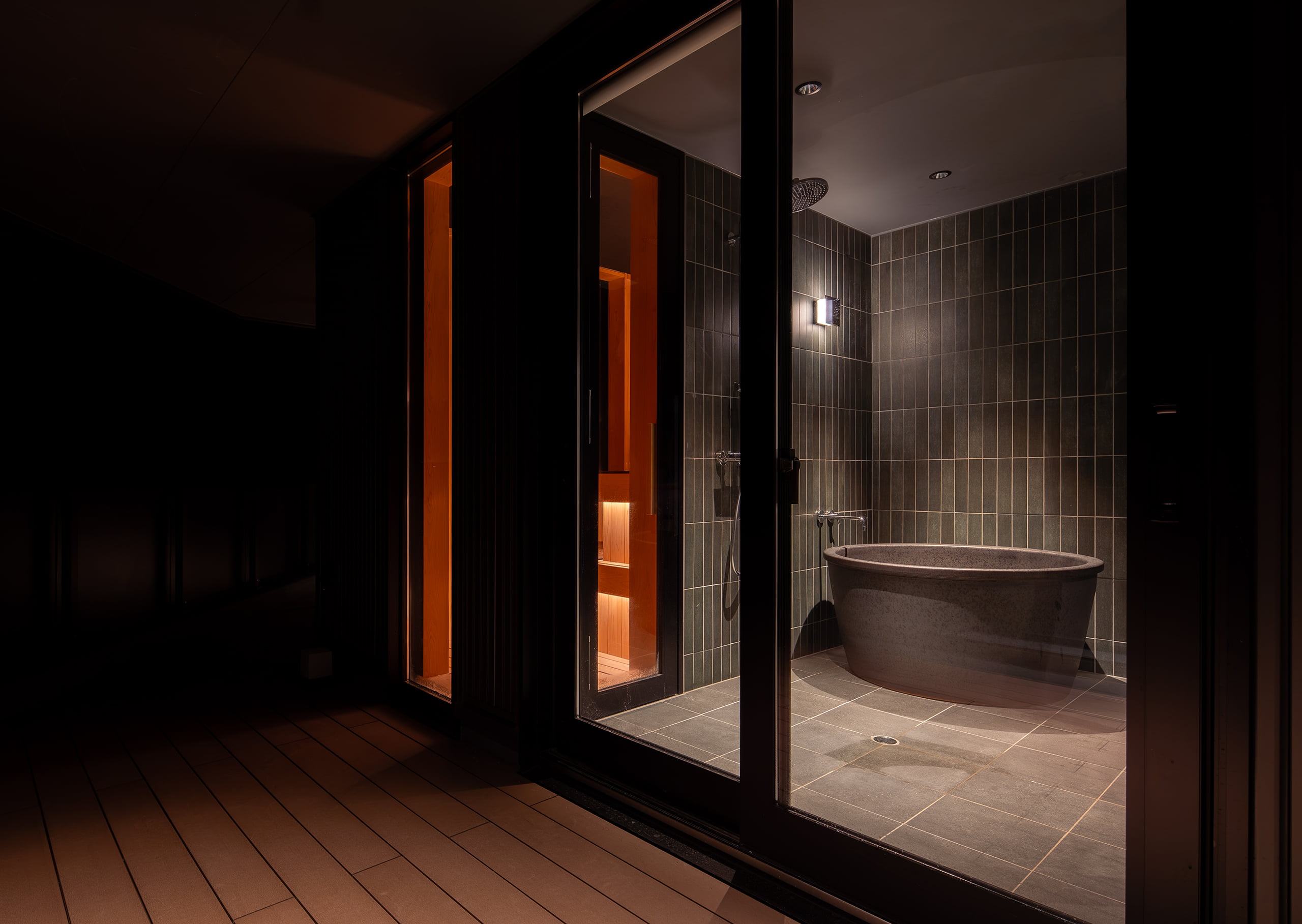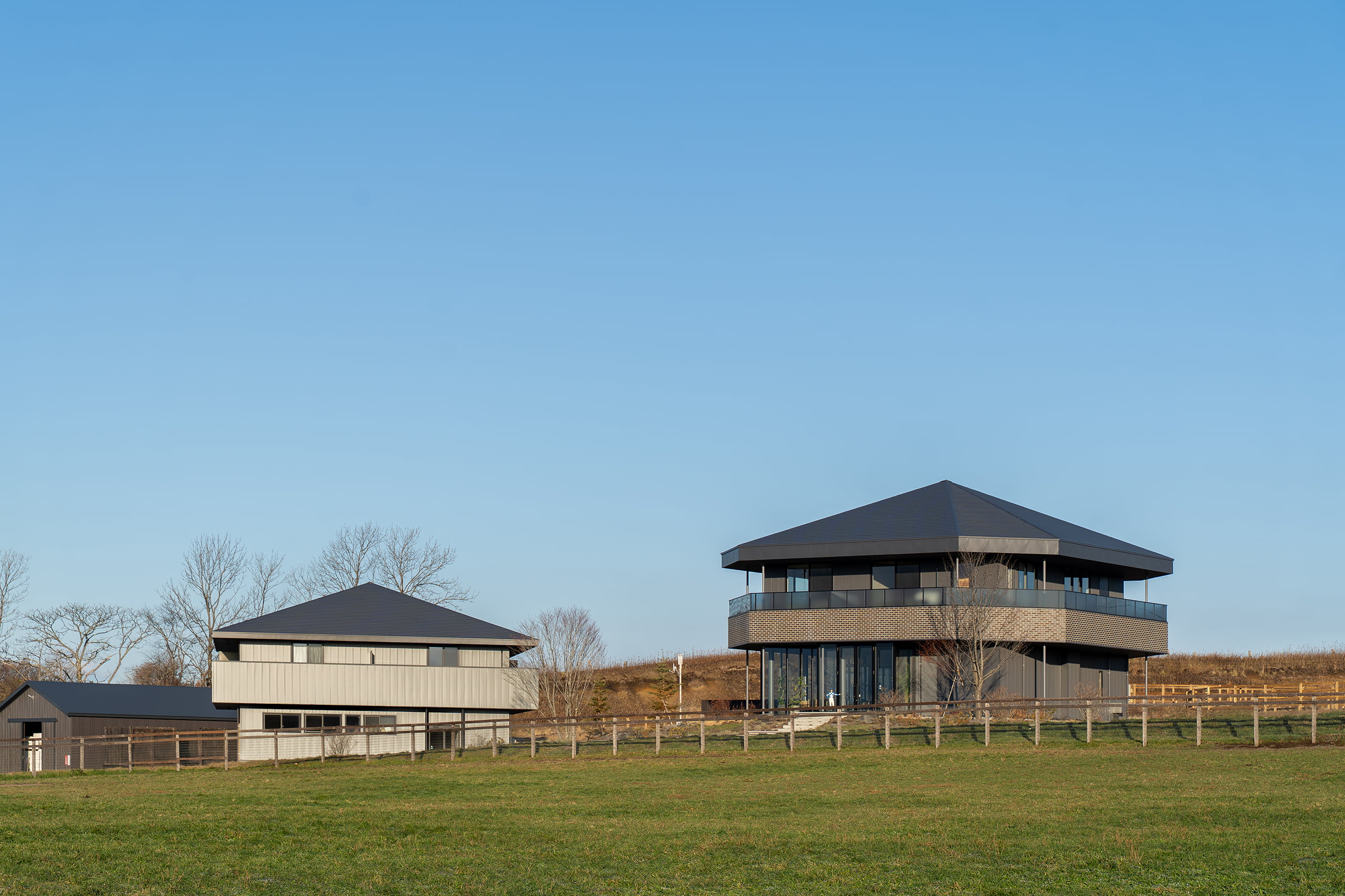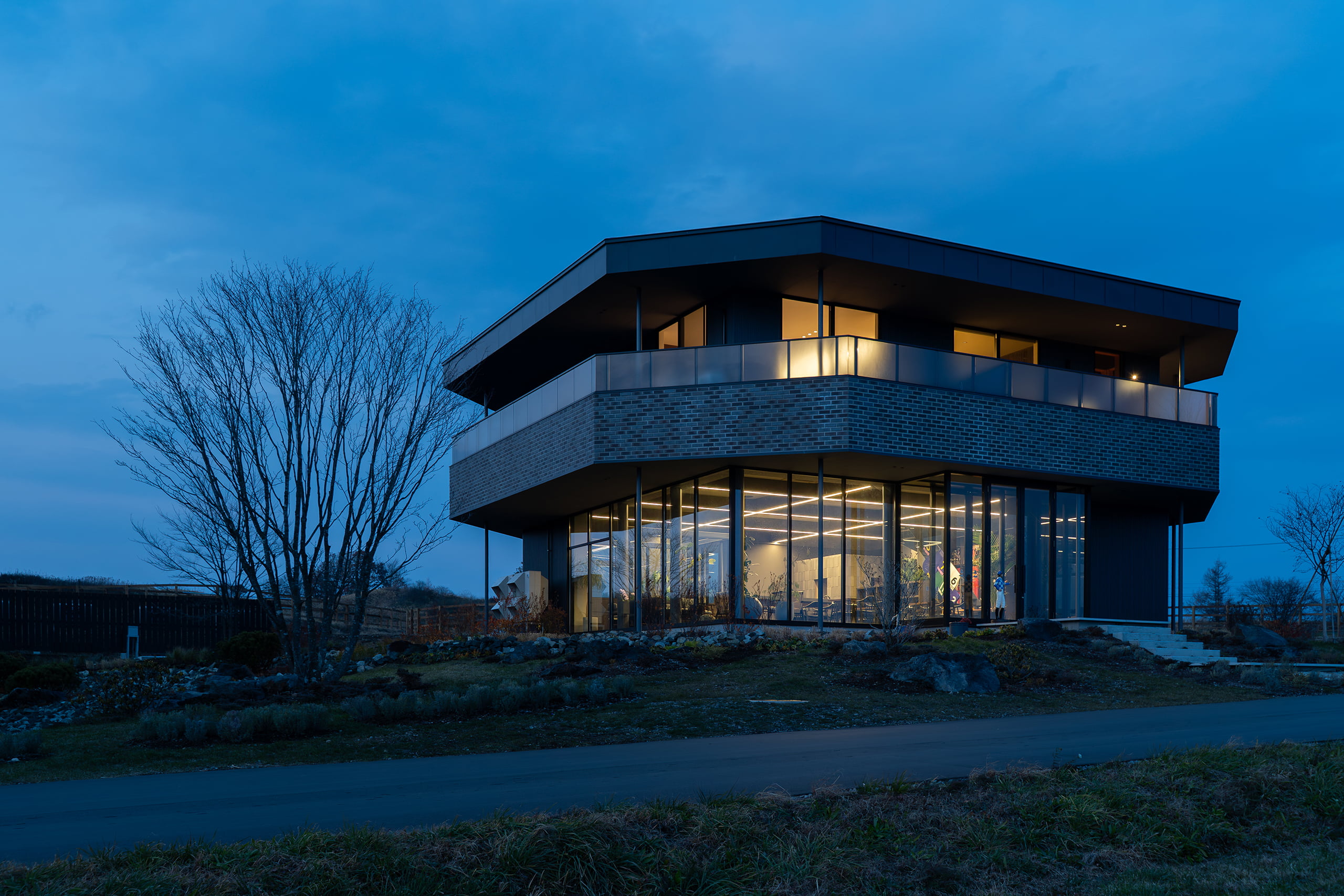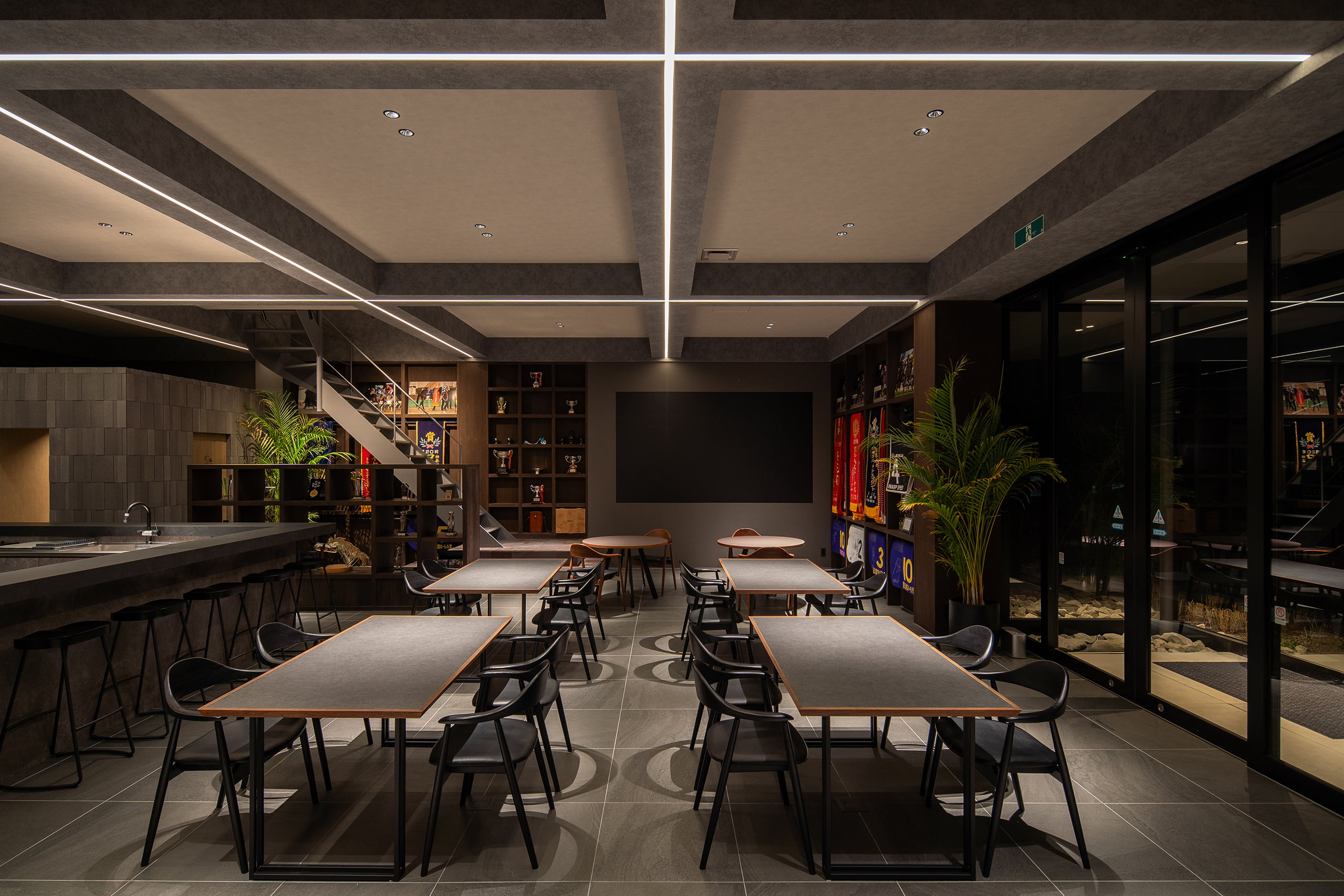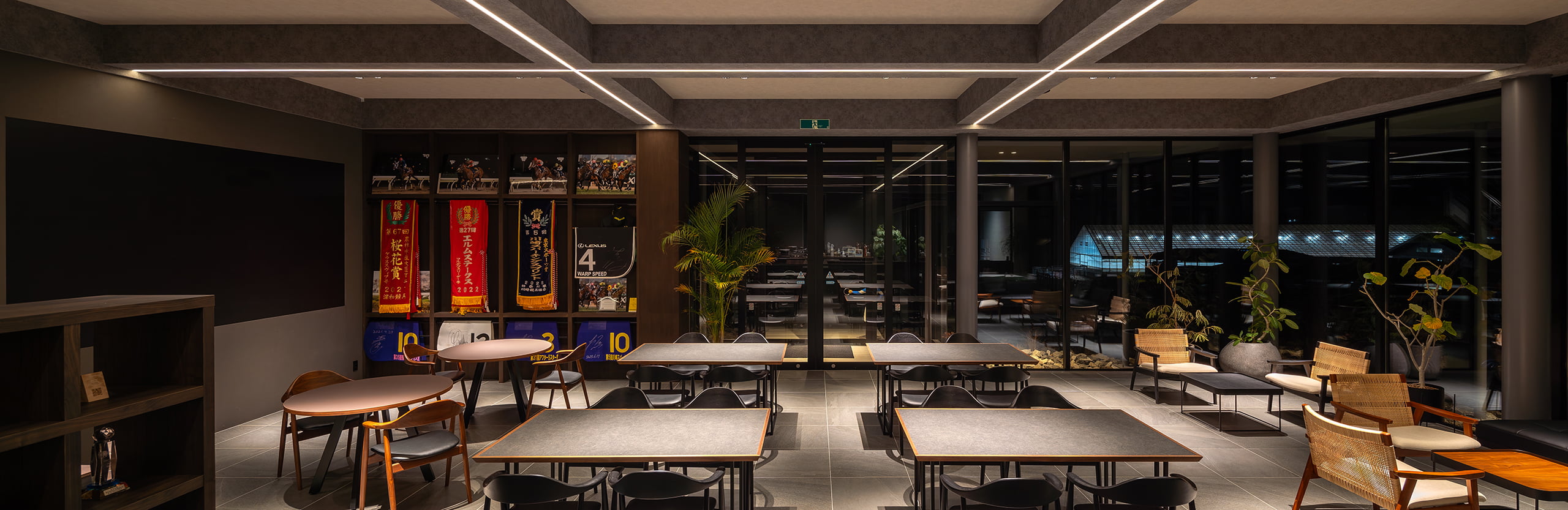 ダークグレーを基調とした落ち着きのあるインテリアに対し、光のラインを象徴的に配することで、競走馬を支える拠点にふさわしい「 心地よい緊張感 」と「 上質なリラックス 」を共存させました。