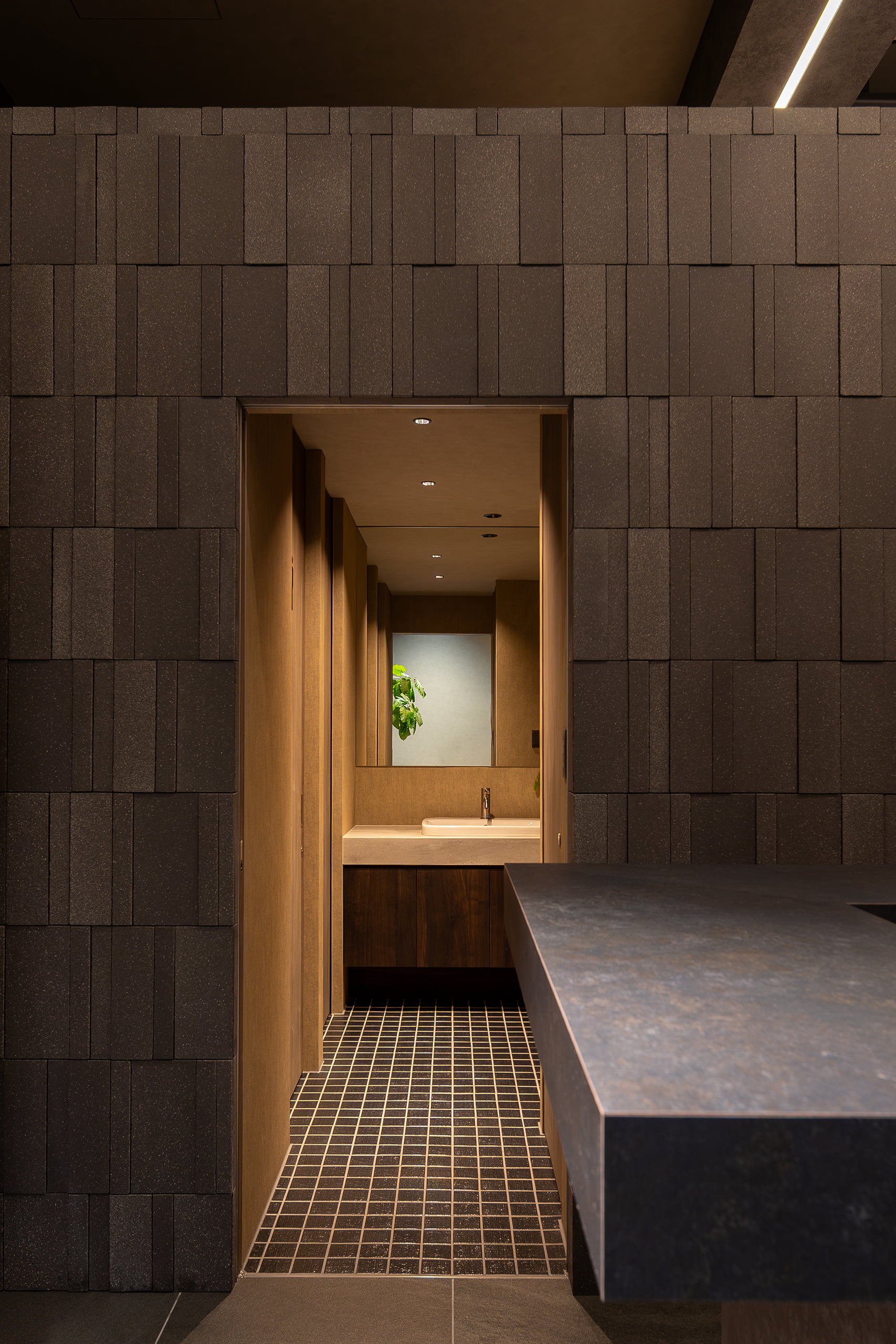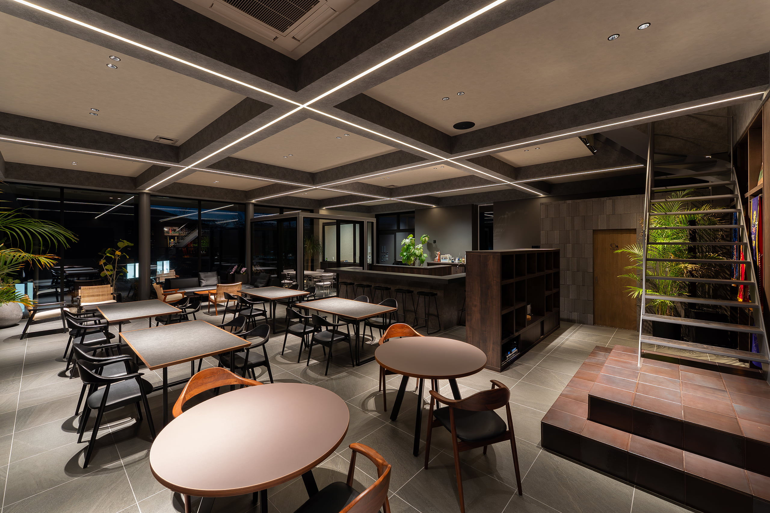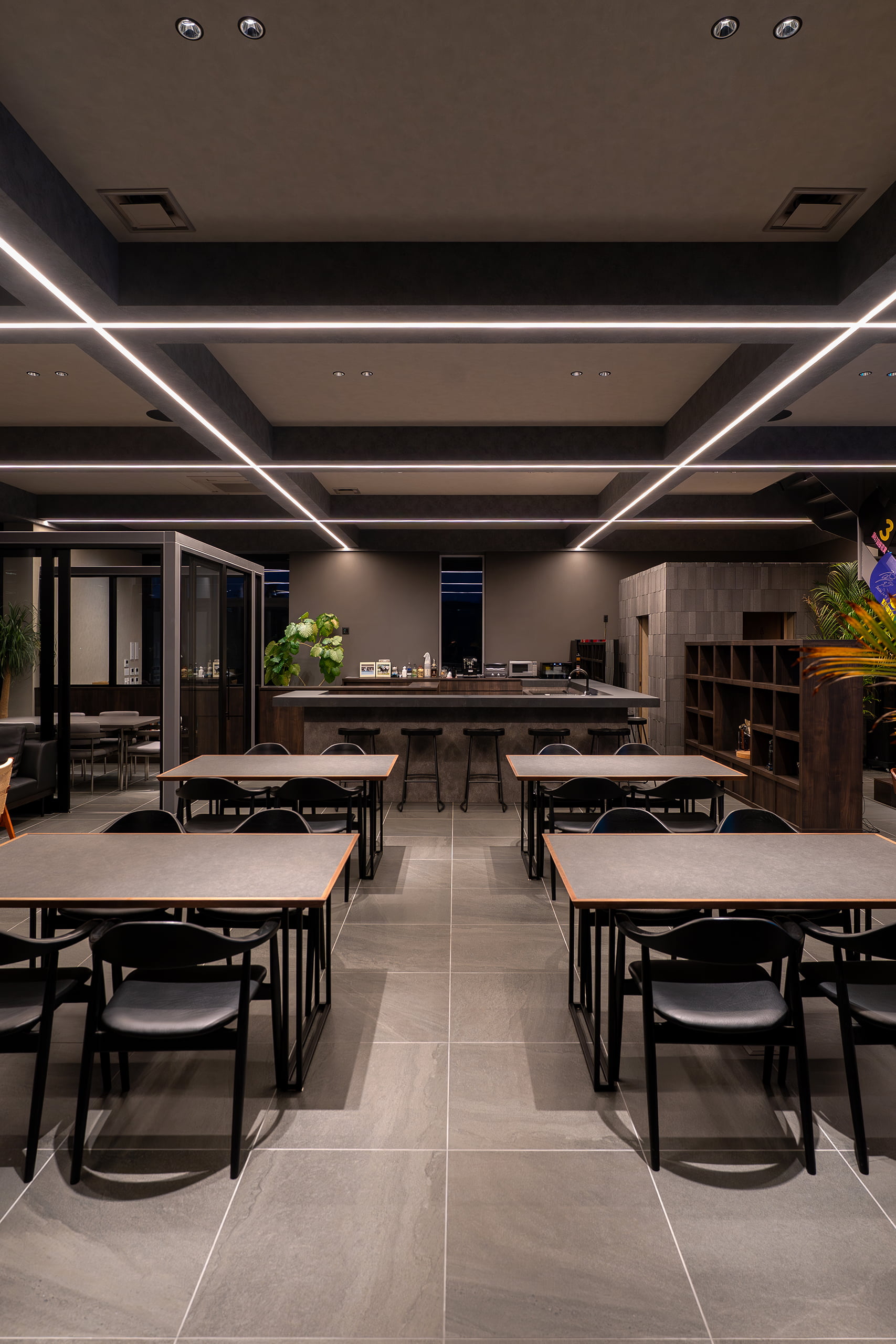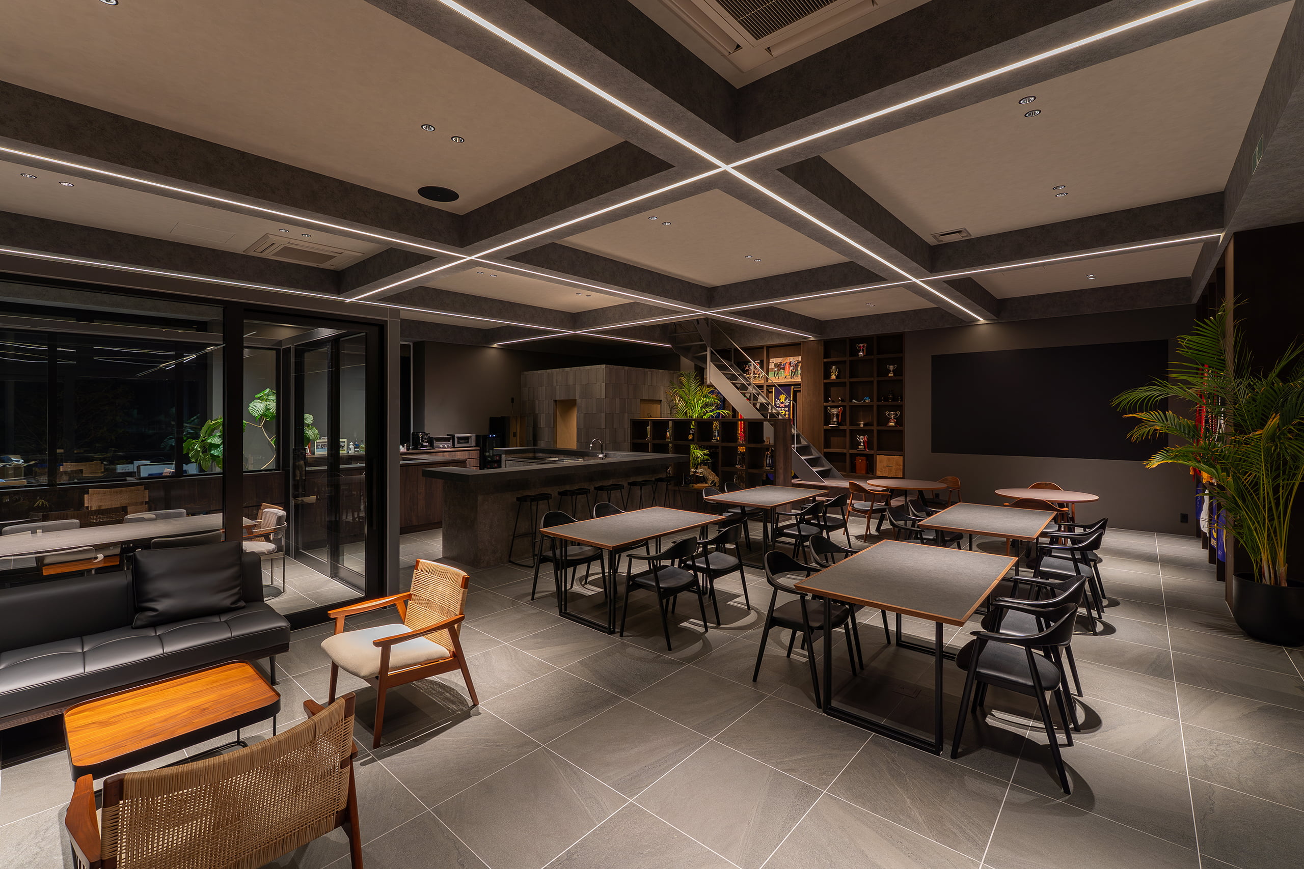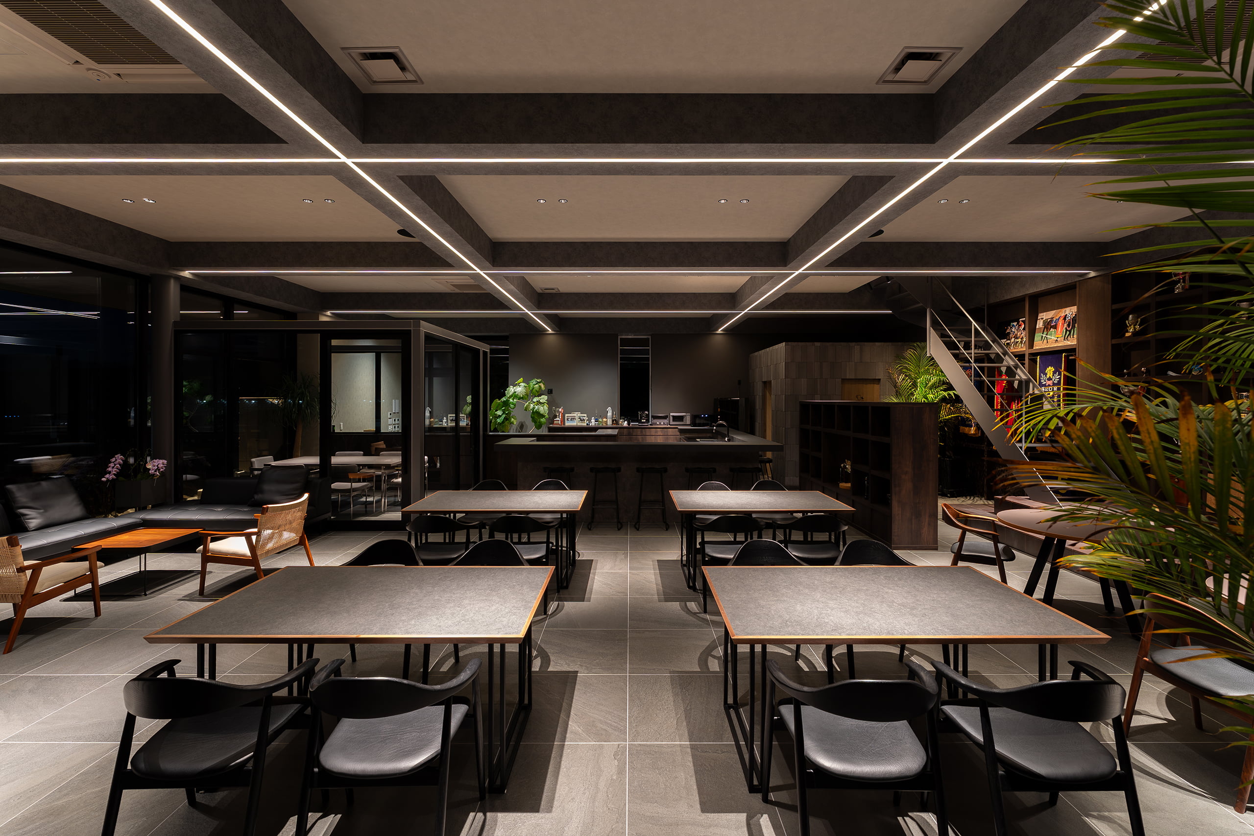 ラウンジは、天井の梁に沿って交差するシャープなライン照明が、空間全体に規律あるリズムと圧倒的な開放感を与えています。