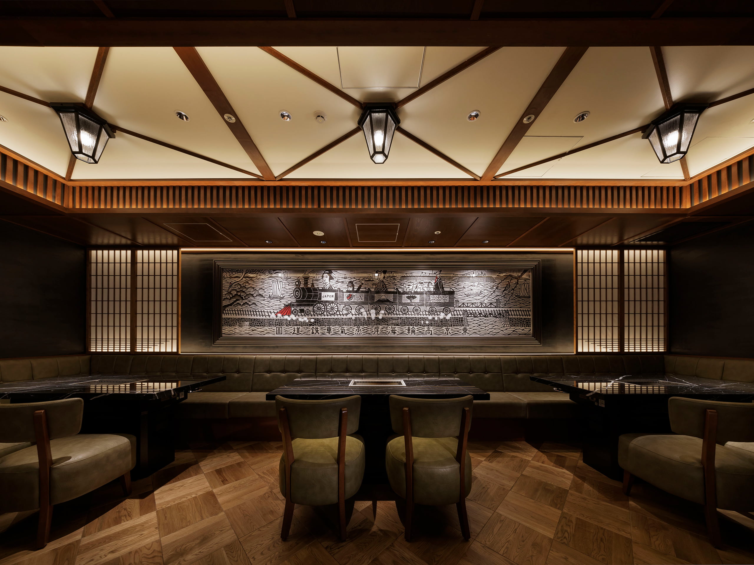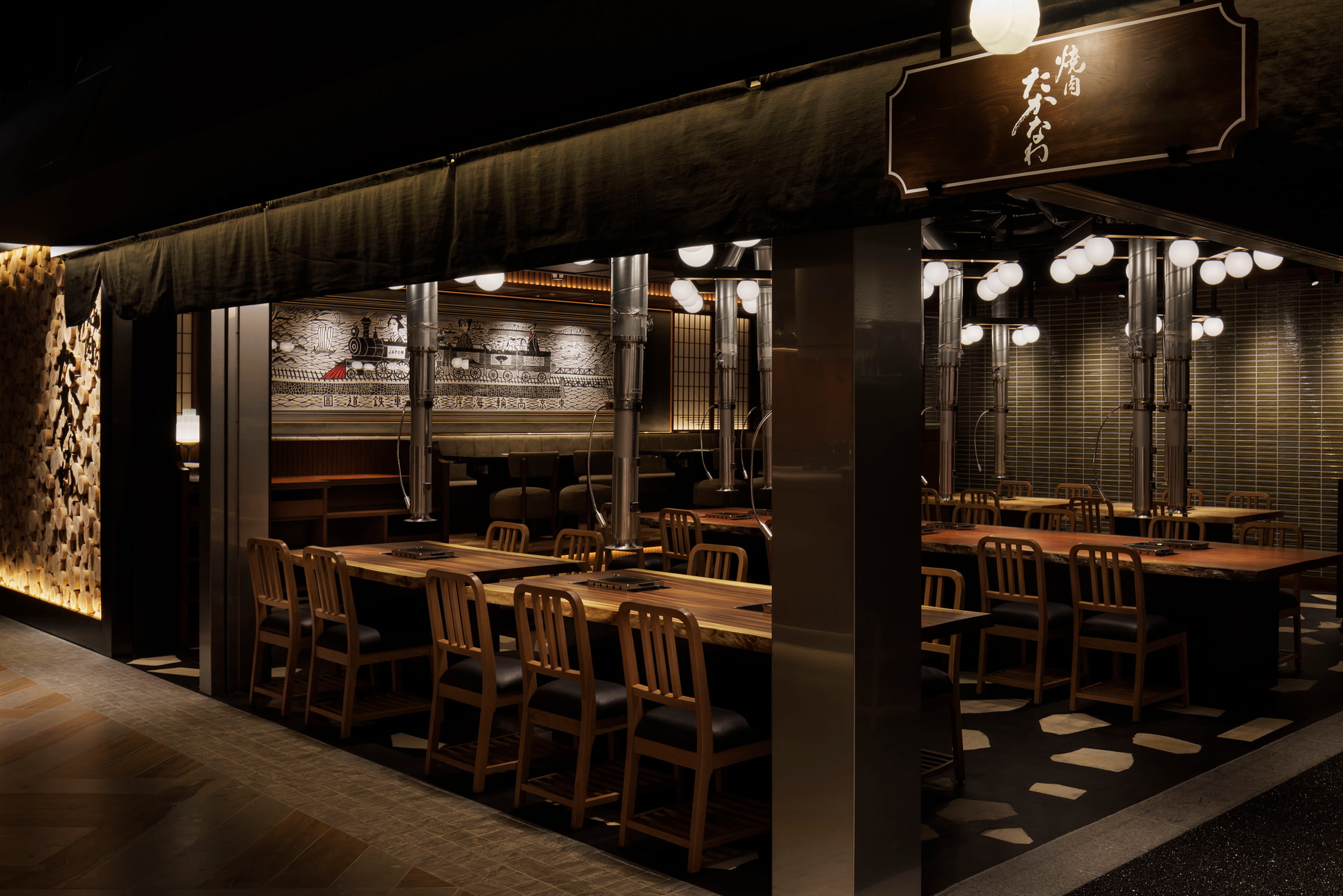 蕎麦、焼肉、スパニッシュイタリアン、カフェ、と異なる個性を持つ4つの飲食店が融合するこの空間で、照明制御の要として選ばれたのが無線制御システム〈 SENMU 〉でした。