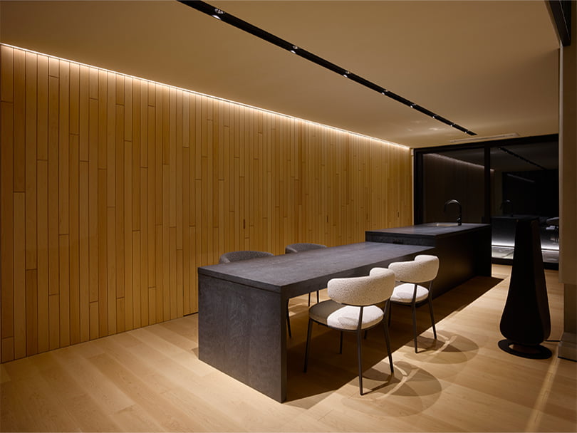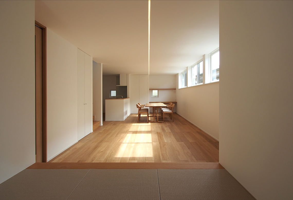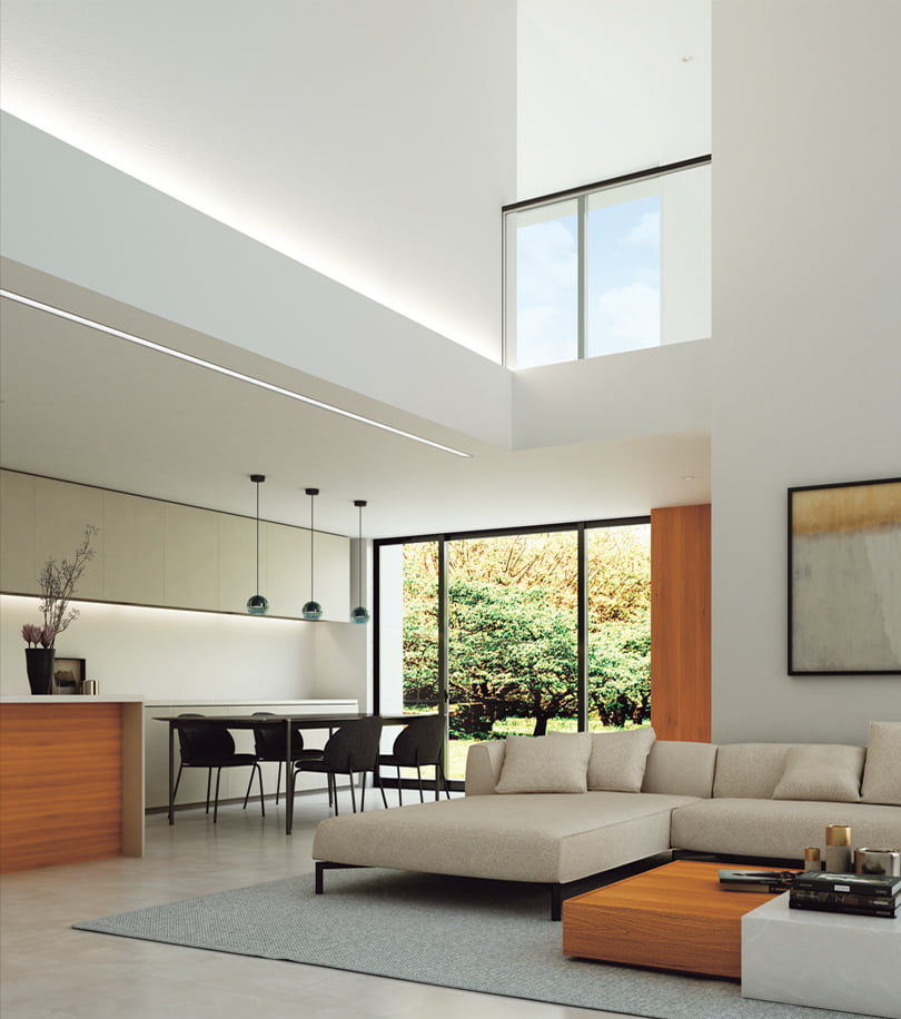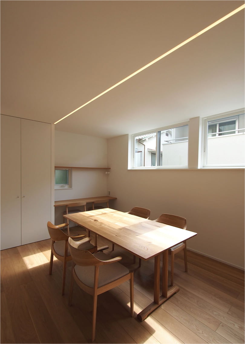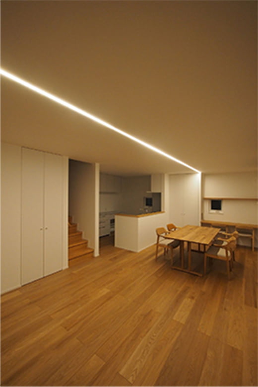 天井の中心にライン照明を通した計画は、潔くシンプルな印象をつくります。
