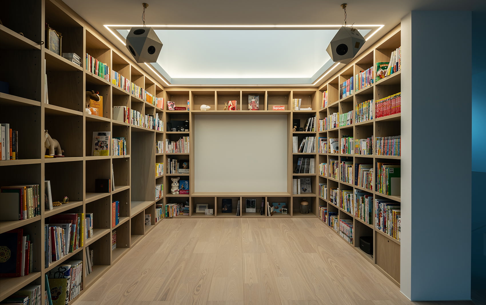 空間はシンプルで美しく、本の背表紙もきっちり照らされ、